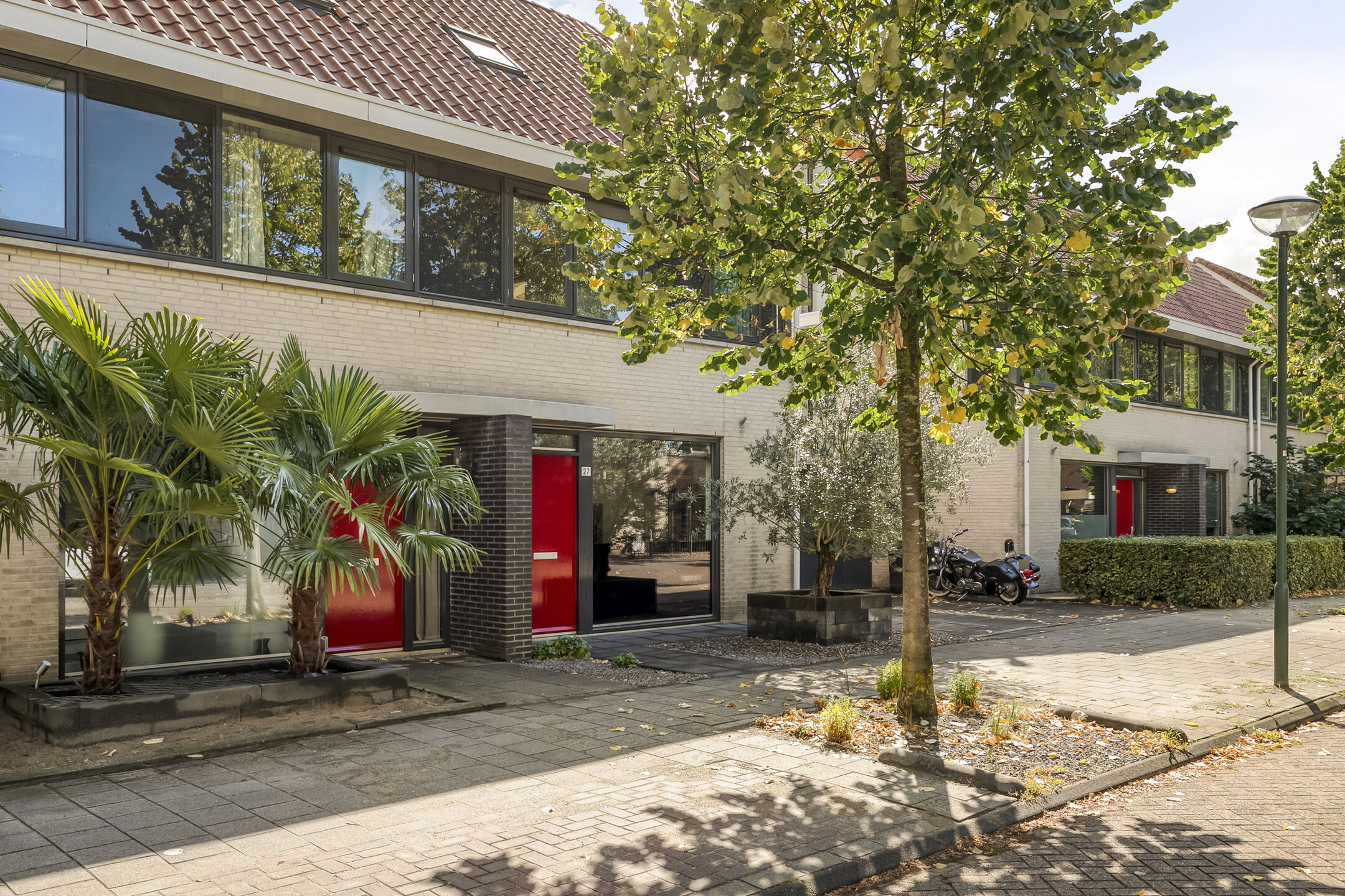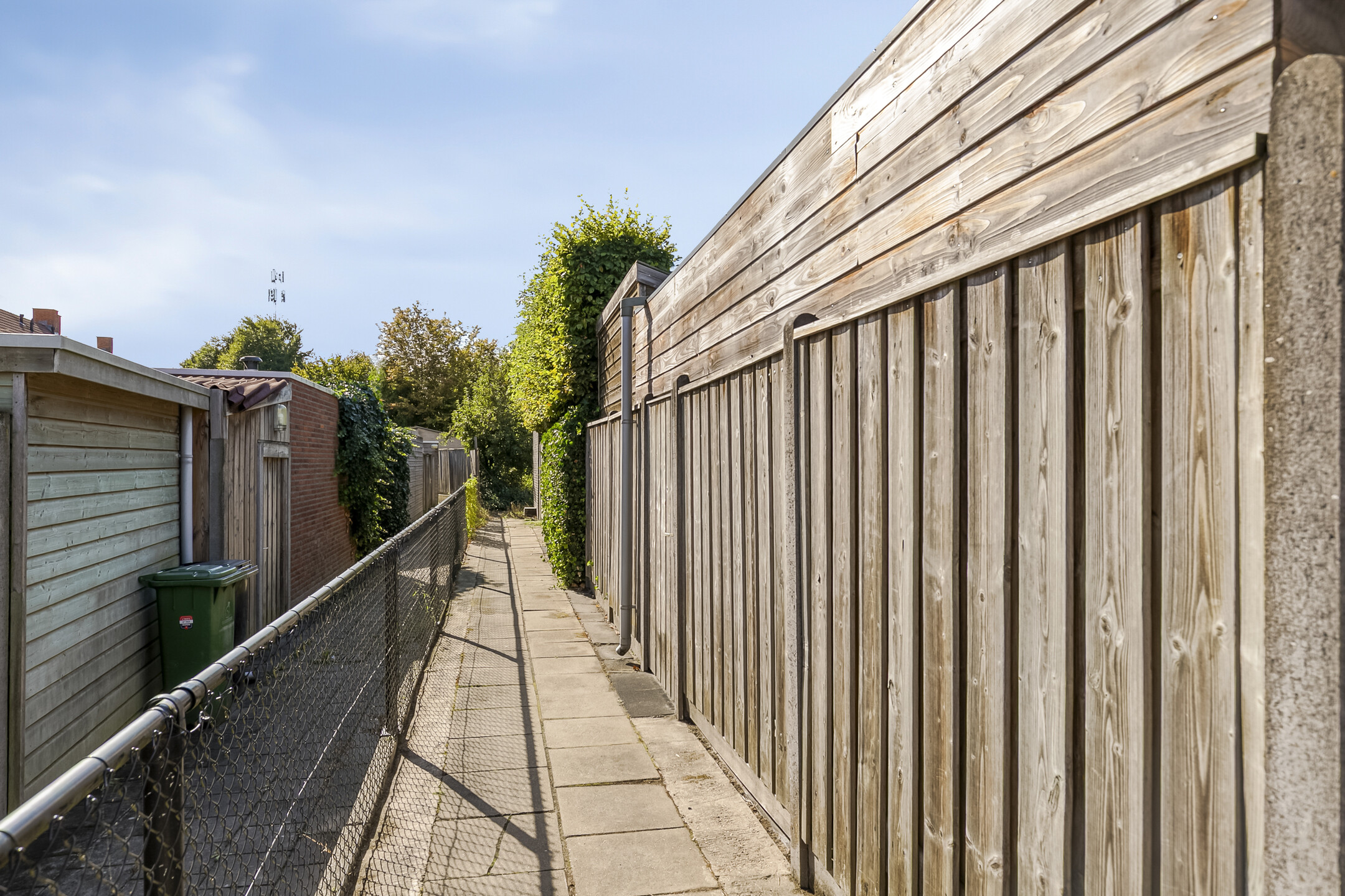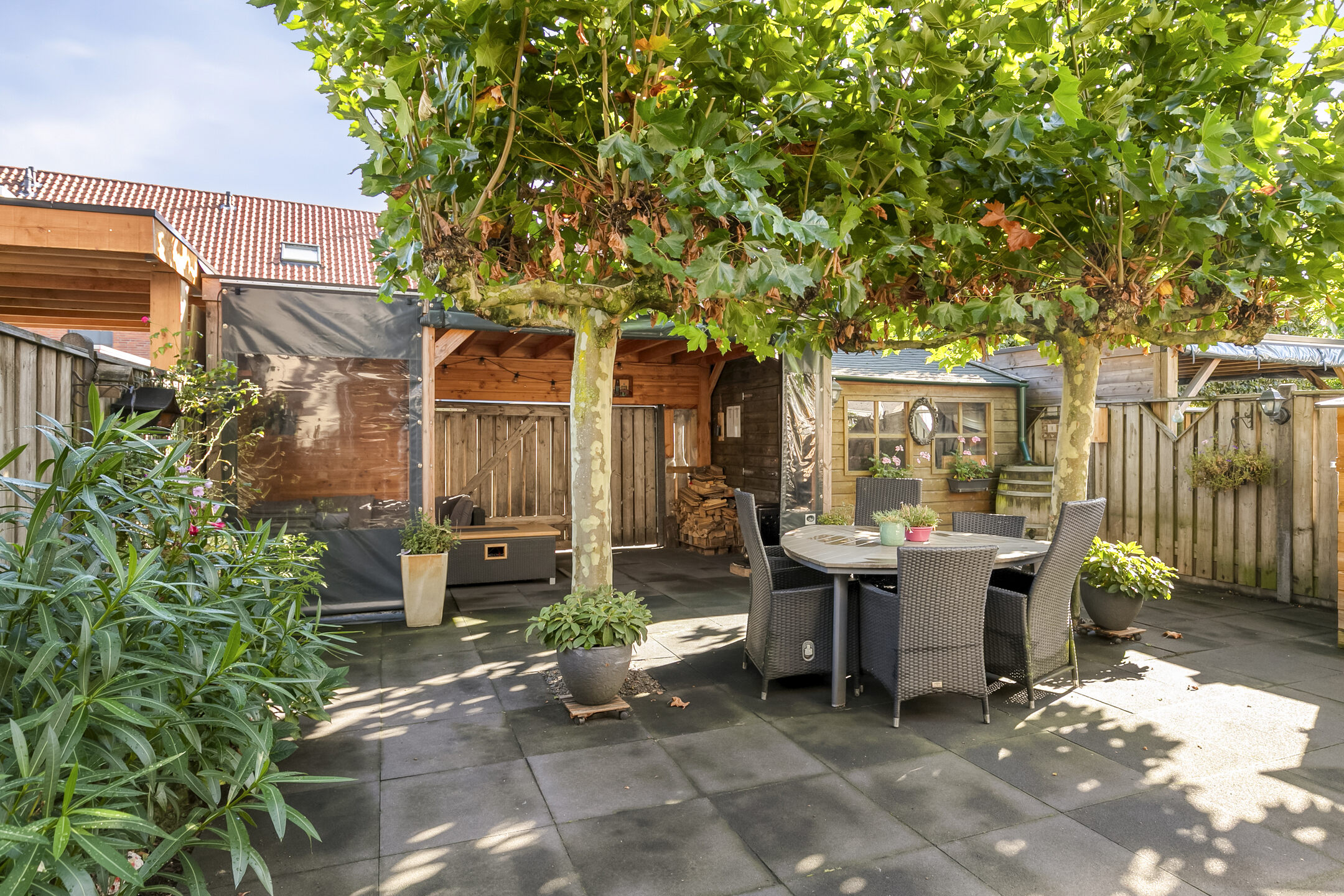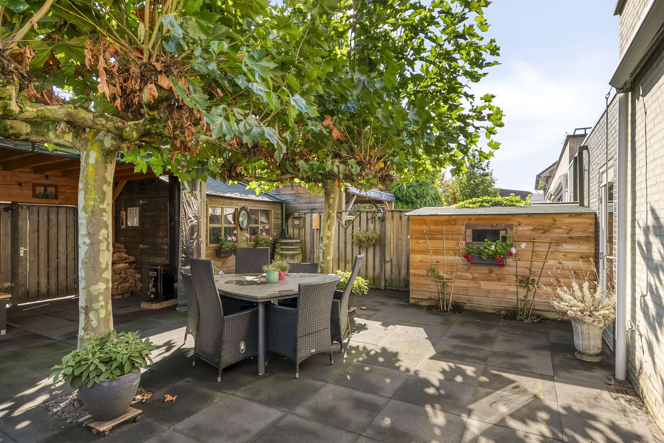 De tuin is op het zuiden gericht en is zo ingedeeld dat je hier de gehele dag kunt genieten van mooie dagen. Overdag onder de plantanen en later op de dag onder de ruime overkapping. Tevens biedt de tuin extra bergruimte en heeft het middels een dubbele deur ontsluiting op de achtergelegen brandgang.