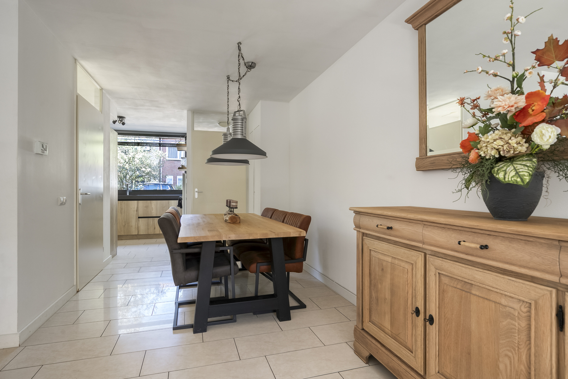 Via de voordeur kom je in de hal waar de meterkast is (4 groepen, 2 aardlekschakelaars, 2 hoofdschakelaars, 2x glasvezelkabel en 1 groep voor de zonnepanelen). Vanuit hier kom je in de eetkamer, welke gelegen is tussen de woonkamer en de open keuken.