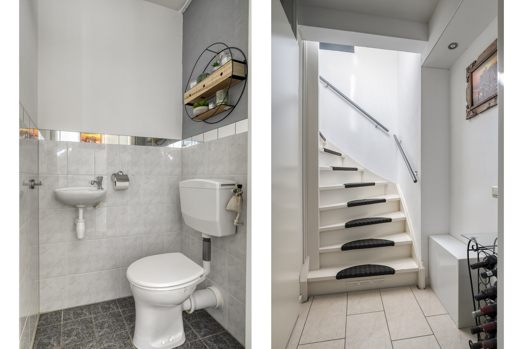 Centraal in de woonkamer is de afgesloten hal met hierin een vaste trapopgang richting de 1e verdieping. In de hal is tevens een los toilet met fonteintje.