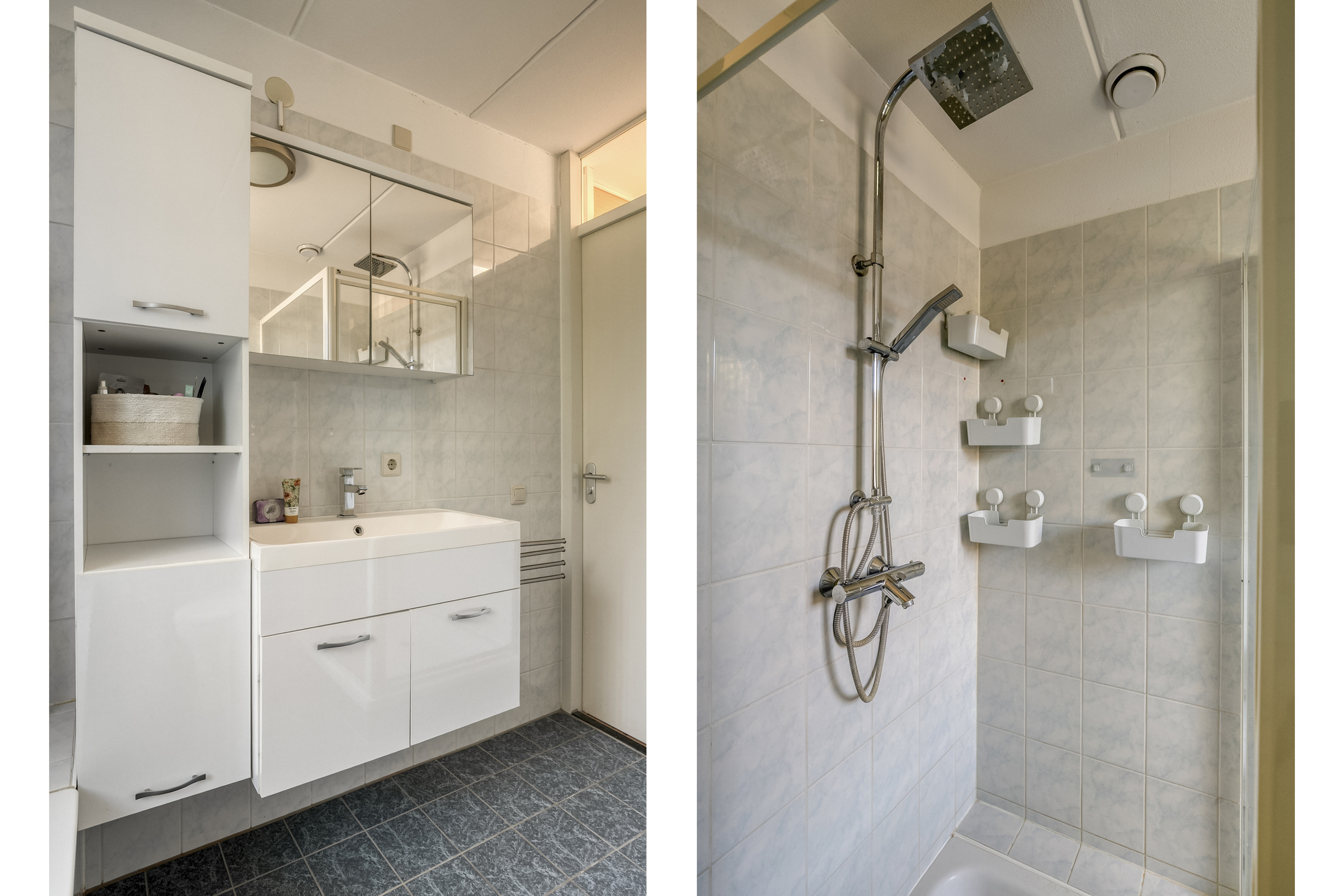 De geheel betegelde badkamer is voorzien van een douche, toilet, ligbad en een wastafel met wastafelmeubel.