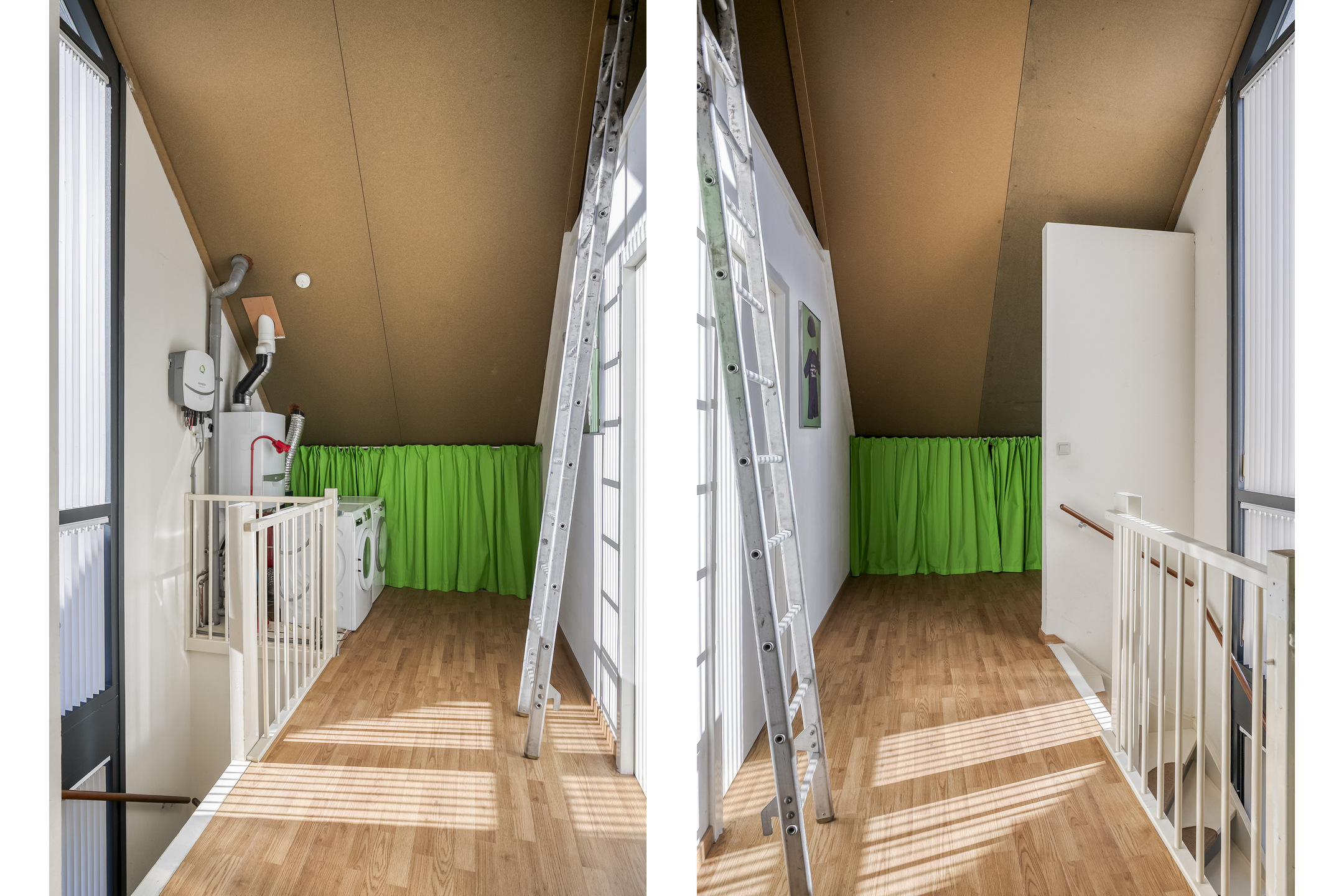 Met een vaste trap kom je op de 2e verdieping. Je hebt hier een voorzolder met extra bergruimte onder de schuine kant. Tevens bevindt zich hier de opstelplaats van de c.v.-combiketel ( Vaillant, 2017) en hangt hier de omvormer van de 15 zonnepanelen.