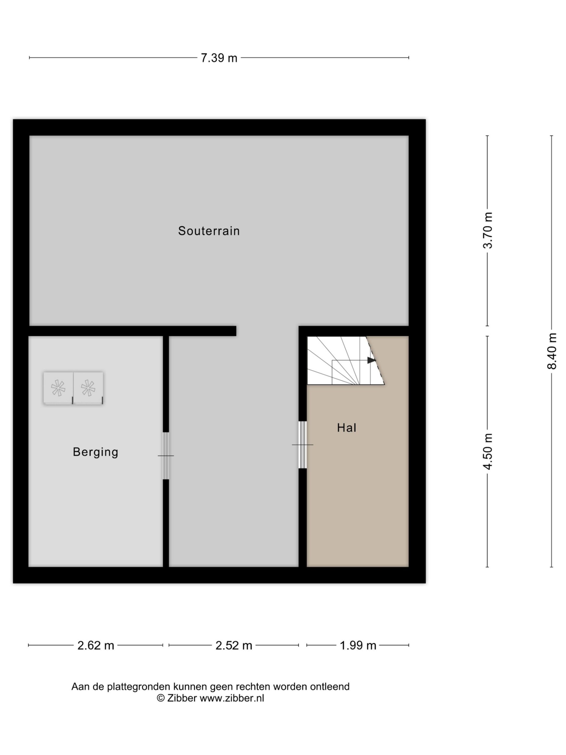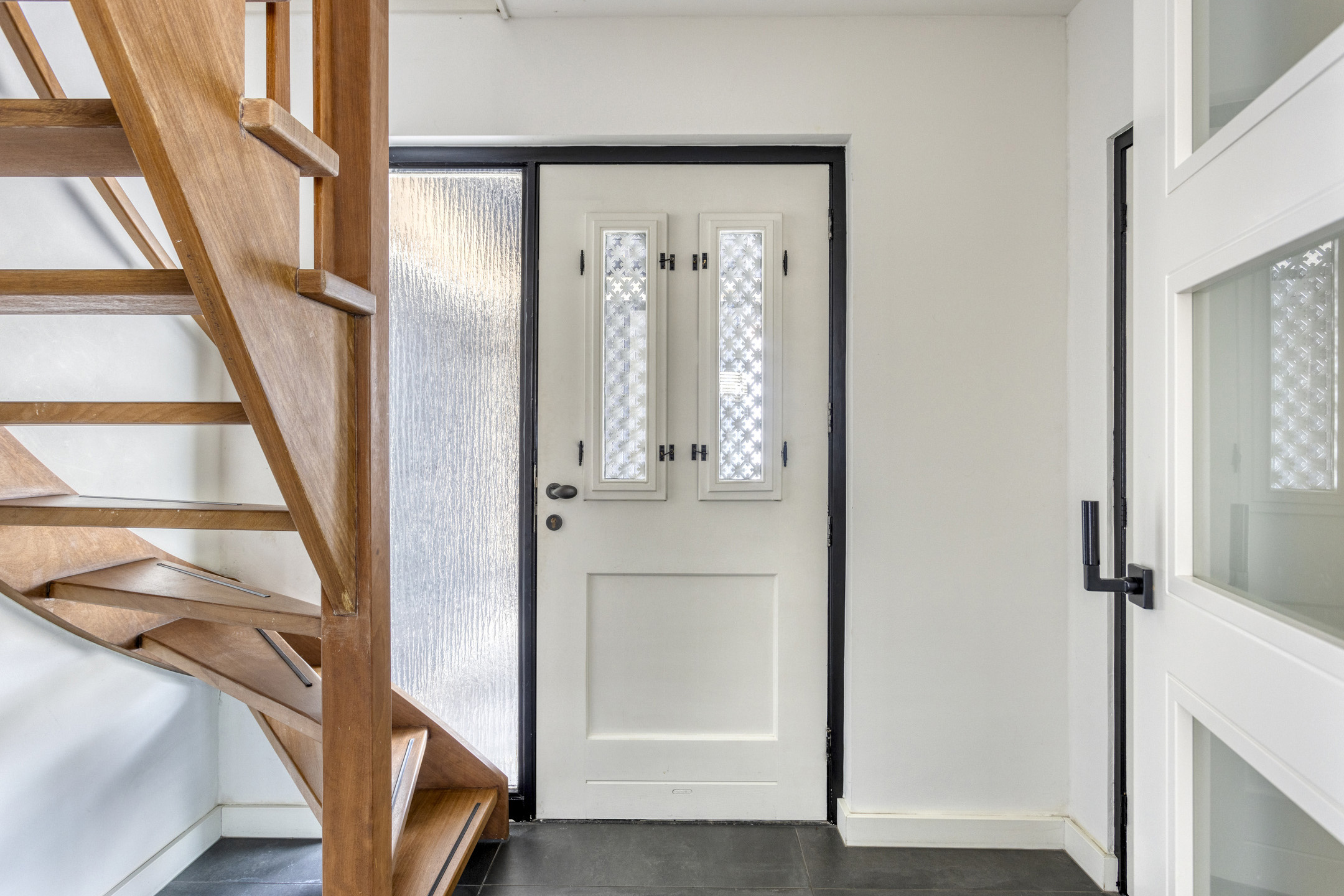 Nadat je de auto op de oprit hebt geparkeerd kom je via de voordeur in de hal. Hier is de garderobe, het toilet en de meterkast (2 aardlekschakelaars, 10 lichtgroepen en 1 krachtgroep). Vanuit de hal ga je naar de woonkamer.