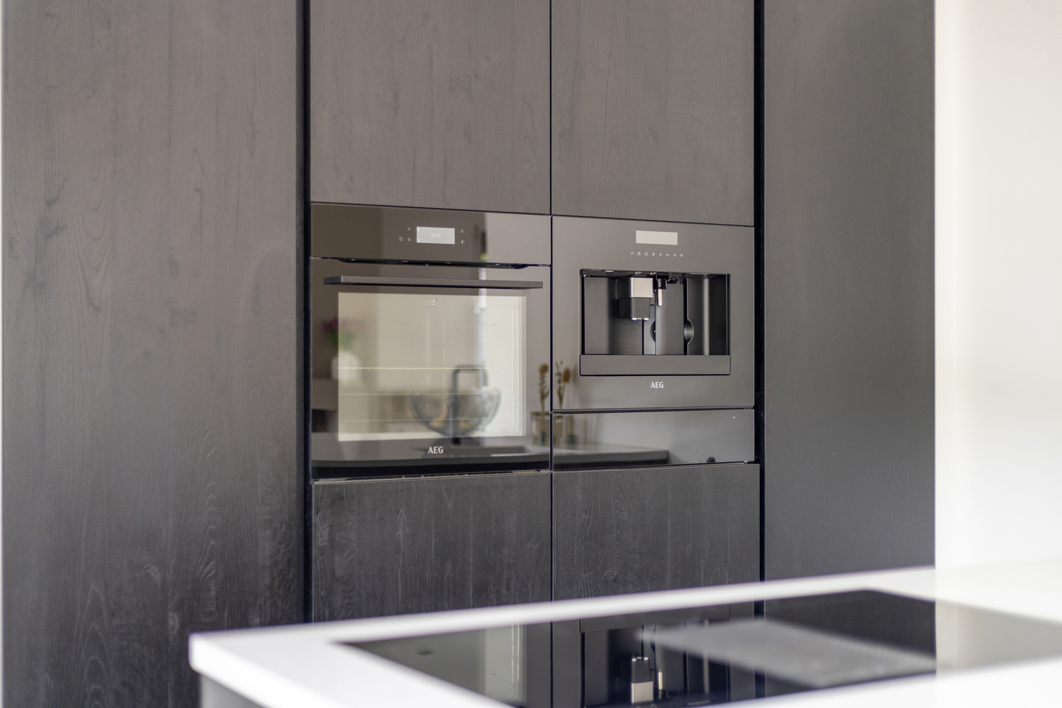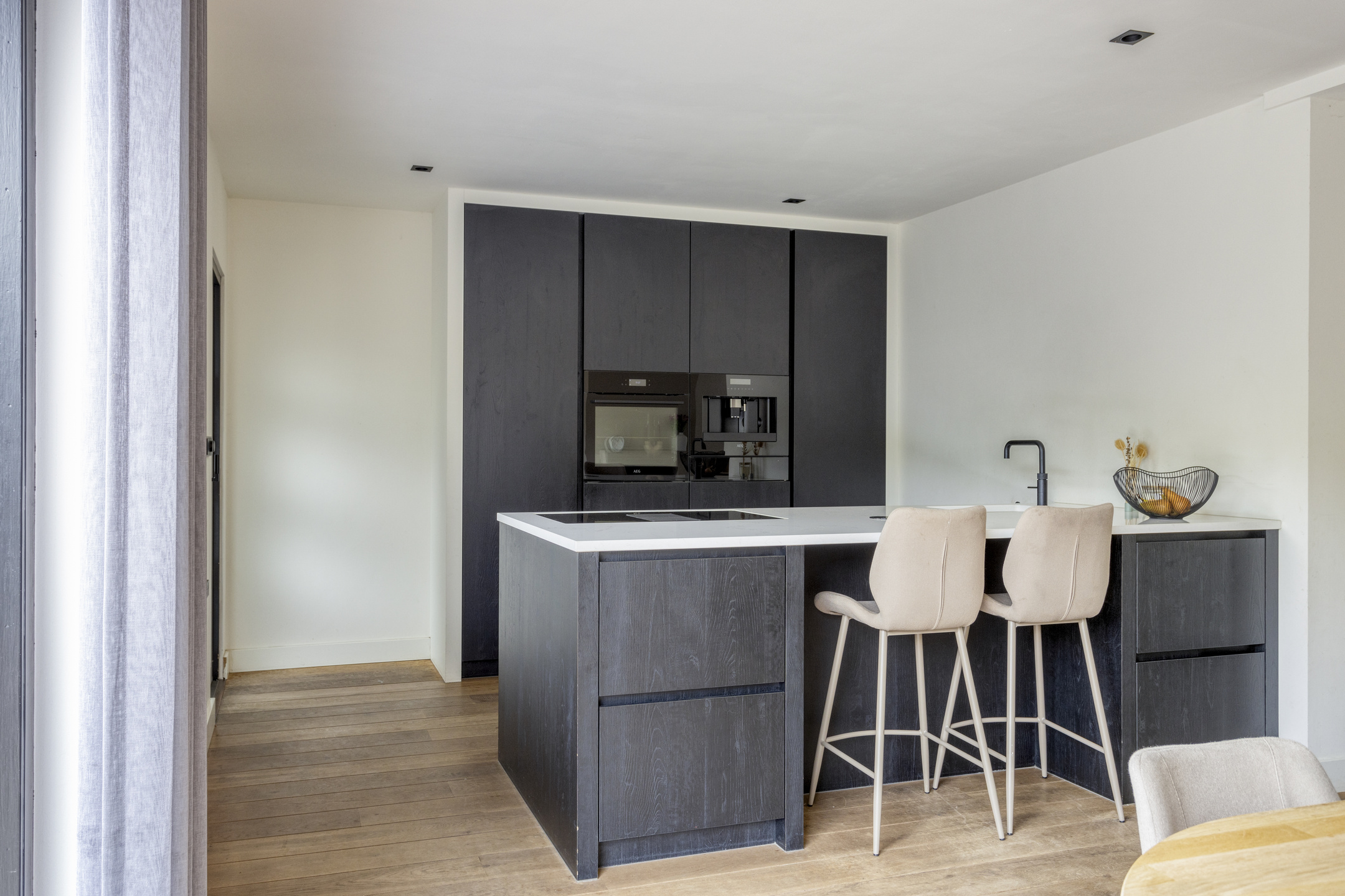 De open keuken is aan de achterzijde van de woning gelegen. Deze is modern en voorzien van voldoende boven-, onderkasten en lades. Het lichte werkblad met de donkere keuken zorgt voor een sfeervol geheel. Verder is er een mogelijkheid om gezellig aan het eiland te zitten. De keuken is voorzien van een 4 pits inductiekookplaat met downdraft, inbouw vaatwasser, een oven, quooker, inbouw koffiezetapparaat en een koelvries-combinatie.