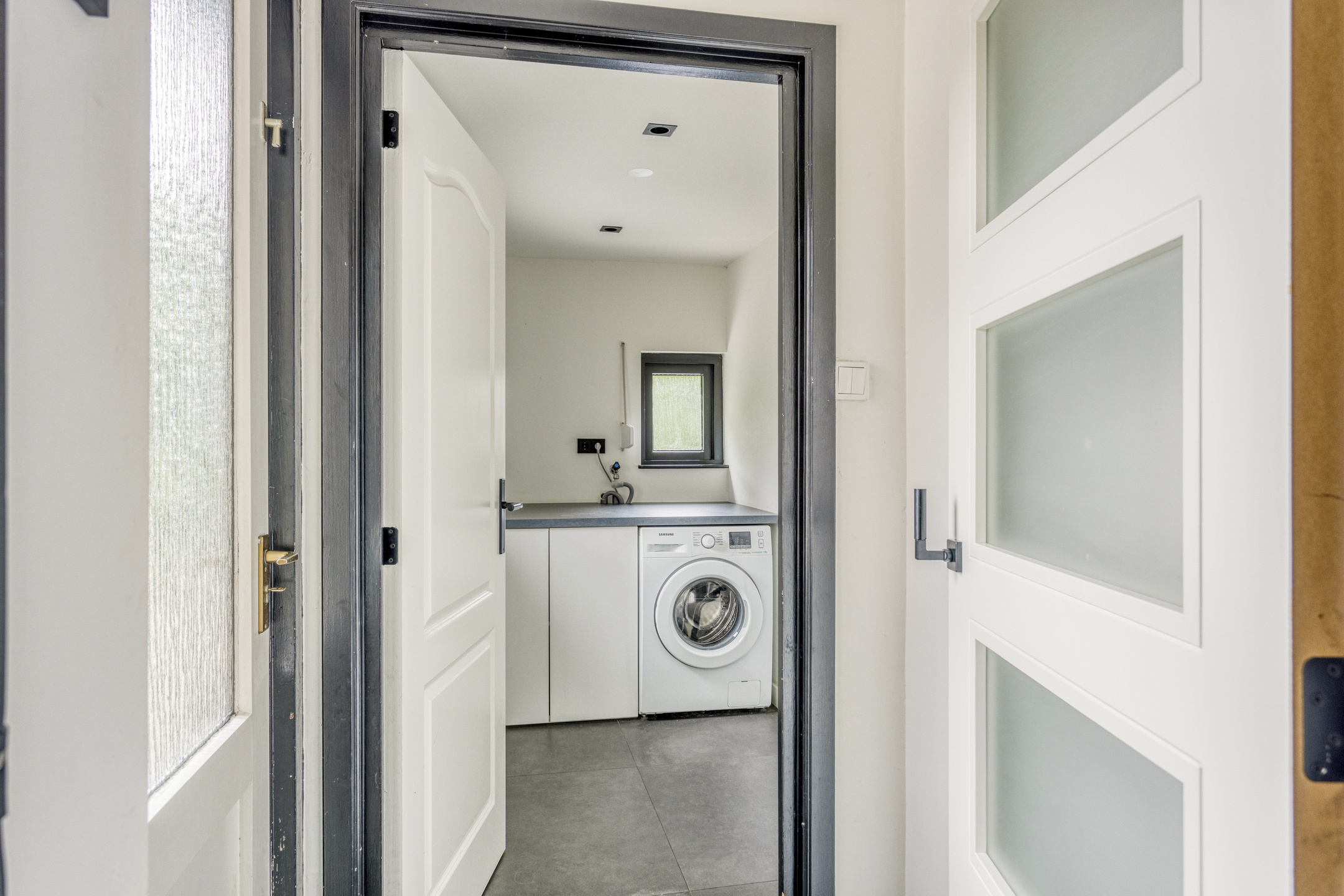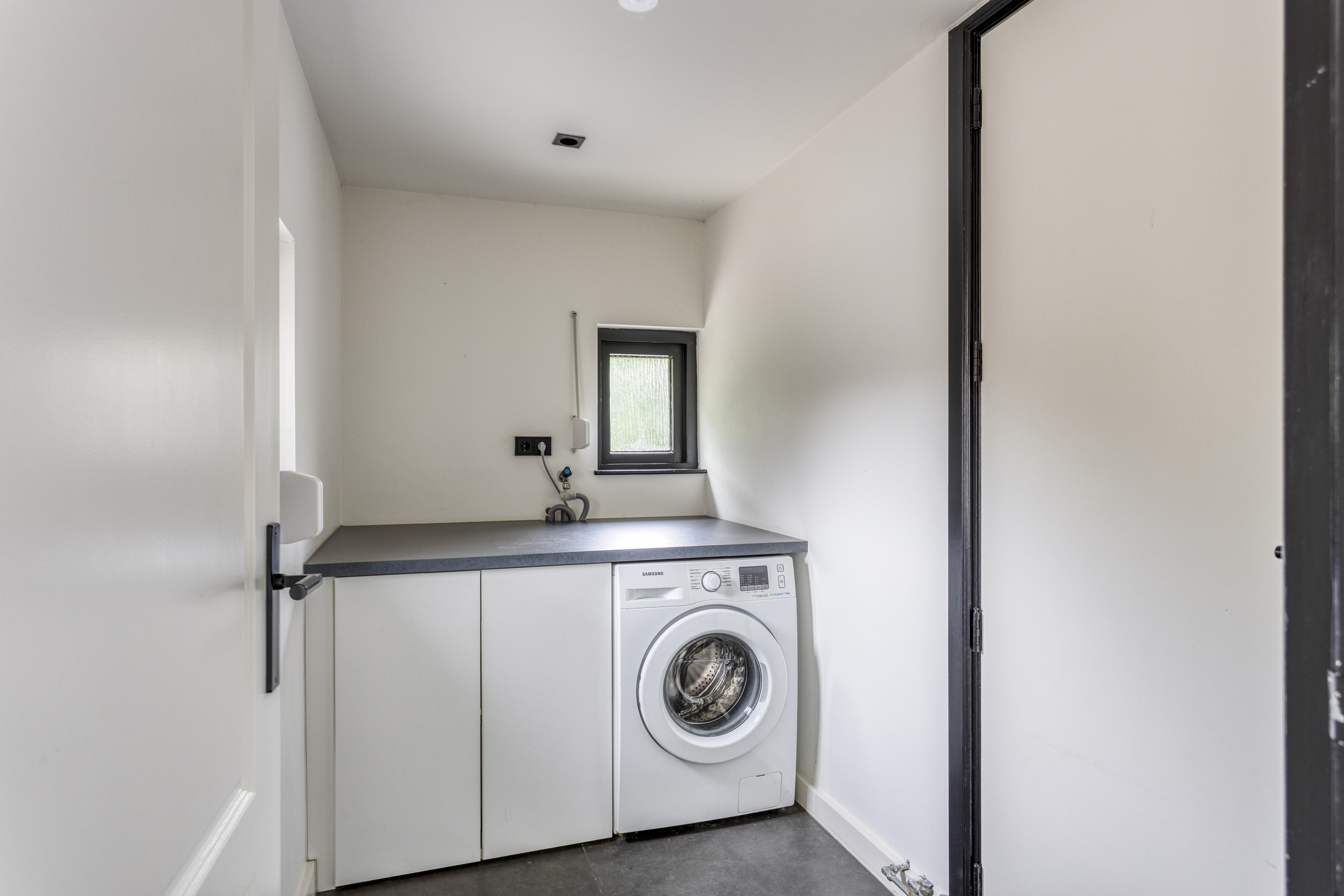 Vanuit de keuken is de bijkeuken te bereiken, die toegang biedt aan de tuin. In deze bijkeuken is een werkblad met wasmachine voorzien. Vanuit de bijkeuken is ook de garage bereikbaar.