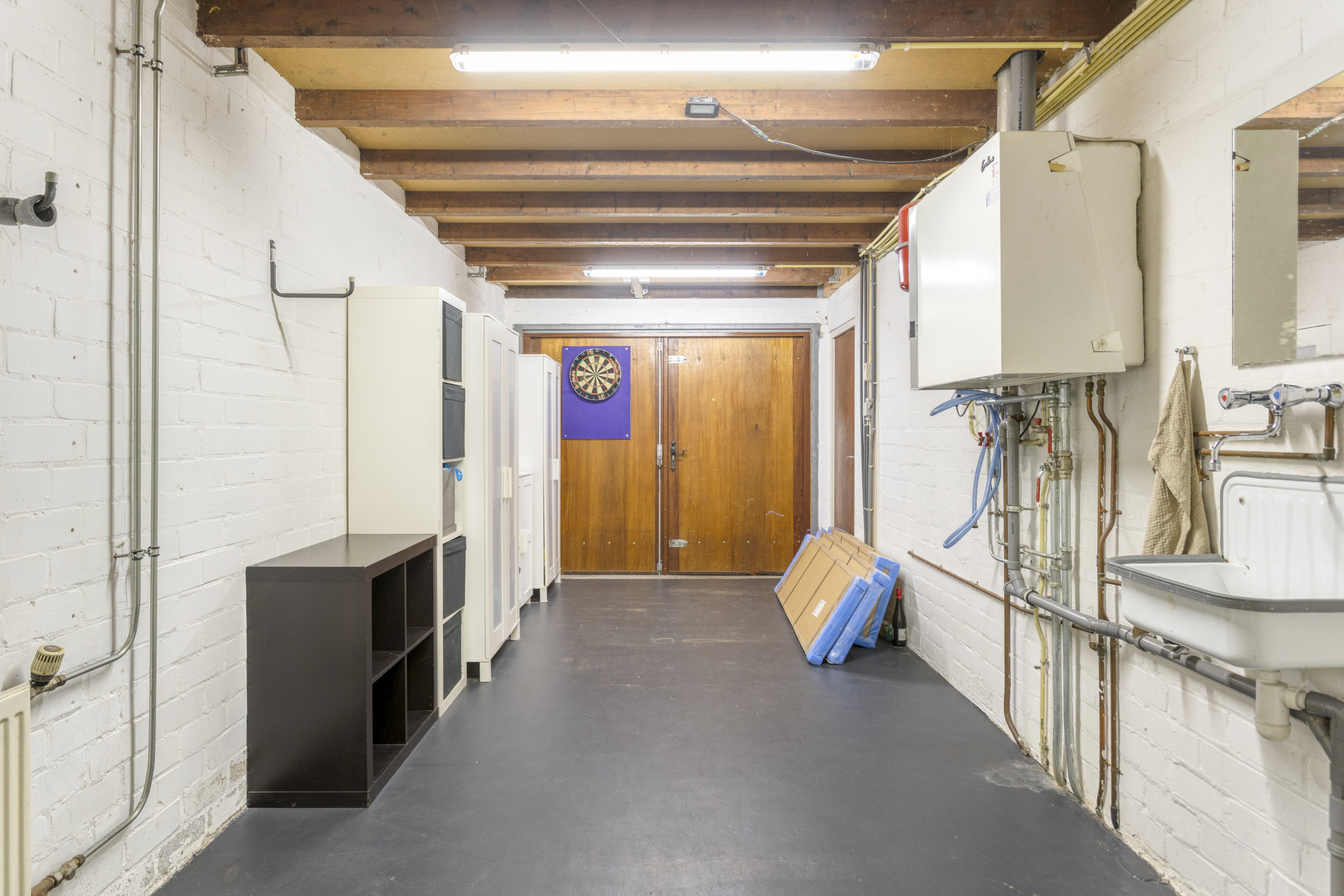 De garage is ruim van opzet en beschikt over water, elektra en een vliering. Hier bevindt zich tevens de CV-ketel (Nefit Ecomline 2004) en de toegang tot de kelder. Deze woning is volledig onder keldert en met een hoogte van 2 meter kan je hier dan ook prima staan. Ideaal dus voor het opbergen van je spullen.
