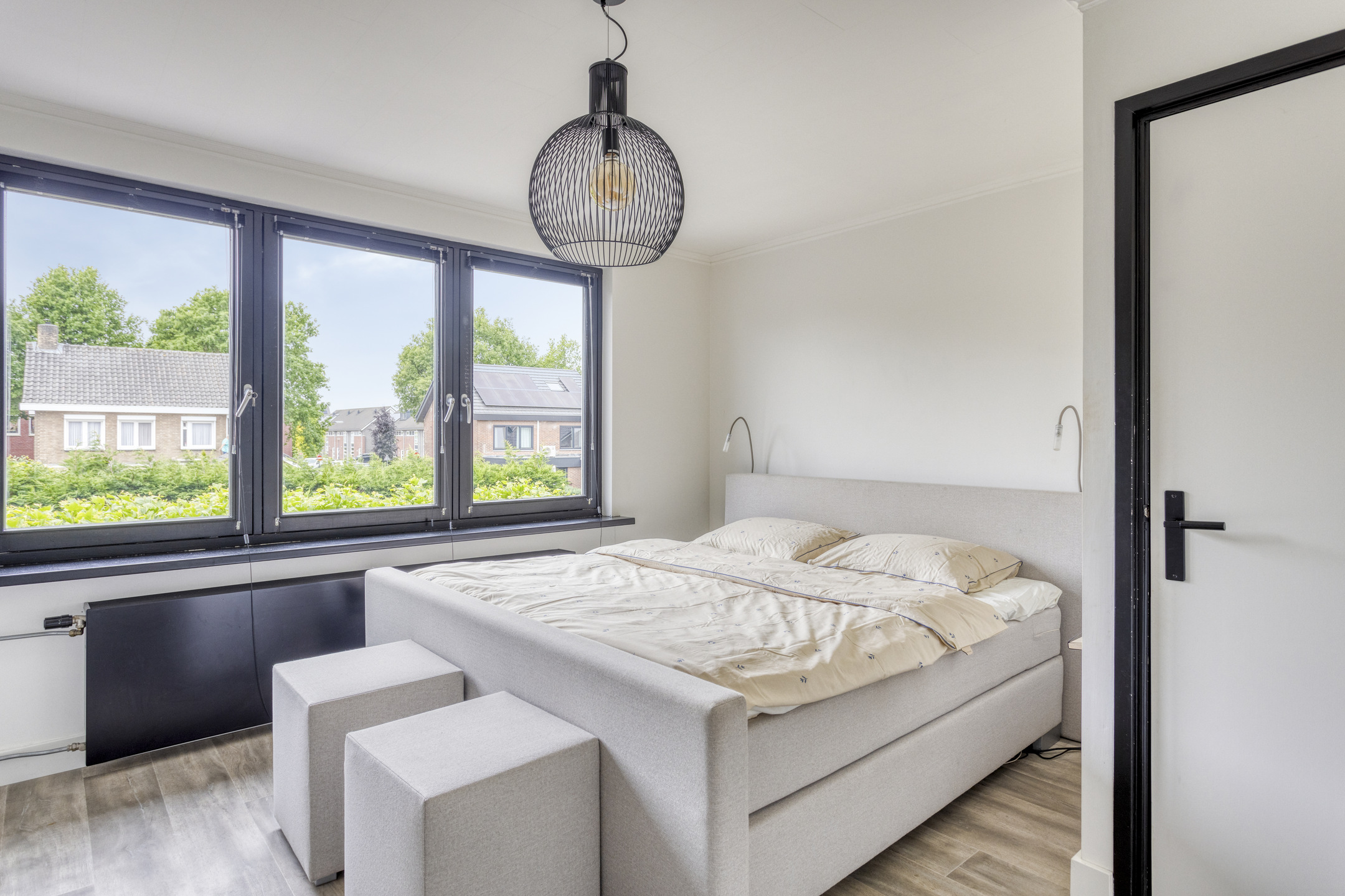Vanuit de overloop zijn de drie slaapkamers en badkamer bereikbaar. Aan de voorzijde is er een slaapkamer met een afmeting van ca. 4.52 x 3.10 m. Hier is veel lichtinval en de kamer is voorzien van handmatig bedienbare rolluiken.