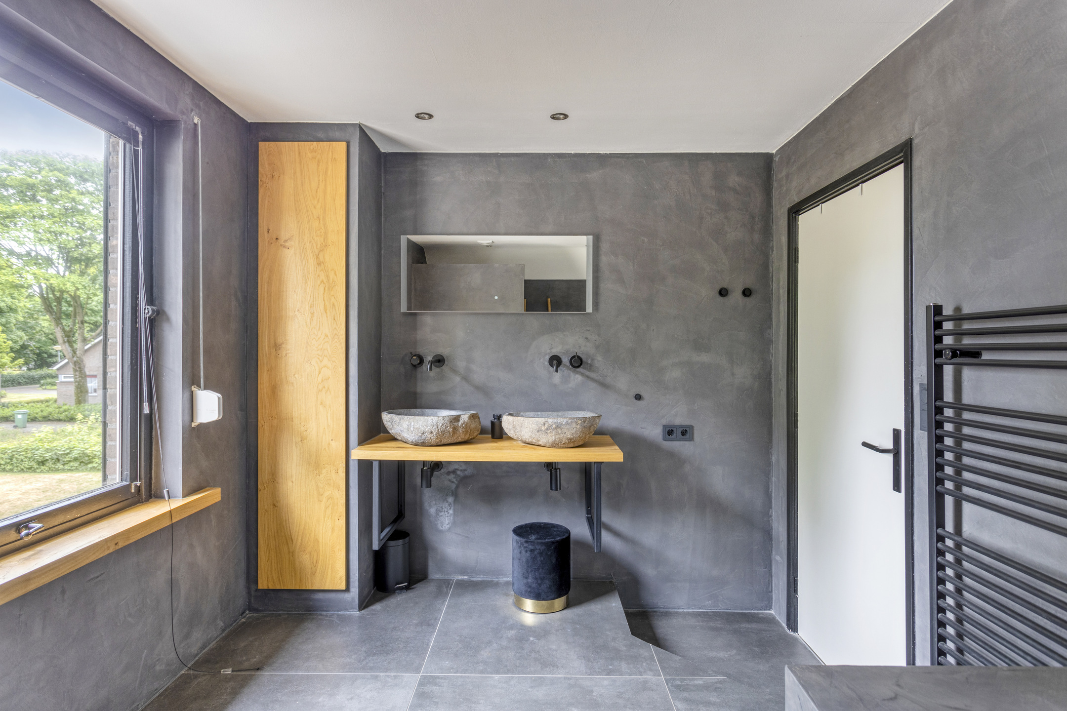 De badkamer is modern en is voorzien van een ligbad, inloopdouche, een zwevend closet en een dubbele wastafel met spiegel en opbergruimte. De designradiator kan gebruikt worden om de handdoeken te drogen/verwarmen. In de badkamer is vloerverwarming aanwezig.
