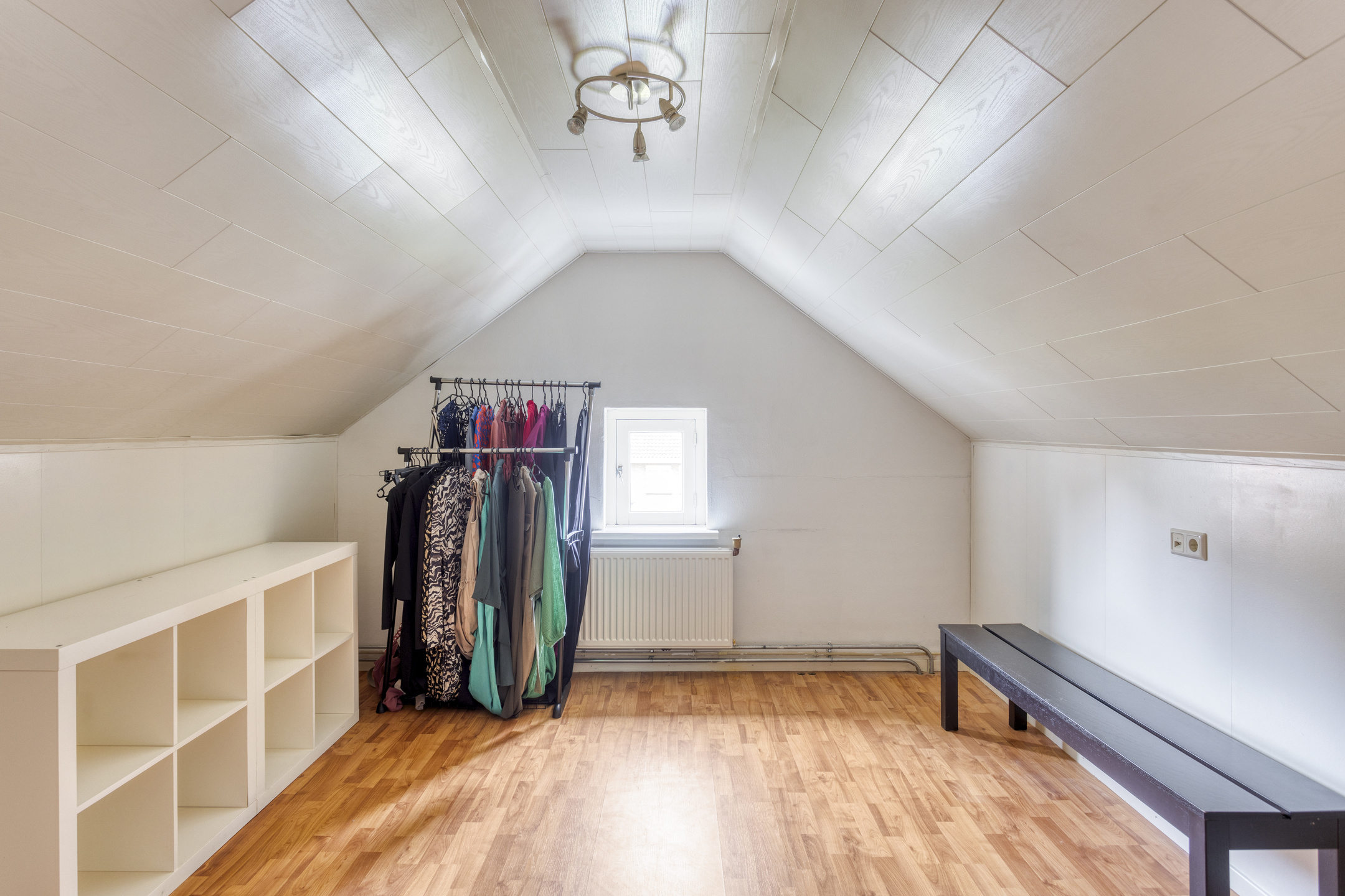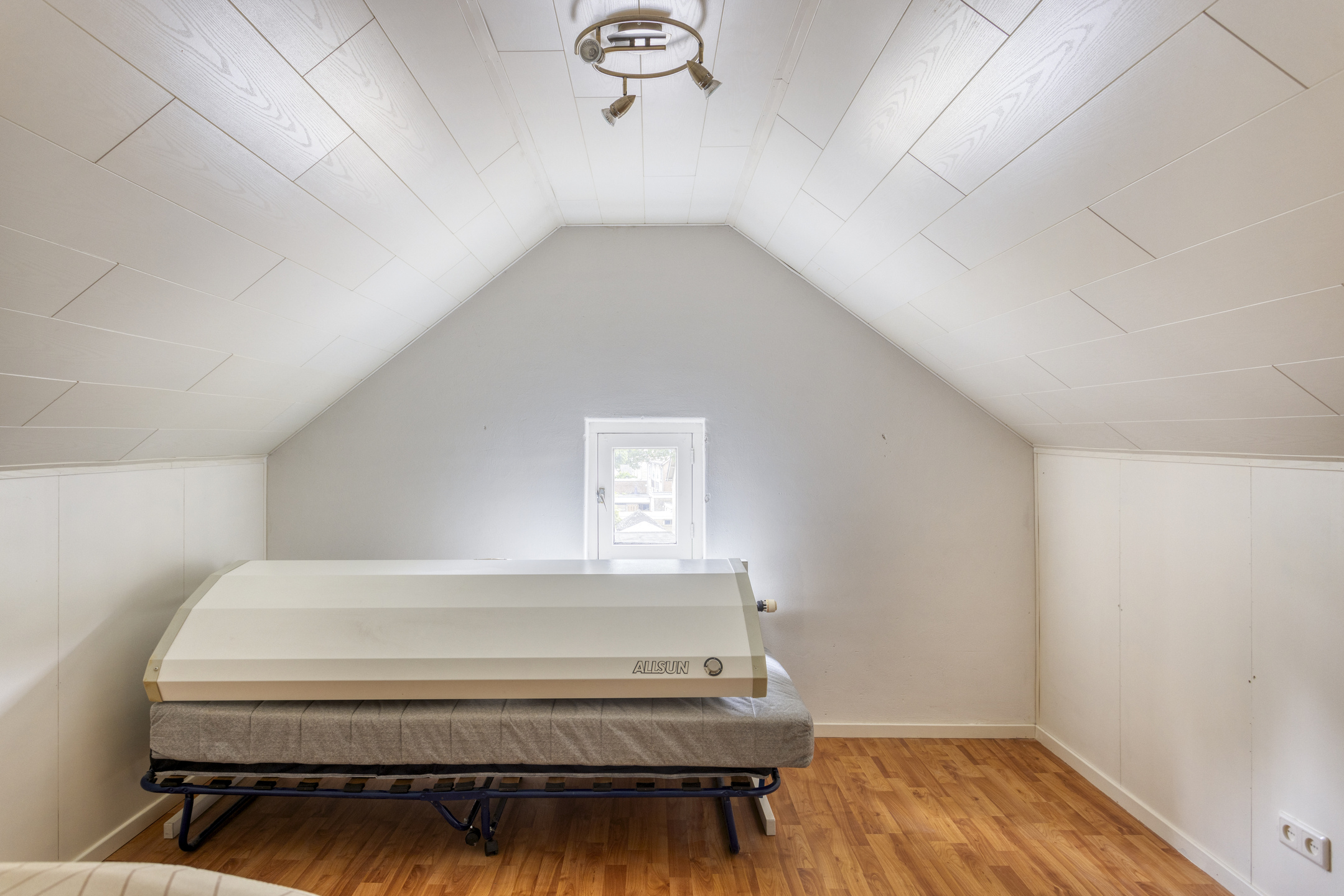 De tweede slaapkamer is aan de achterkant van de woning gelegen en heeft een afmeting van ca. 3.77 x 3.84 m. Hier is een inbouwkast aanwezig over de gehele breedte van de kamer. Het grote kozijn zorgt voor véél lichtinval en prachtig tuincontact. Het rolluik op deze kamer is elektrisch bedienbaar.