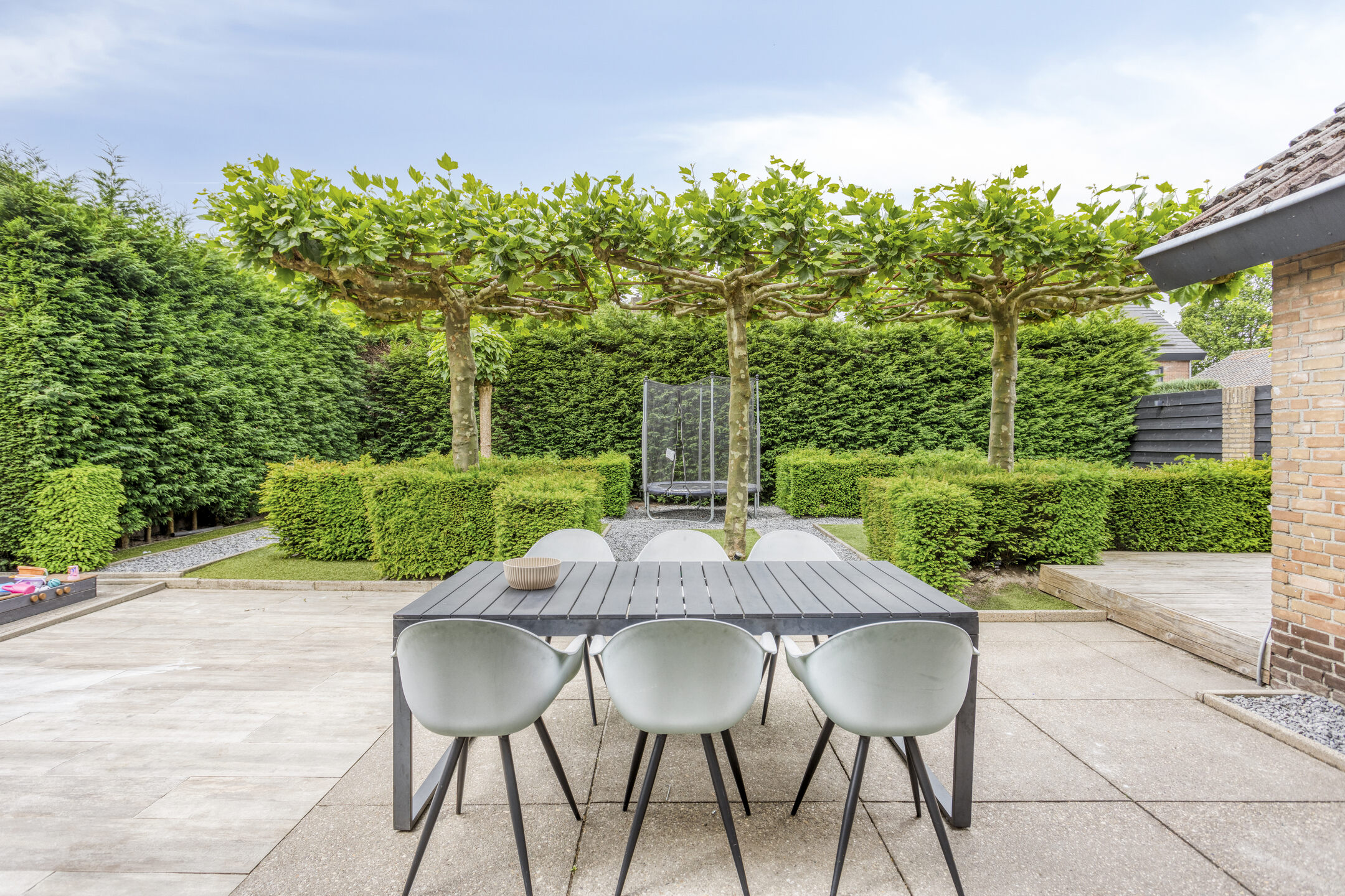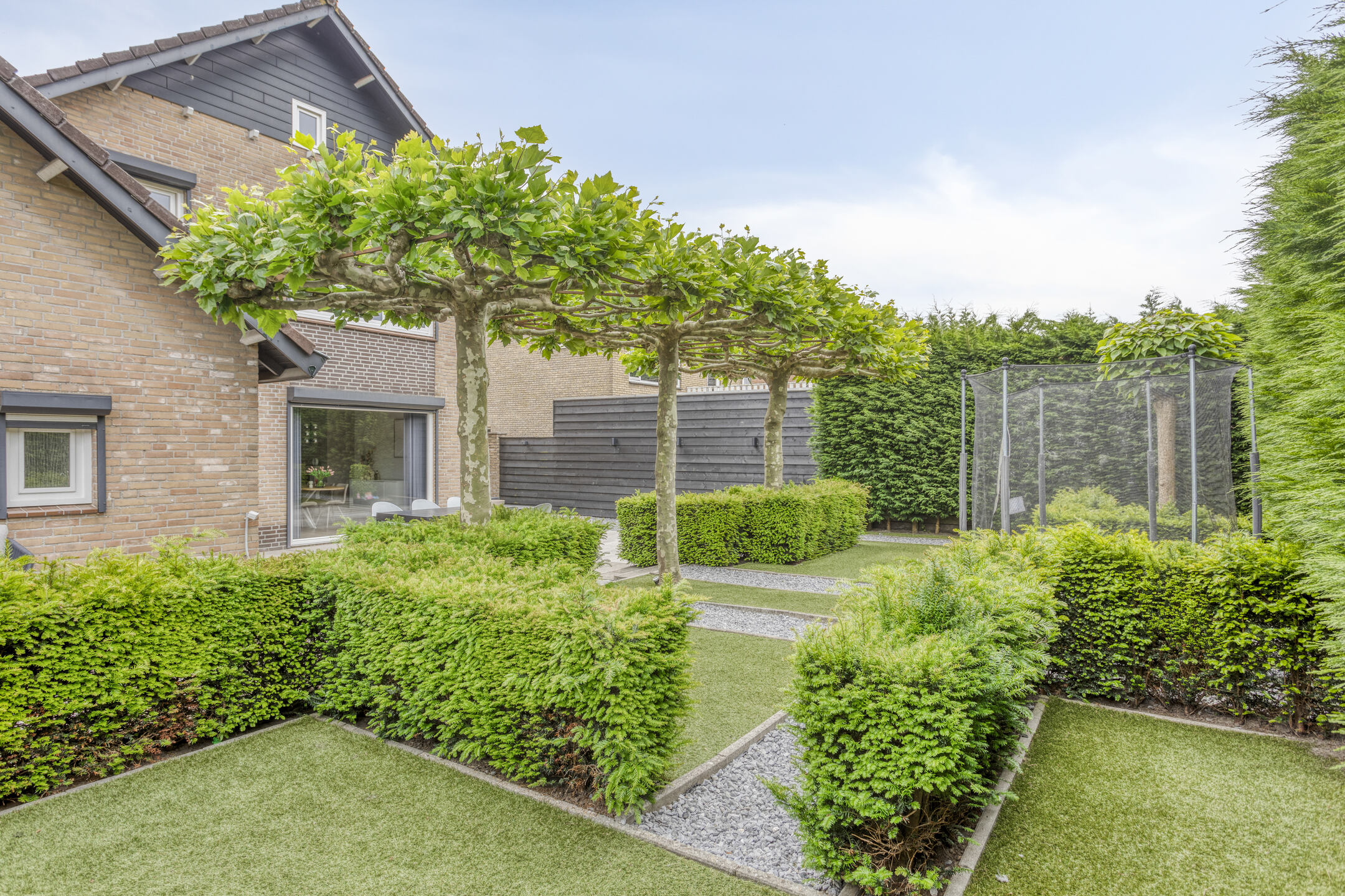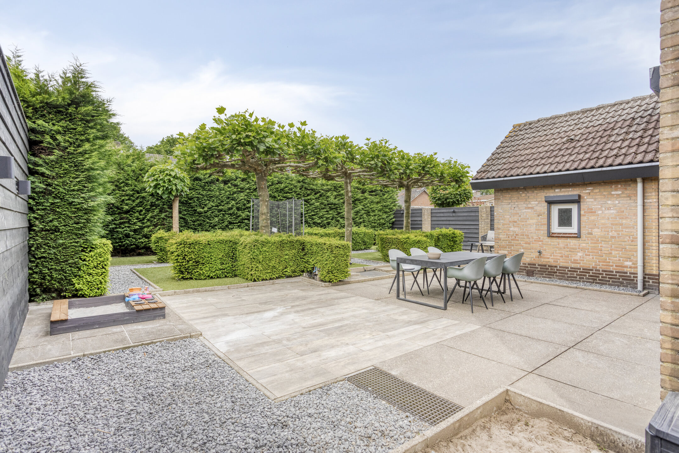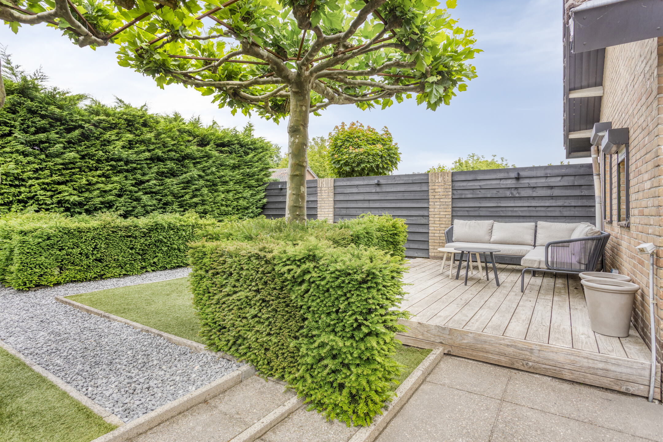 De privacy biedende achtertuin is op het westen gelegen en is zowel via de bijkeuken als via de poort aan de zijkant van het perceel te bereiken. Aan de achterzijde van de woning zijn diverse zitjes gecreëerd. De tuin is sfeervol ingericht met diverse haagjes en bomen. Hierdoor is er zowel een mogelijkheid om te genieten van de zon, maar kun je ook heerlijk een schaduwplekje opzoeken.