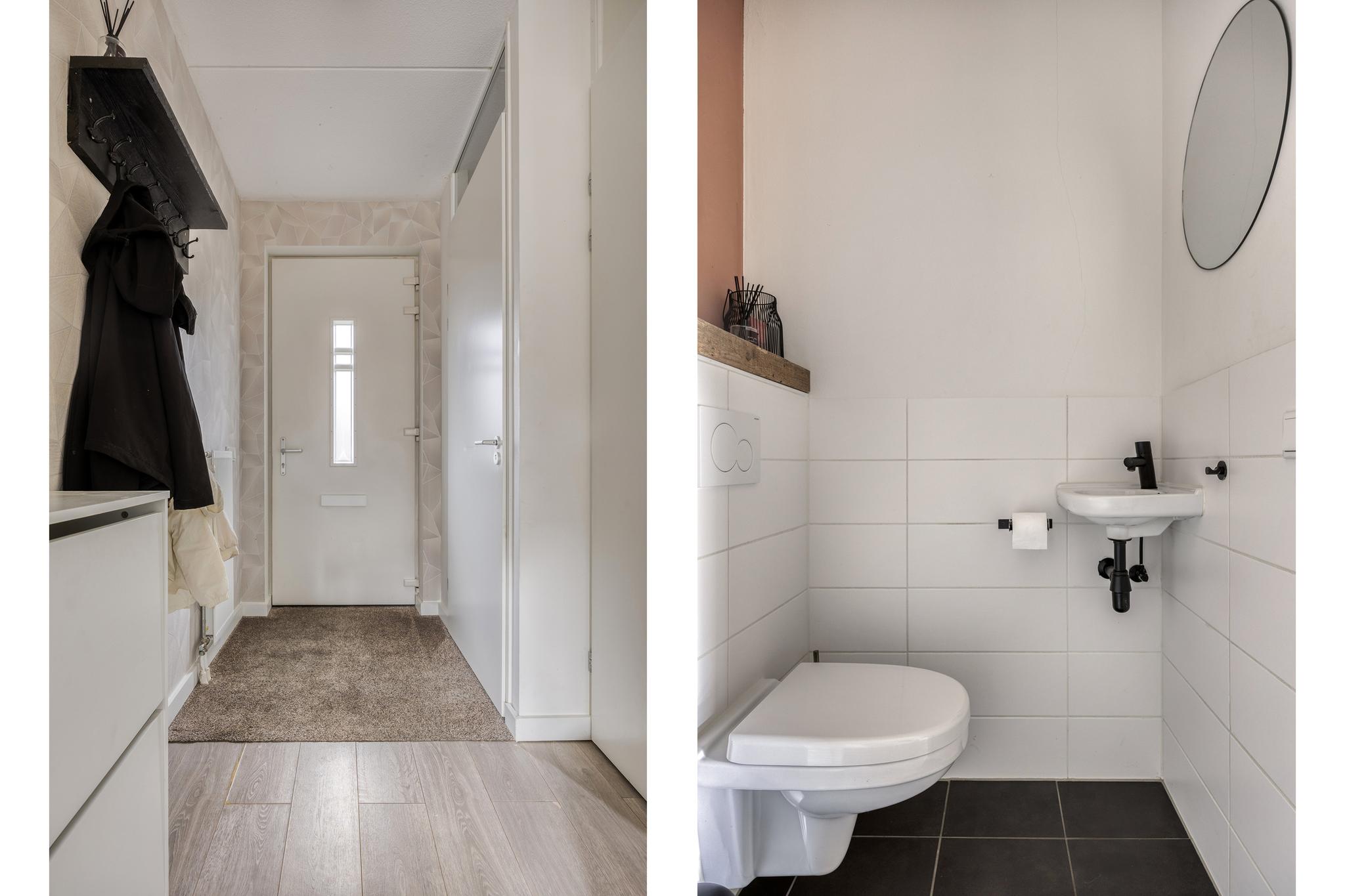 Als je de auto hebt geparkeerd, dan loop je zo naar de entree van de woning. De hal geeft toegang tot de betegelde toiletruimte met wandcloset en fontein en de meterkast (11 groepen, 1 kookgroep, 3 aardlekschakelaars, een beltrafo en twee hoofdschakelaars). Vanuit de hal kom je in de woonkamer met open keuken.
