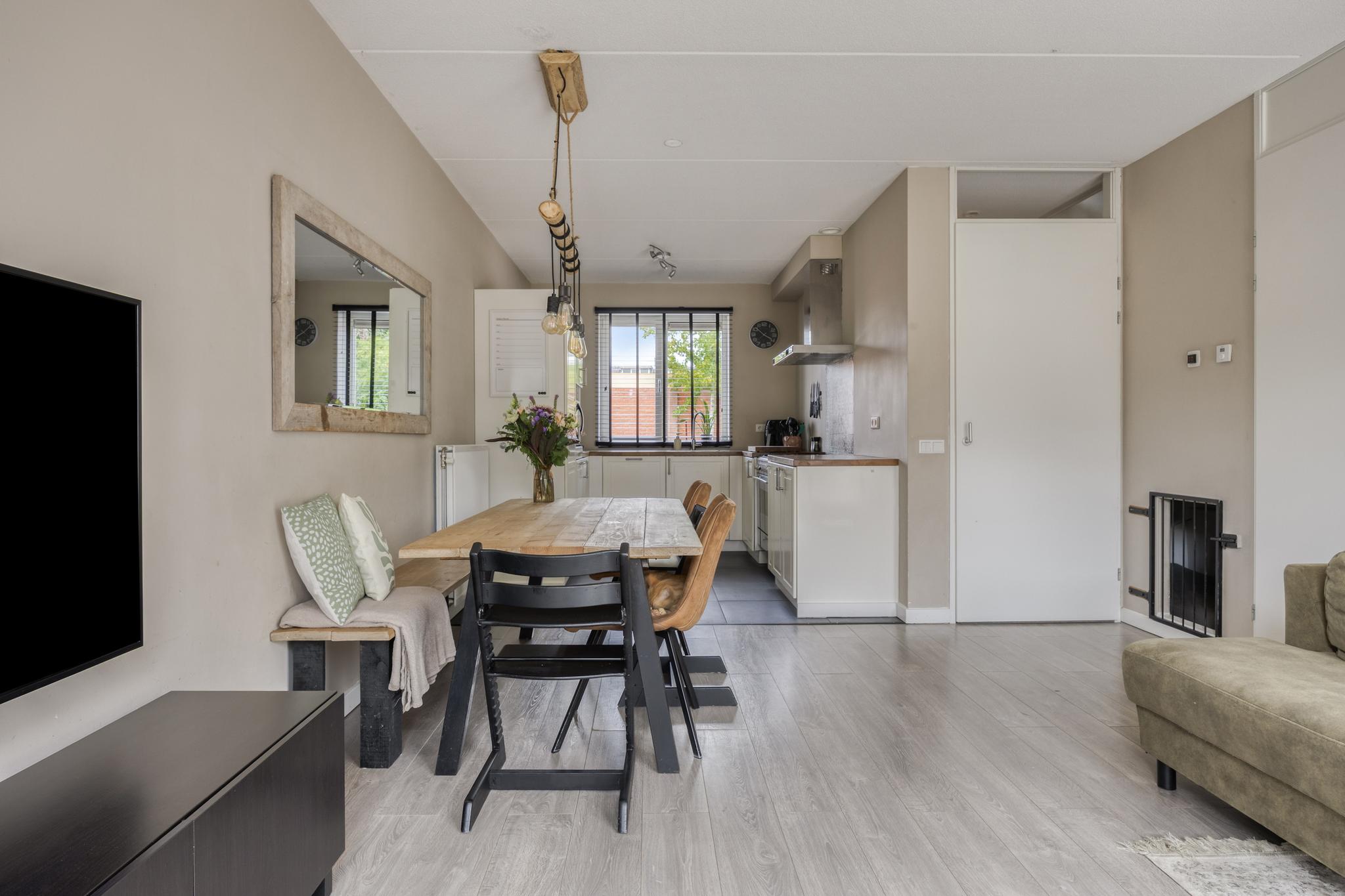 De lichte, tuingerichte woonkamer is ca. 22 m² groot en staat in open verbinding met de keuken. Via de loopdeur (en dubbele tuindeuren) kun je naar de tuin. Er is een trapkast aanwezig voor het opbergen van het proviand, momenteel is hier ook een heerlijke slaapplaats gecreëerd voor de hond.