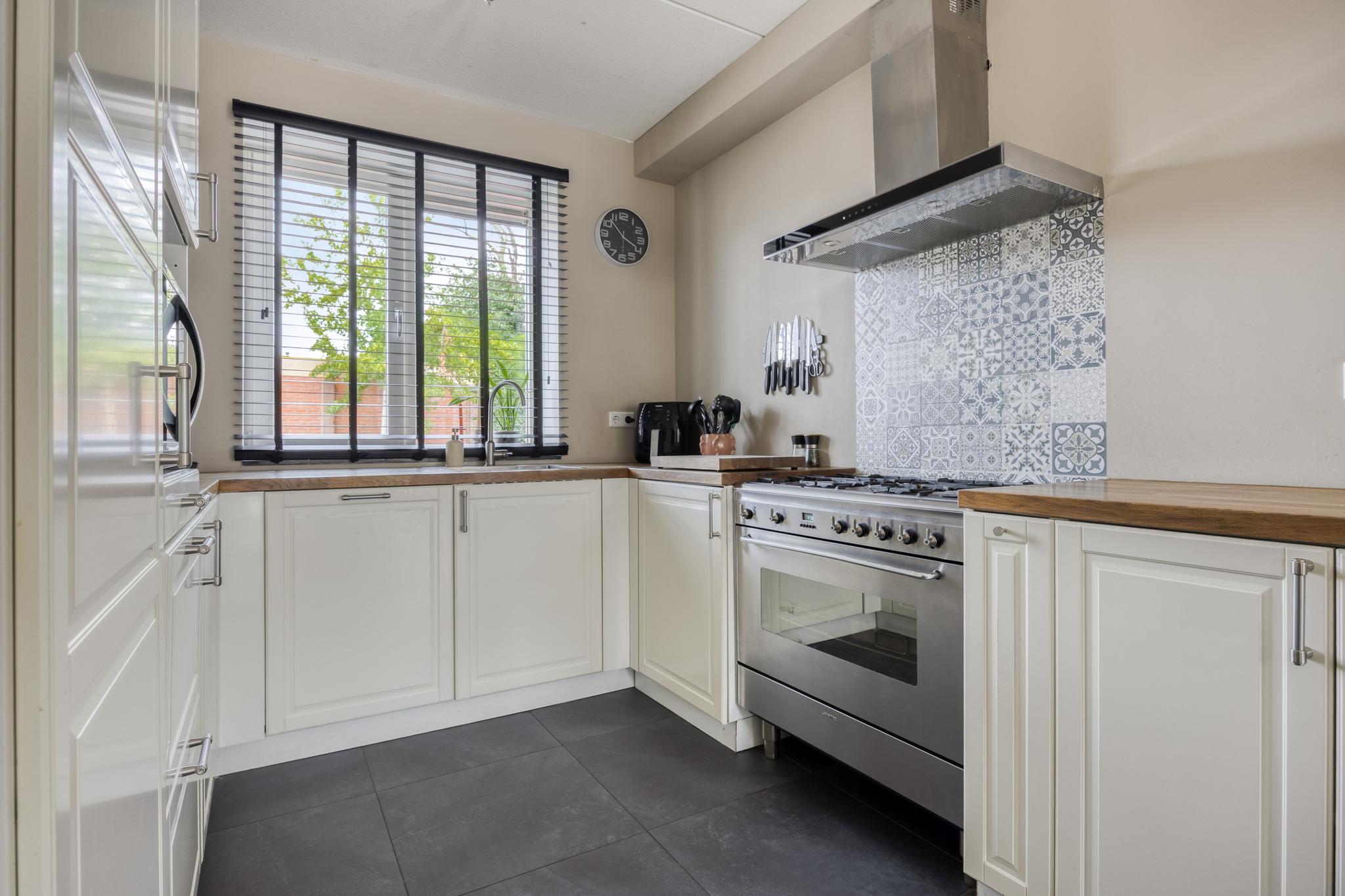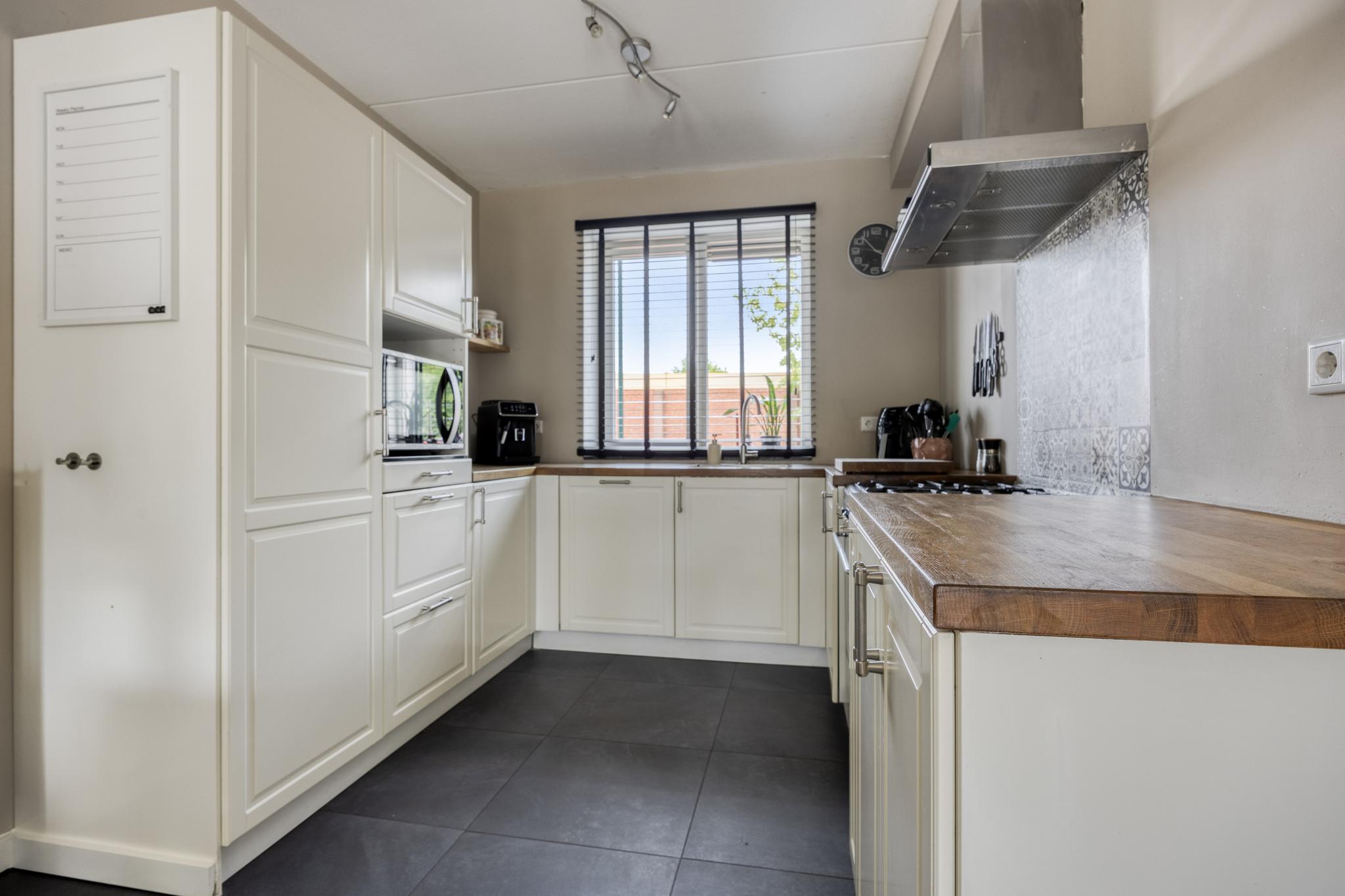 De keuken heeft een U-opstelling met diverse onder- en bovenkasten en lades, een r.v.s. spoelbak, een vaatwasmachine, een 5-pits gaskookplaat met royale oven, een r.v.s. afzuigkap, een koelvriescombi, een combi oven/magnetron en een kunststof werkblad.