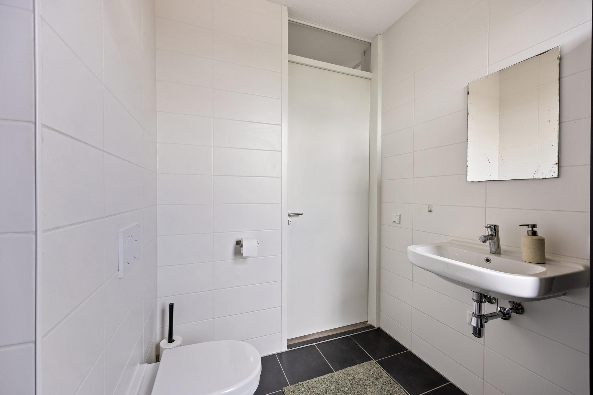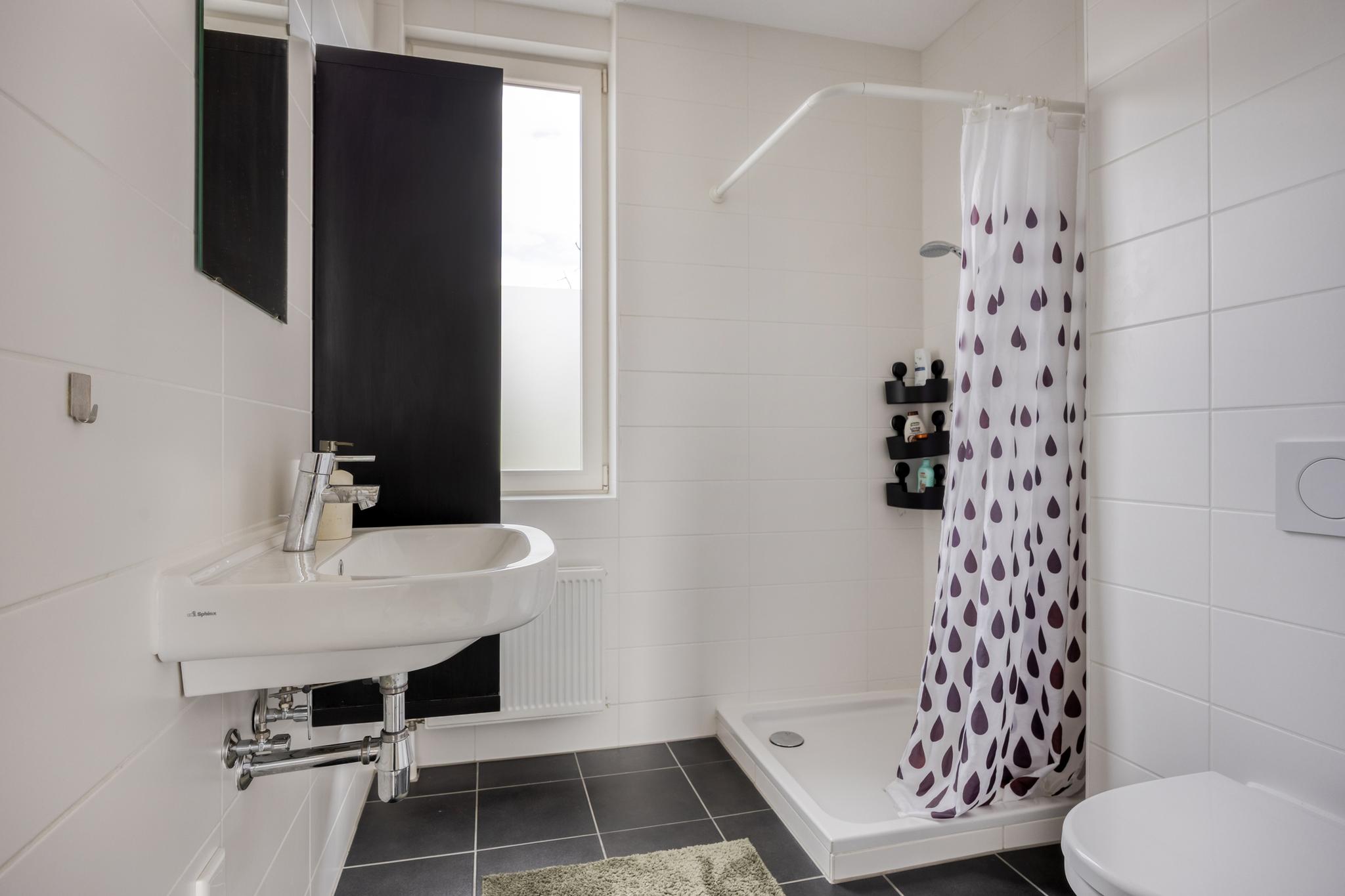 De geheel betegelde badkamer (ca. 2.20 x 2.09 m) is voorzien van een douche, een los badmeubel met wastafel en een wandcloset.