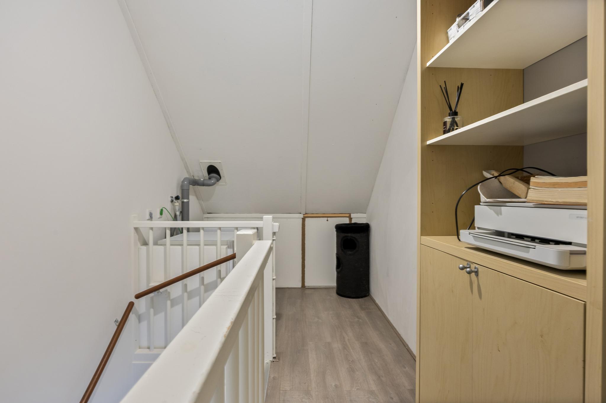 Tevens bevinden zich op deze verdieping de aansluitingen ten behoeve van de was- en droogapparatuur, de opstelplaats van de c.v.-combiketel (Nefit, 2016) en de omvormer van de zonnepanelen. Extra bergruimte vind je achter de knieschotten.