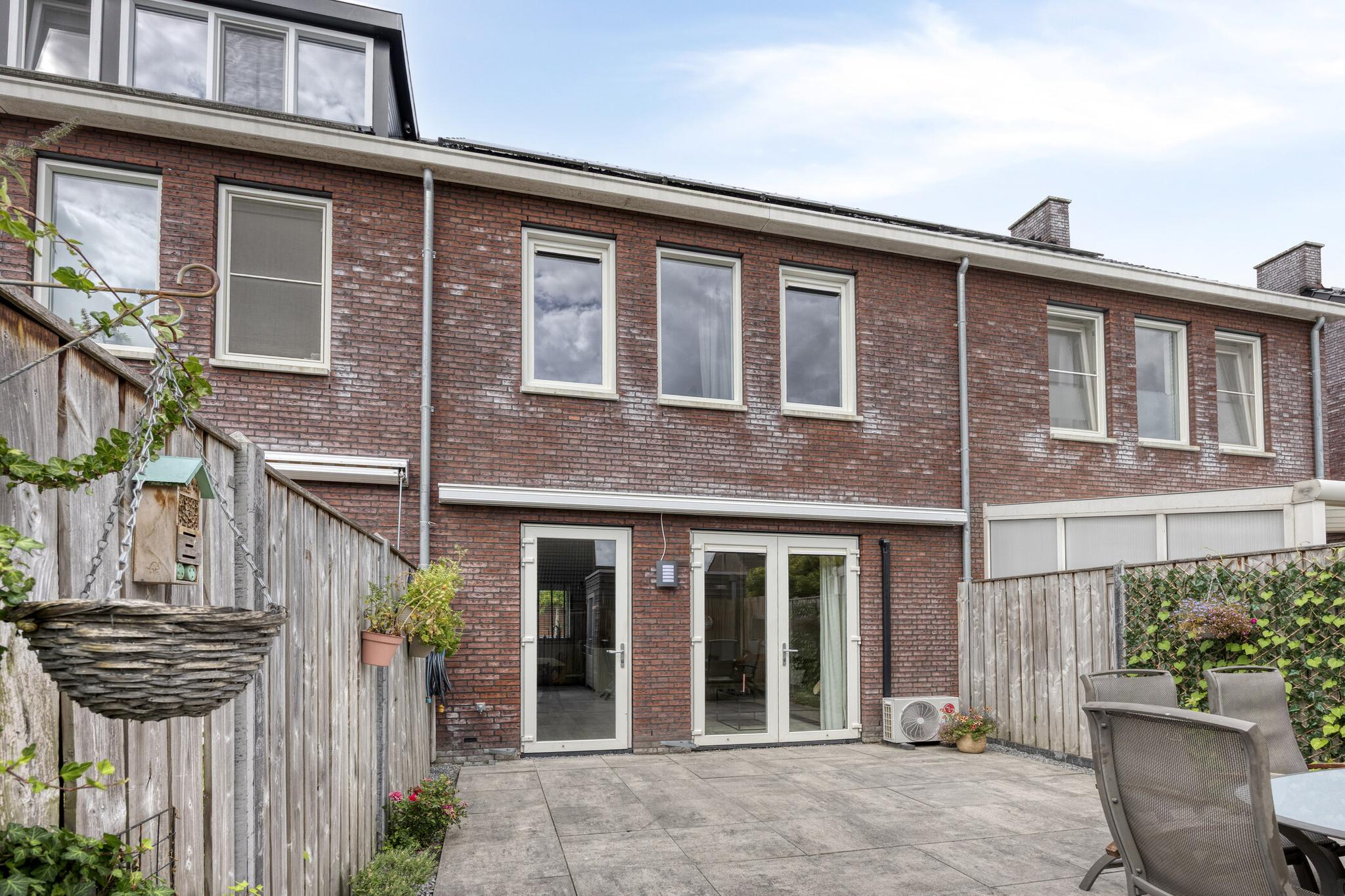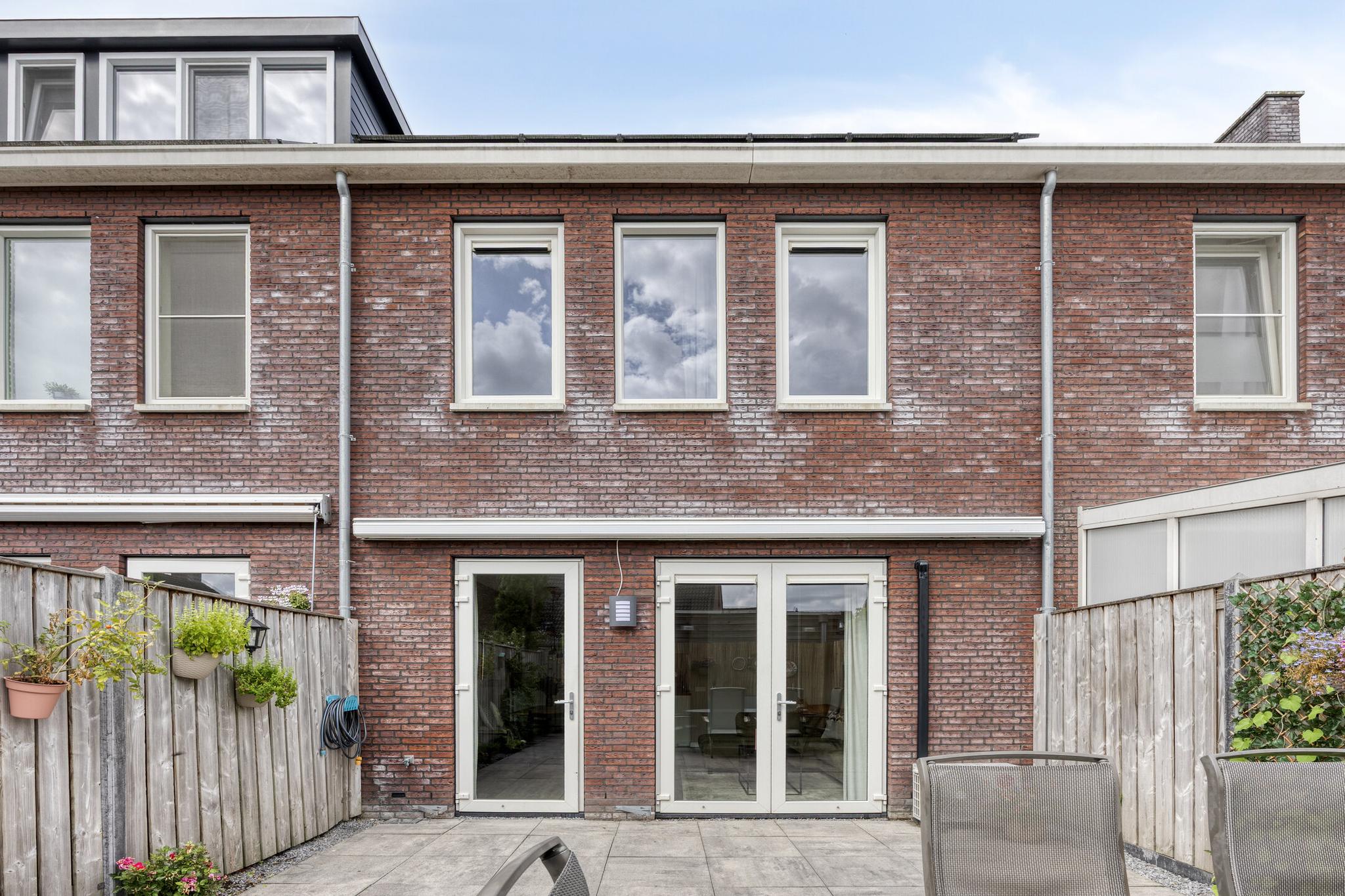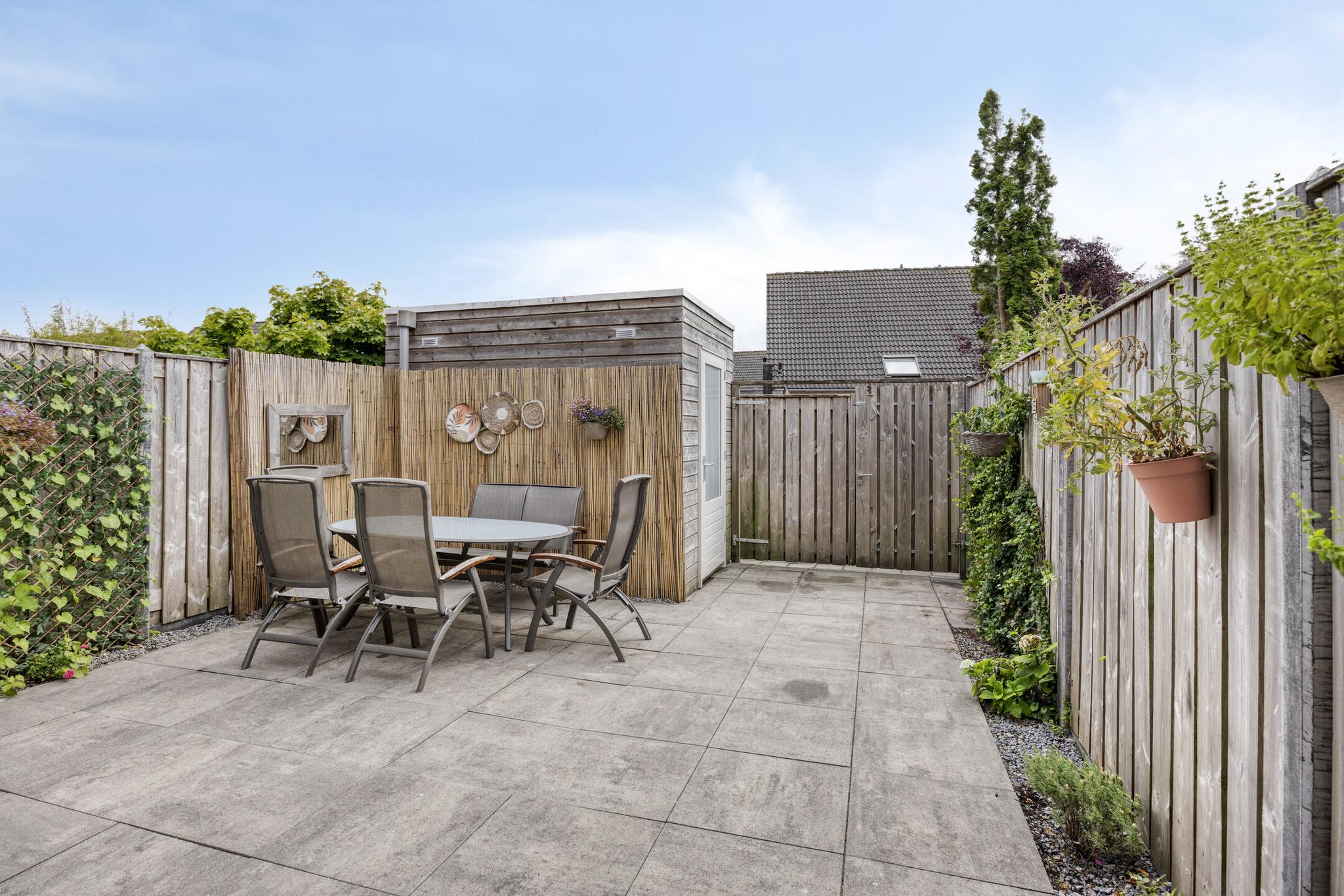 De zonnige, op het zuidwesten, gesitueerde achtertuin heeft een ruim terras met zeer goede bezonning! De tuin is voorzien van sierbestrating, siergrind en borders. Over de gehele breedte van de woning hangt een zonnescherm. Via de (dubbele) looppoort kun je naar de brandgang aan de achterzijde van de woning. De berging is 2.91 m lang en 1.99 m breed en voorzien van elektra.