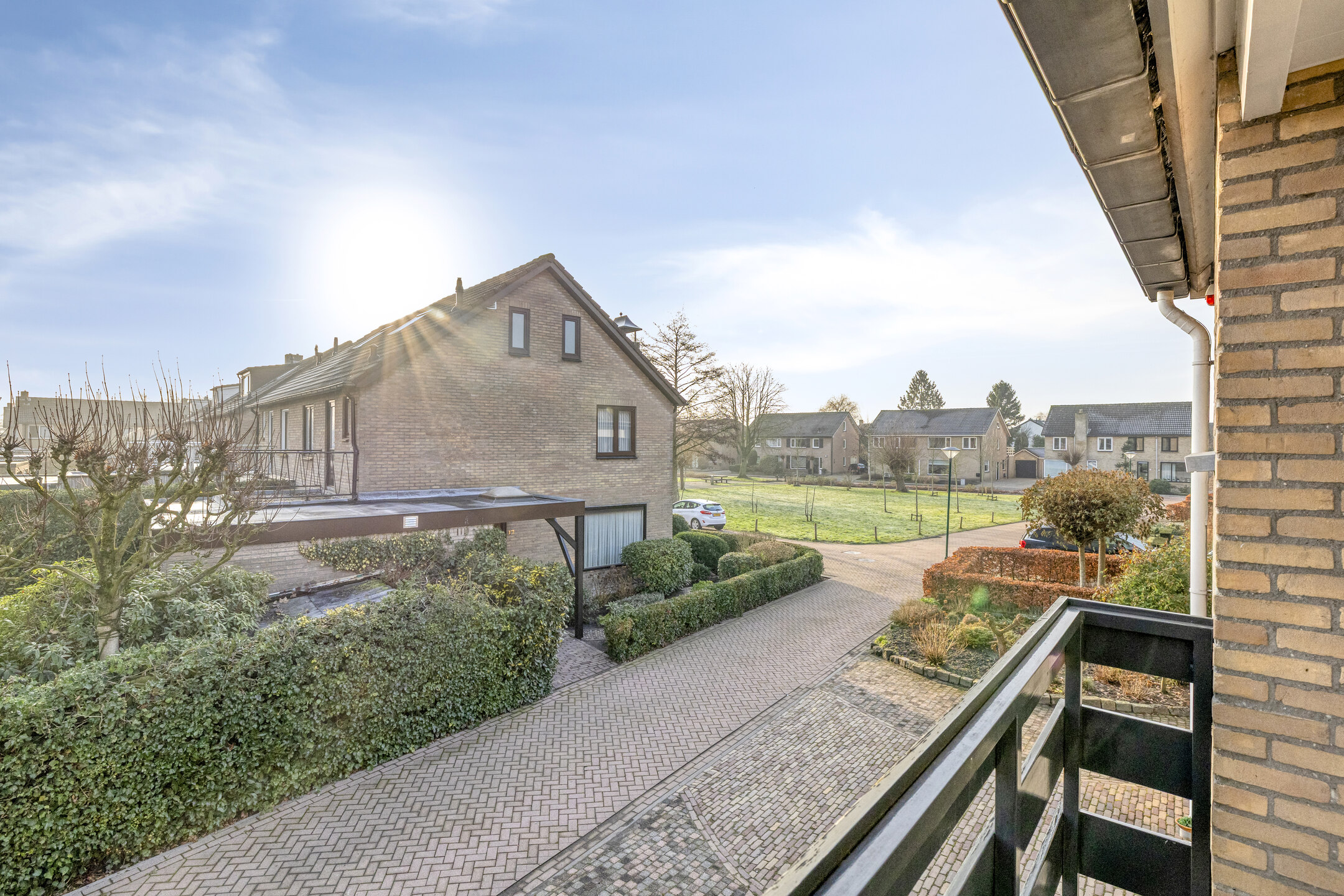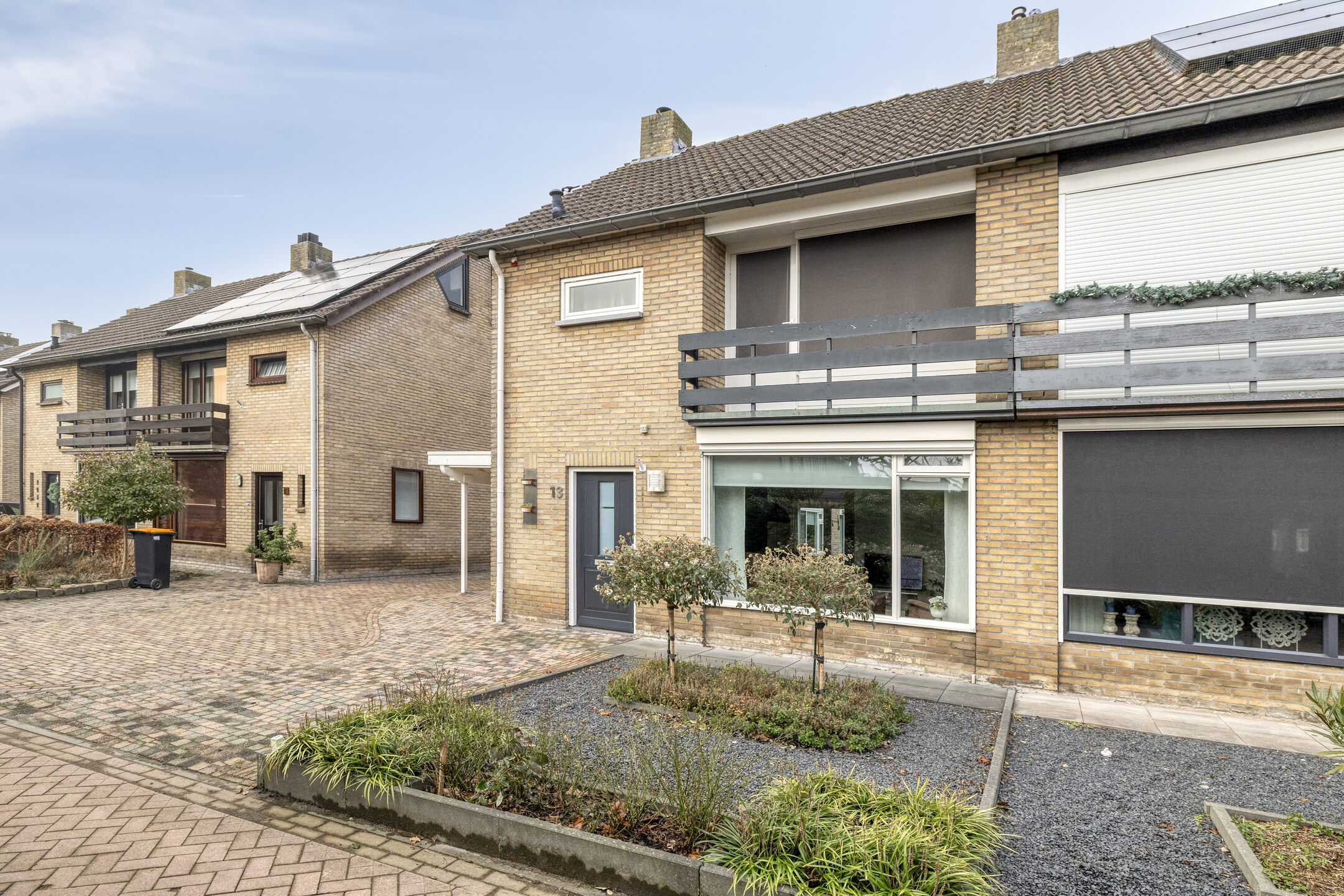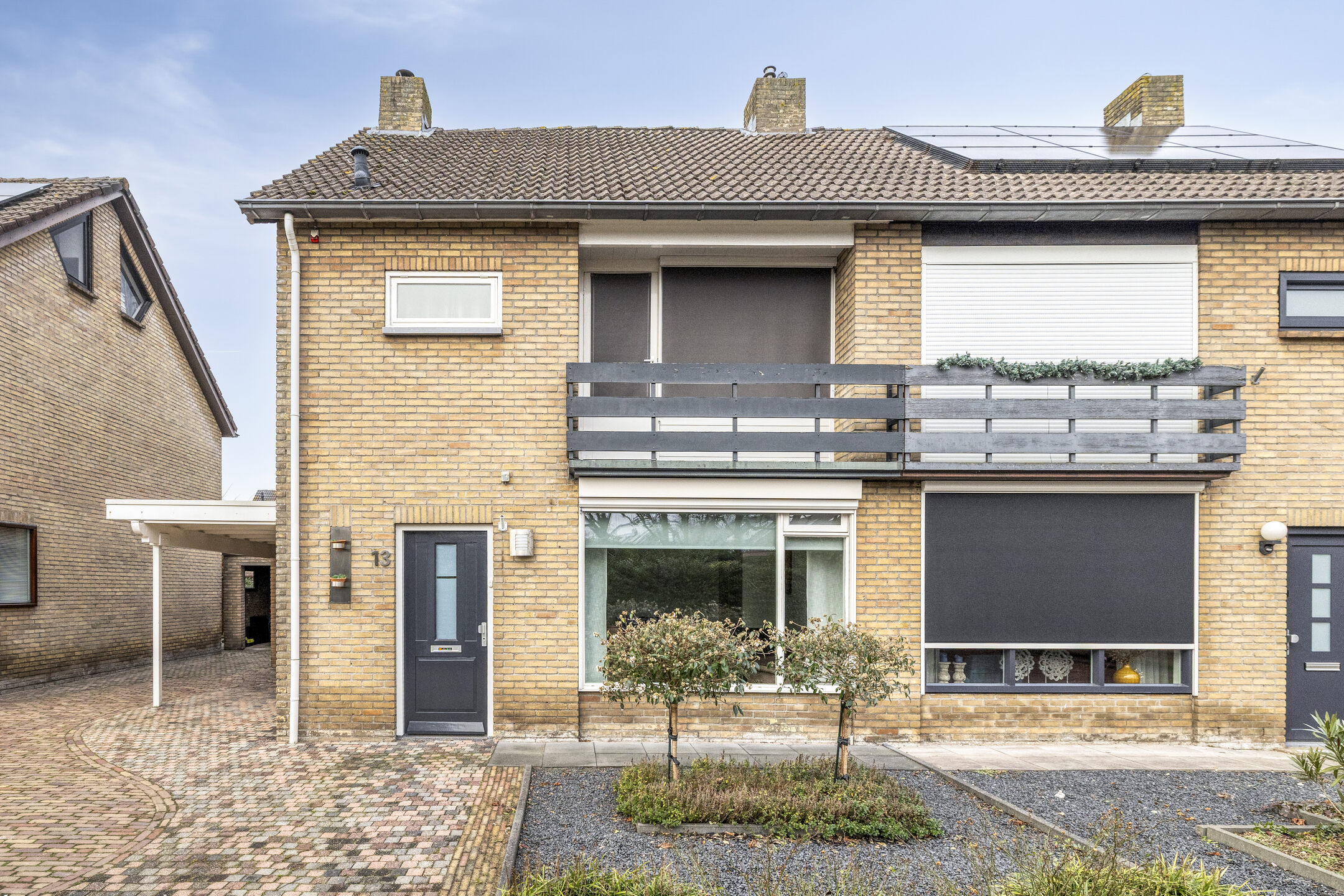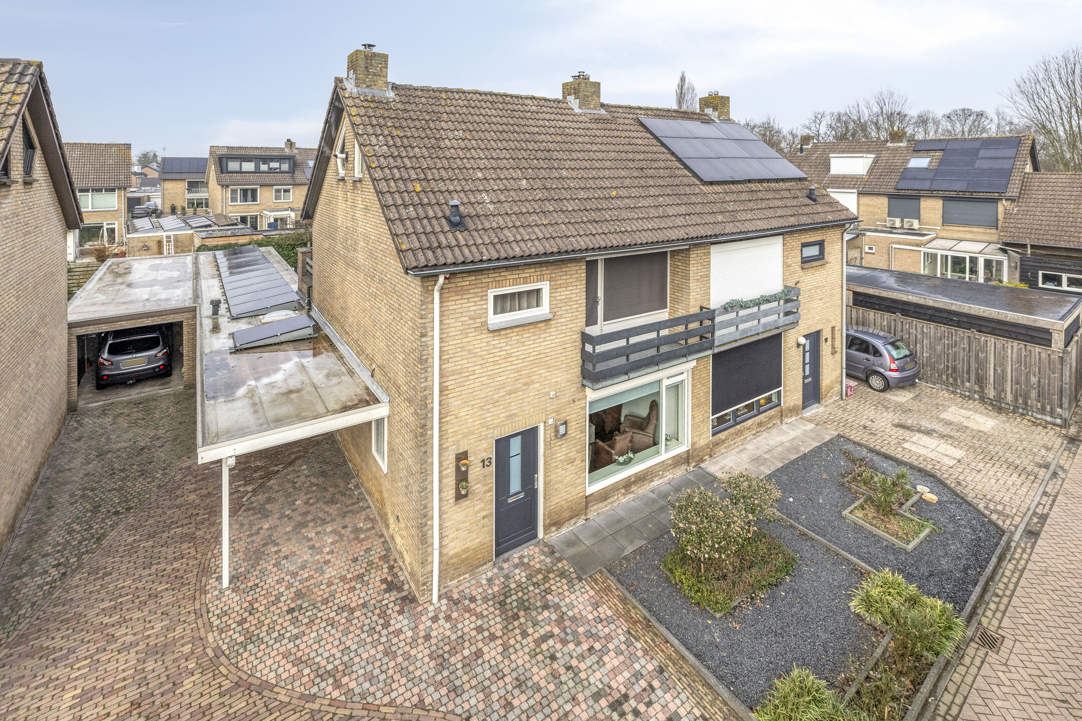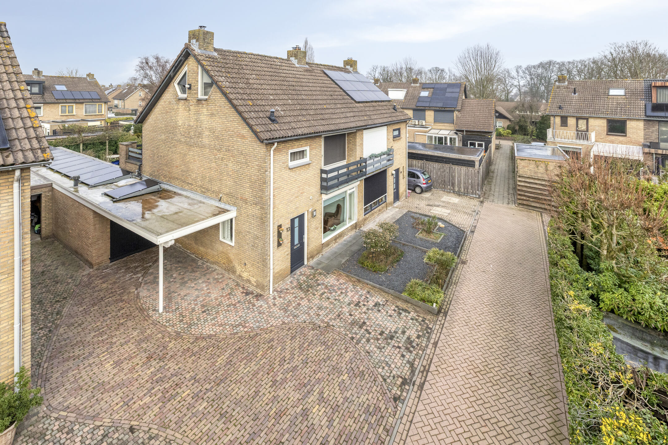 De oprit is aan de voorzijde volledig bestraat en verbreed. De auto kan onder de carport geparkeerd worden. De voortuin is voorzien van enkele planten en semiverharding.
