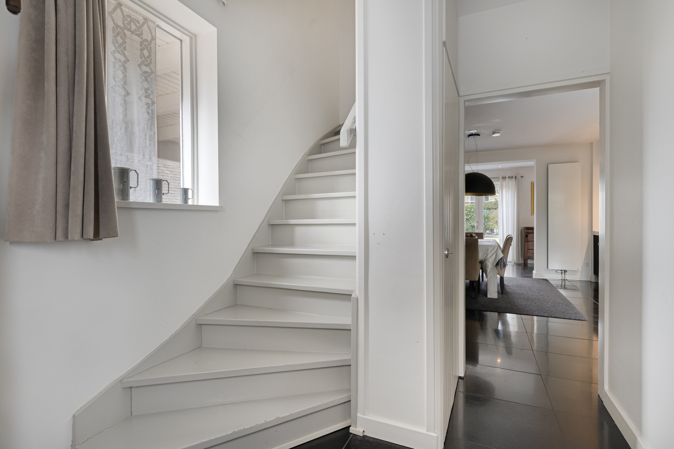 De voordeur bevindt zich aan de voorzijde van de woning. Je komt in de hal waar onder andere ruimte is voor de garderobe. In de hal is de meterkast gesitueerd voorzien van 1 hoofdschakelaar, 3 aardlekschakelaars, 11 lichtgroepen, 1 krachtgroep en een PV-groep. Er is een glasvezelaansluiting. Via de vaste trap ga je naar de 1e verdieping. Vanuit de hal kom je in de woonkamer met open keuken.