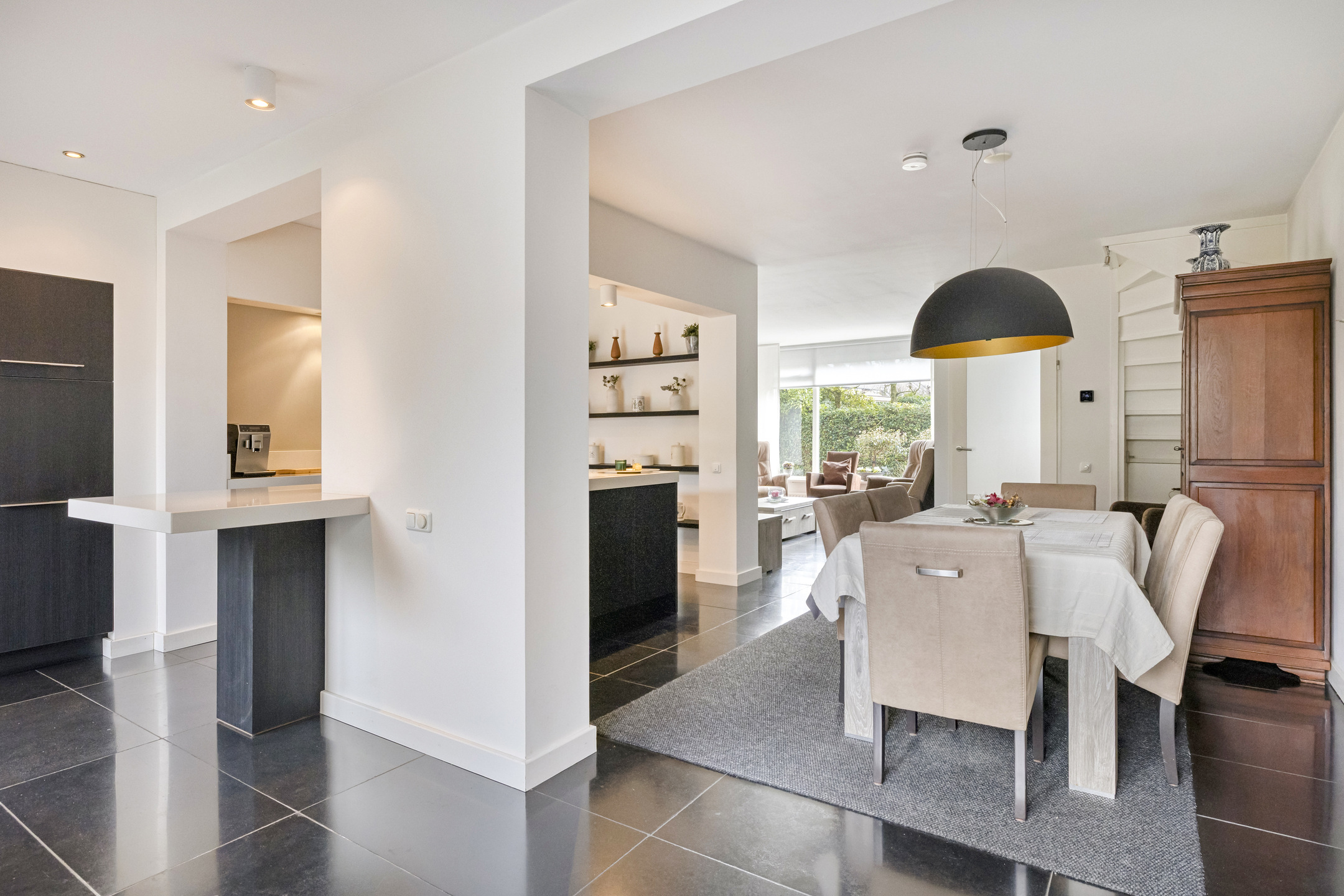 Het oppervlak van de woonkamer inclusief de open keuken is ca. 55 m² en heeft een gezellige Z-indeling. Aan de voorzijde is het zitgedeelte gesitueerd en de eetgedeelte aan de achterzijde. Centraal in het zitgedeelte is er een gashaard aanwezig. Aan de voorzijde is er een groot raam wat de ruimte heerlijk licht maakt. De tegelvloer van natuursteen is voorzien van vloerverwarming wat de kamer heerlijk comfort biedt. De woning is aan de achterzijde uitgebouwd.