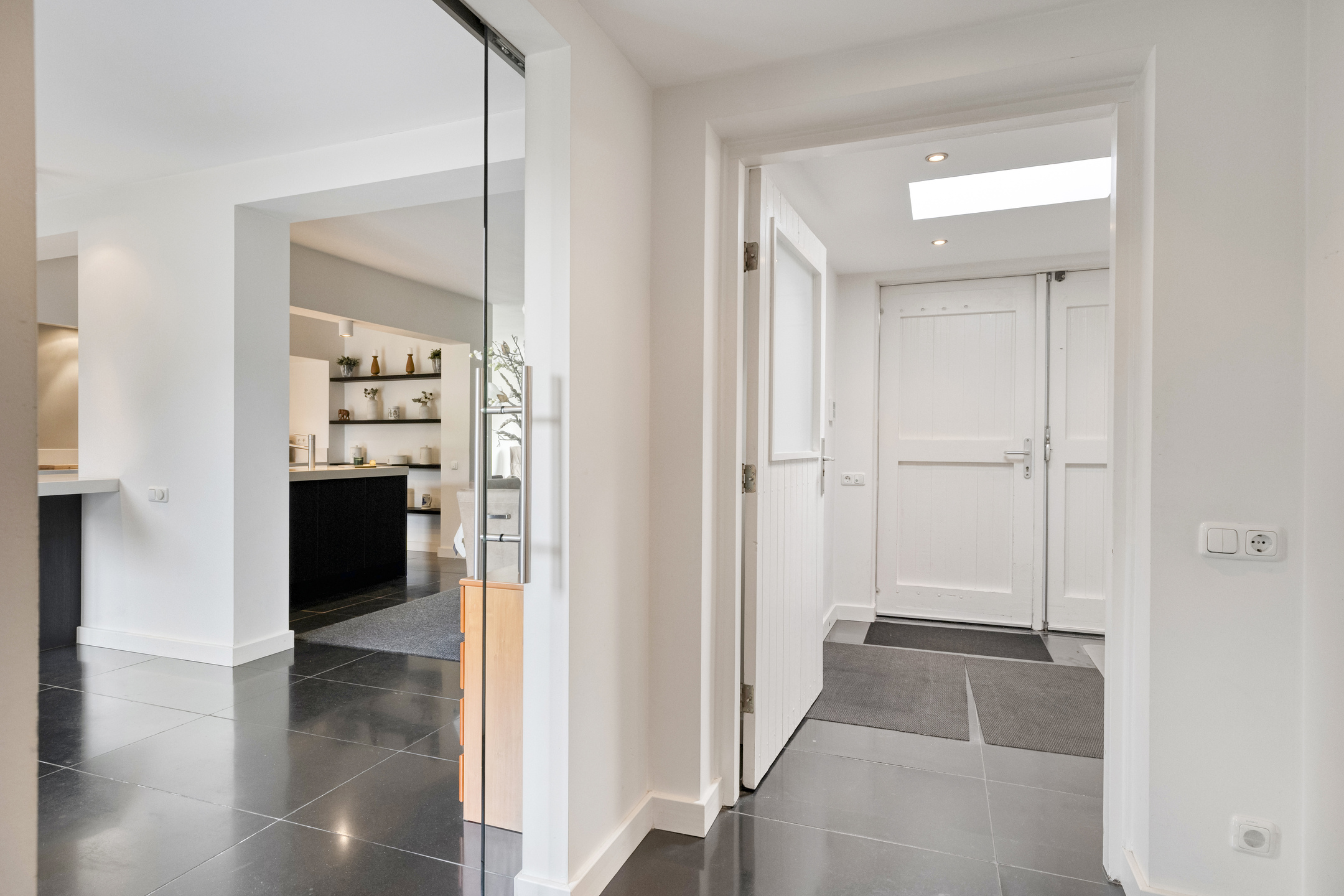 Via de glazendeur schuifdeur in de uitbouw kom je in de hal waar onder andere het toilet is gesitueerd.