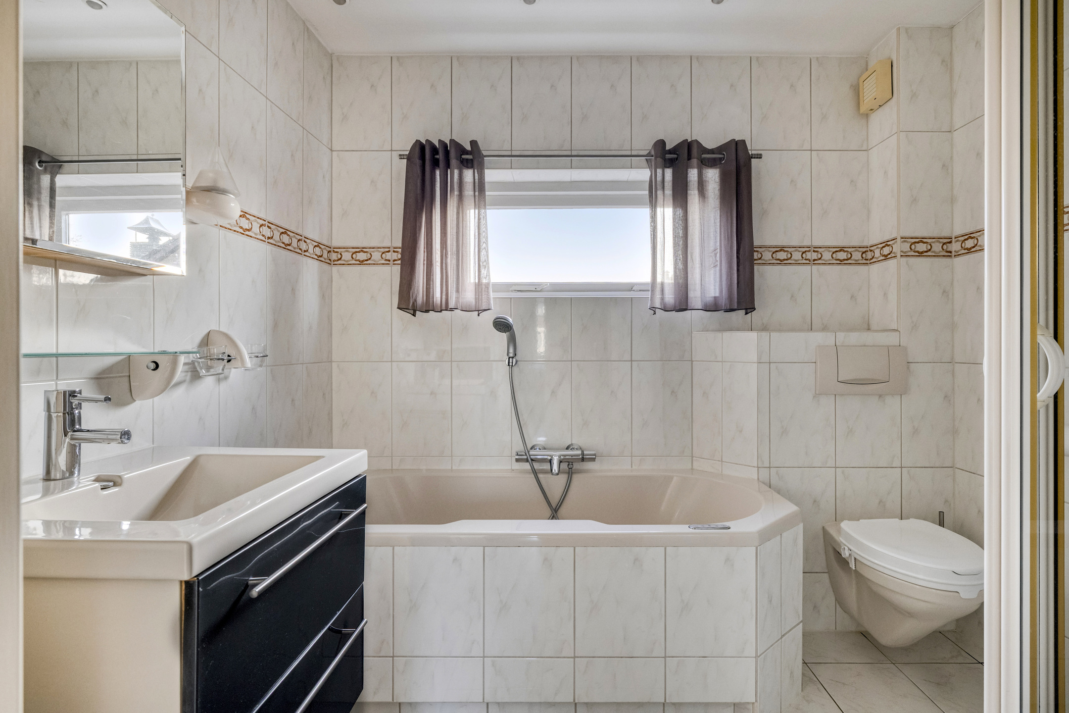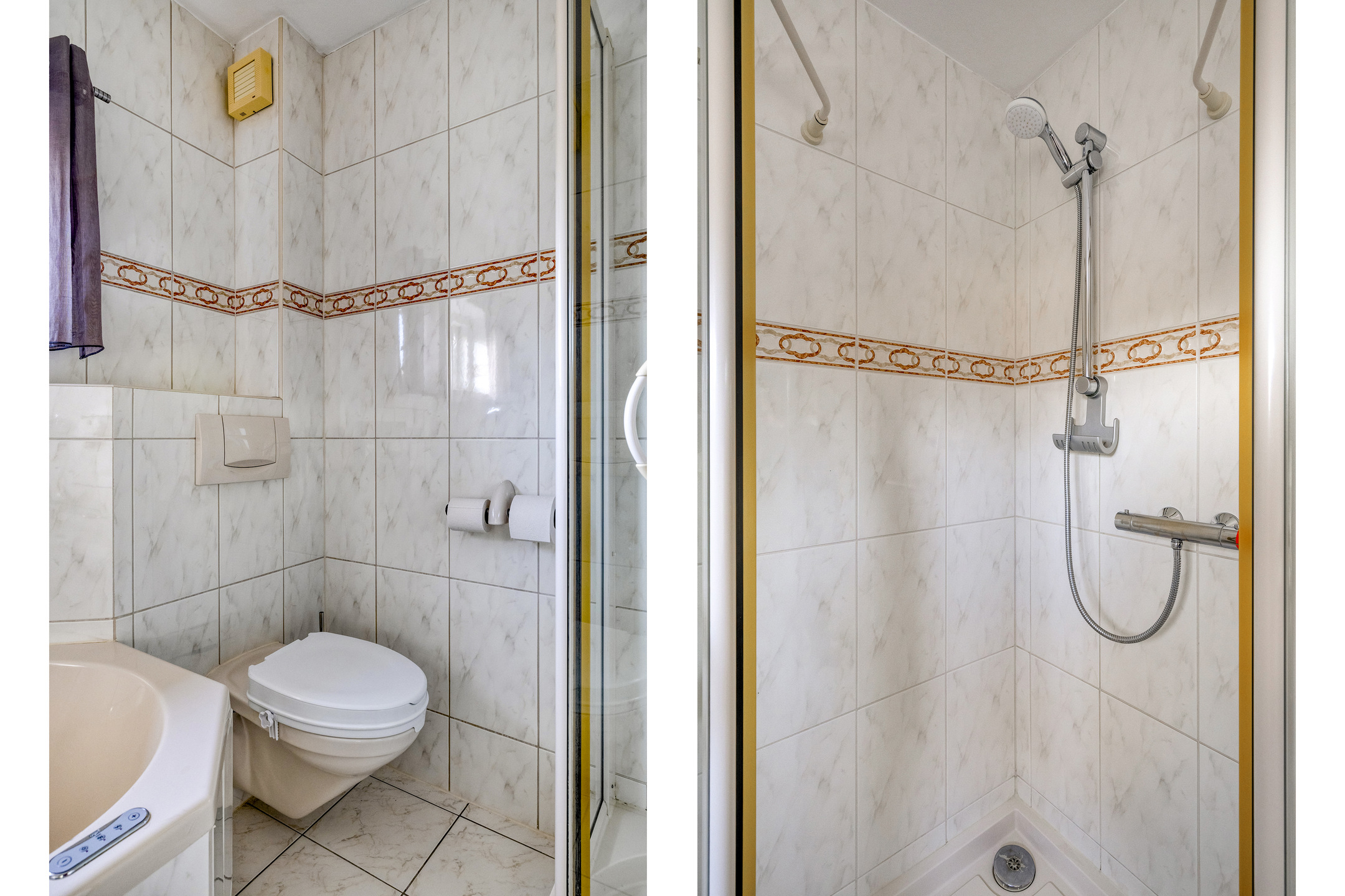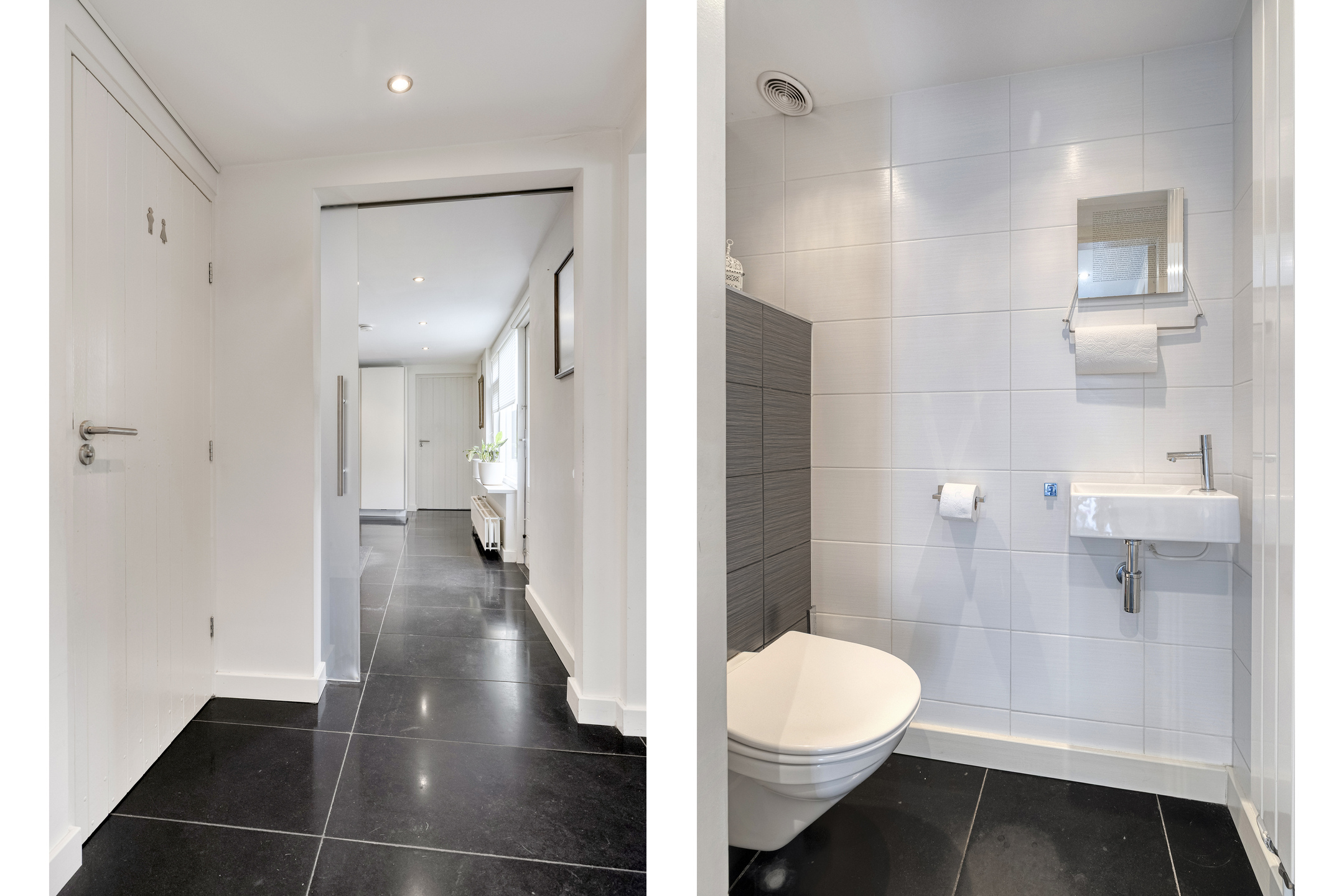 Het toilet is volledig betegeld en voorzien van een hangcloset en een fonteintje.