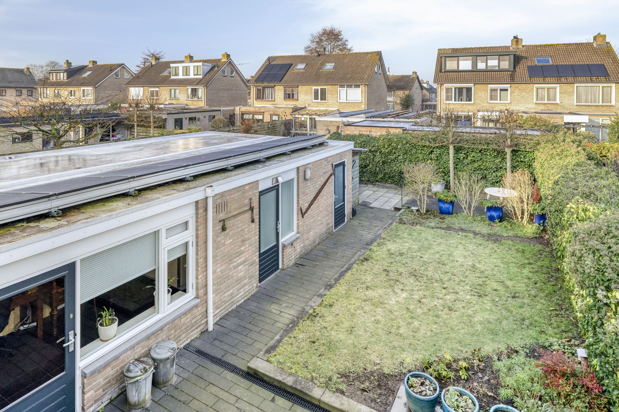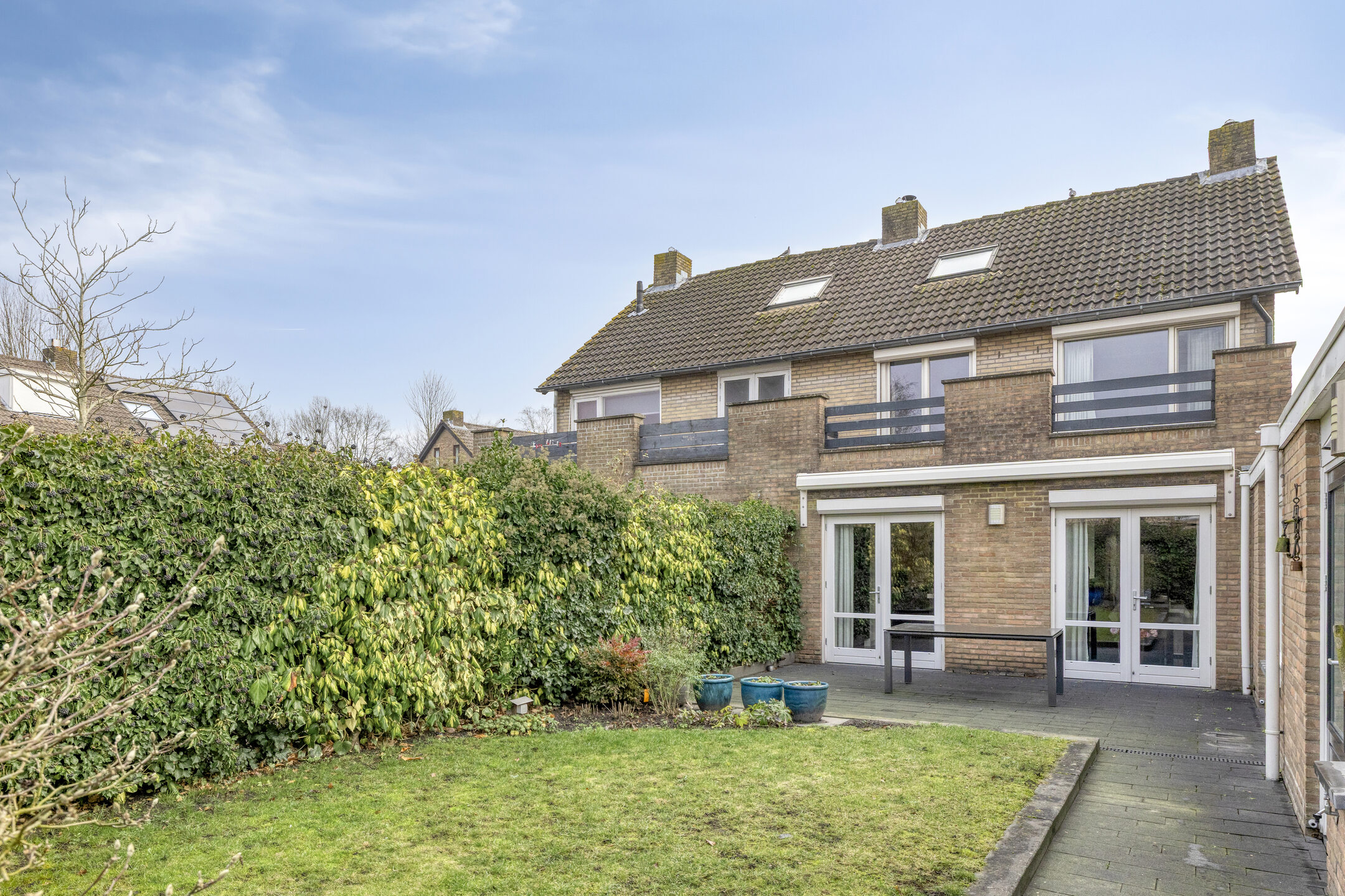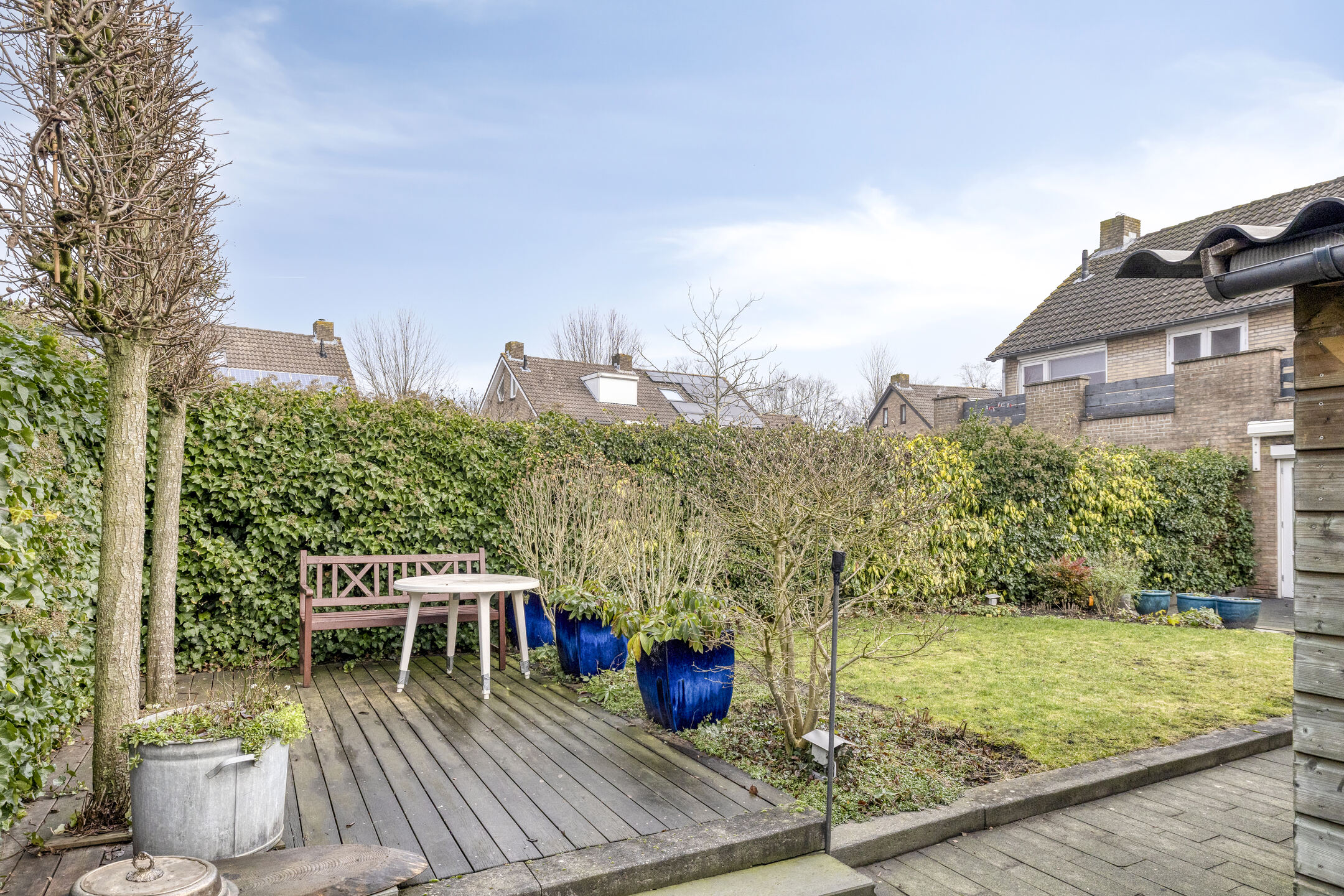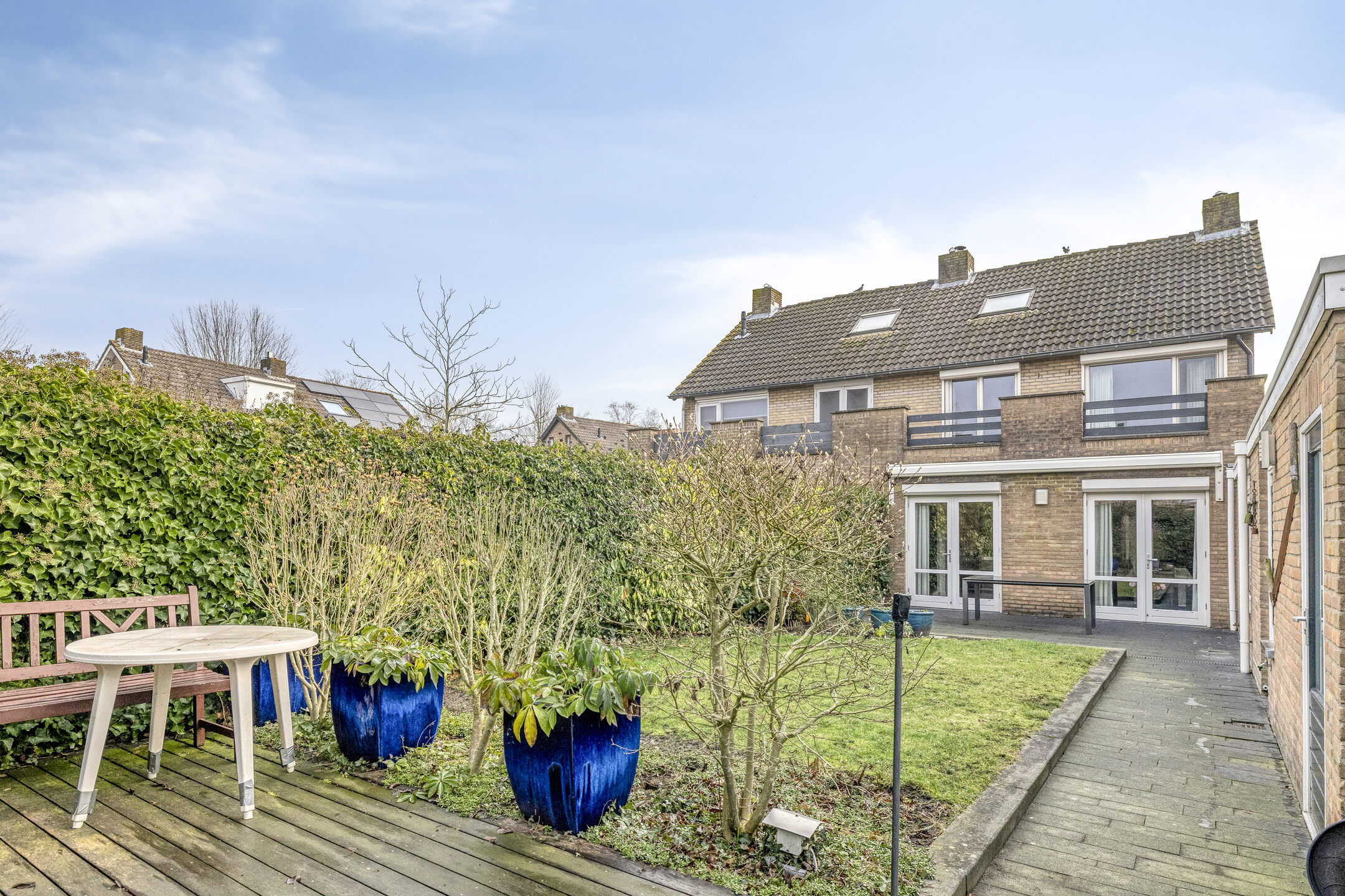 De achtertuin heeft een bestraat terras direct achter de woning als ook achter in de tuin een terras van houten vlonders. Er zijn diverse planten en struiken aanwezig als ook een gazon. De leibomen achter in de tuin zorgen voor extra privacy in de tuin. De tuin is op het westen gelegen.