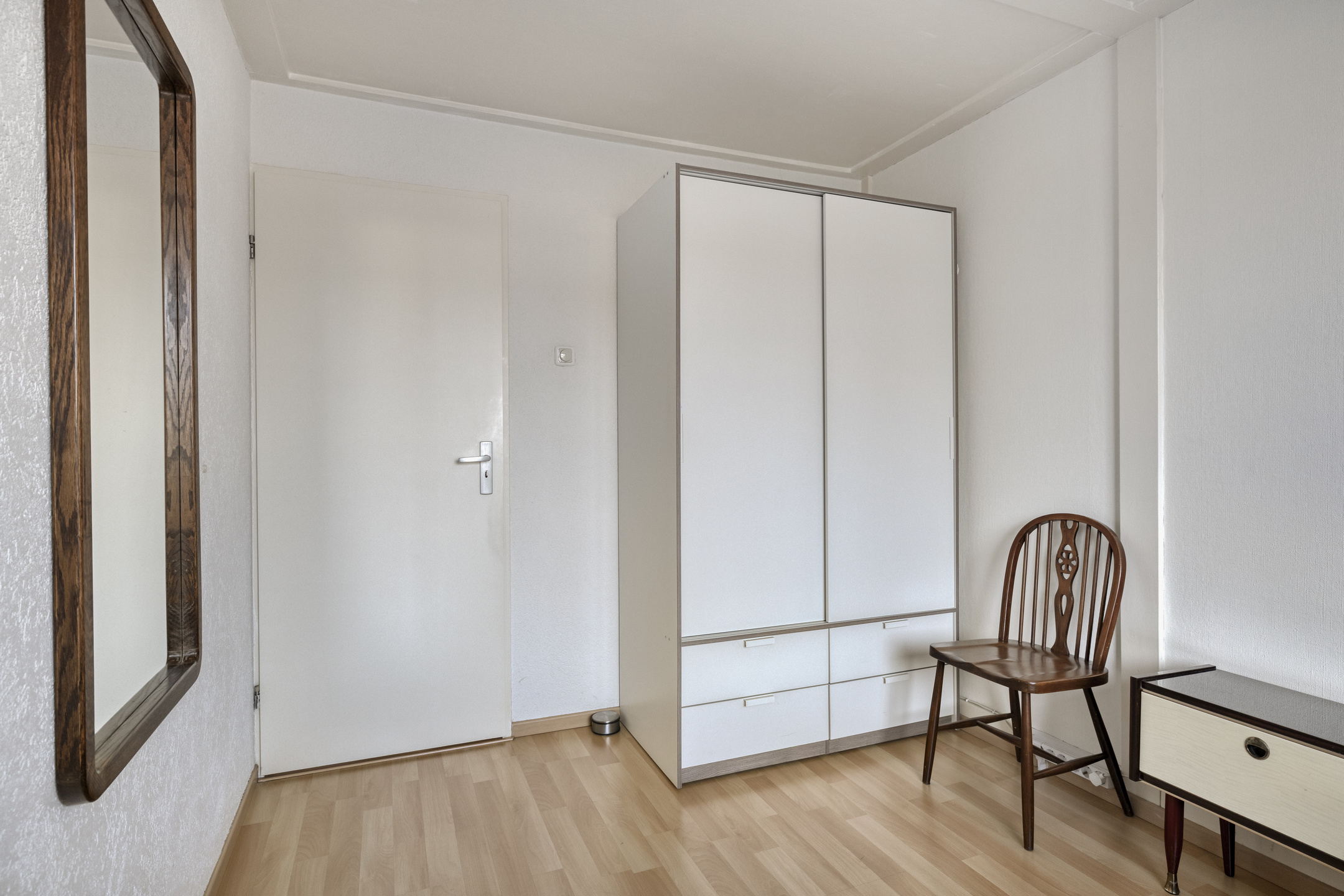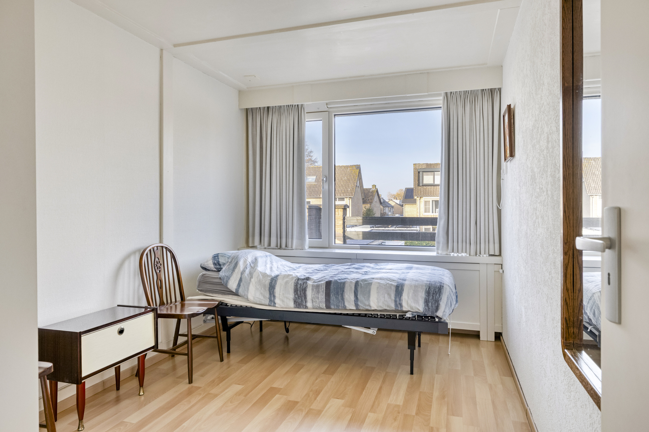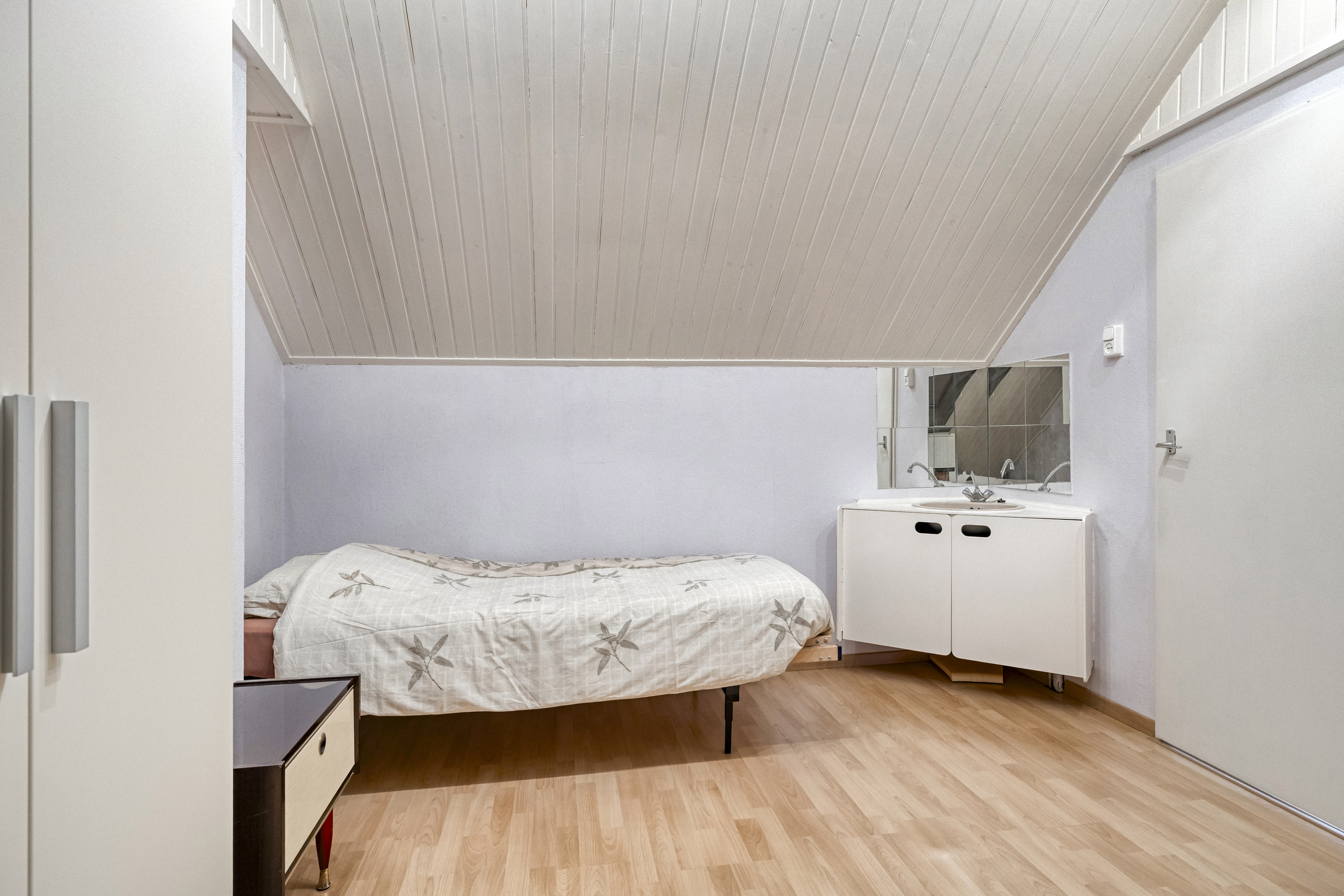 Vanuit de voorzolder kom je in de vierde slaapkamer. Het Veluxraam zorgt voor voldoende licht op deze kamer. In de hoek staat een wastafelmeubel welke voorzien is van koud- en warmwater.