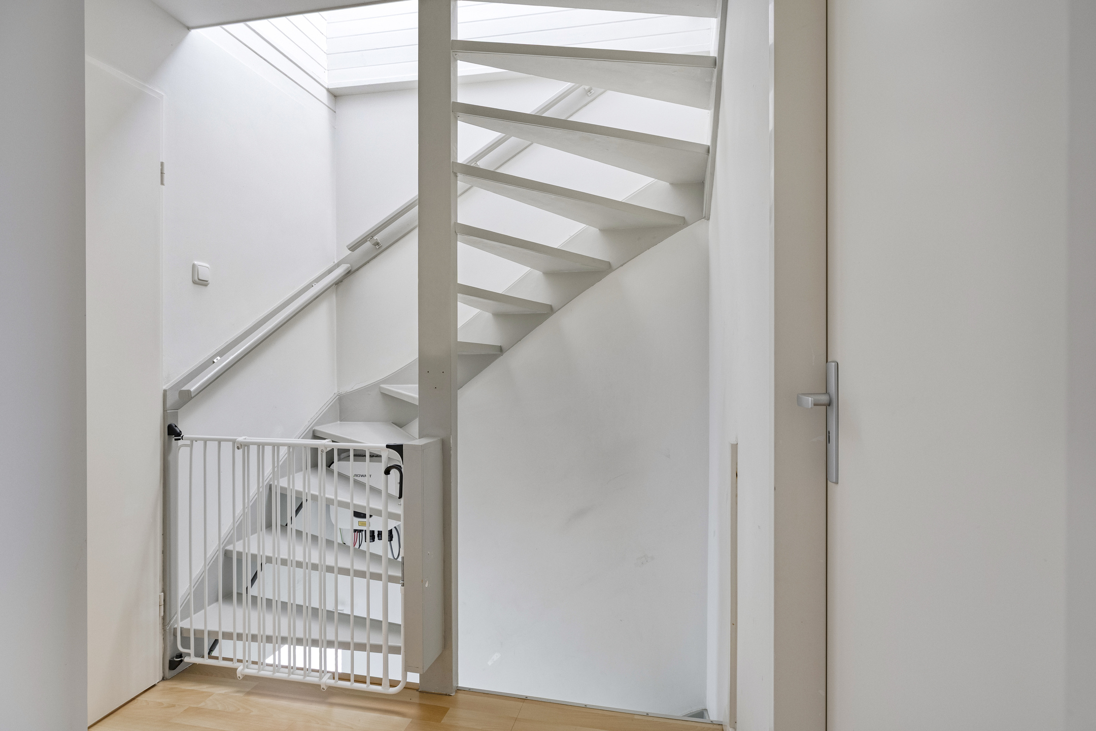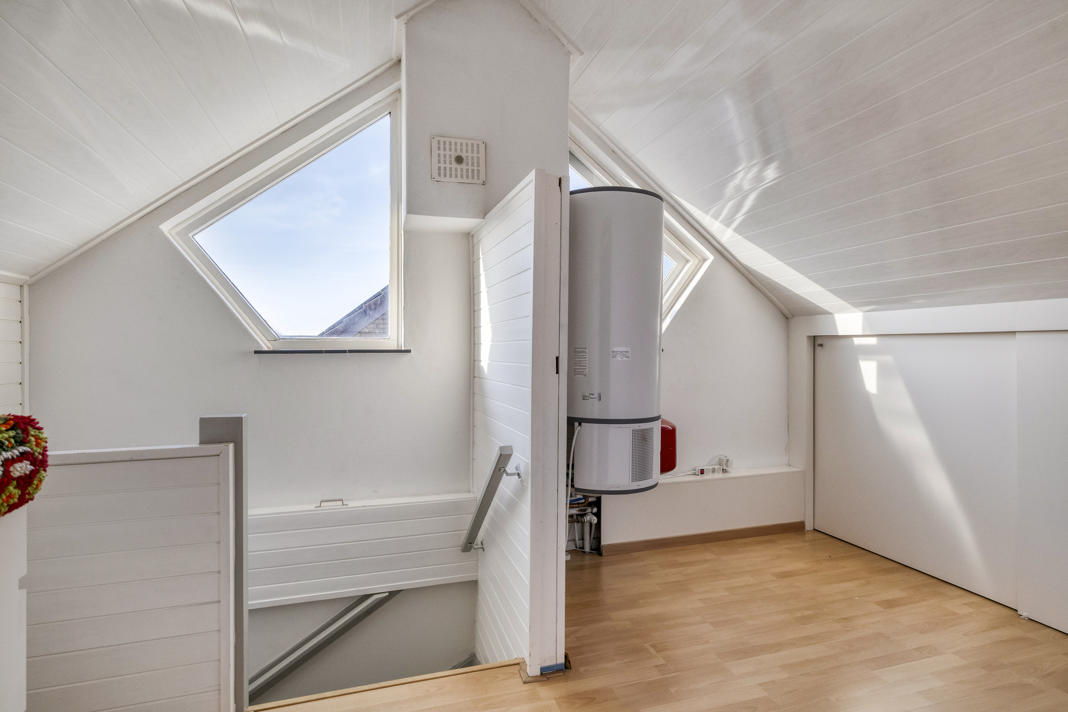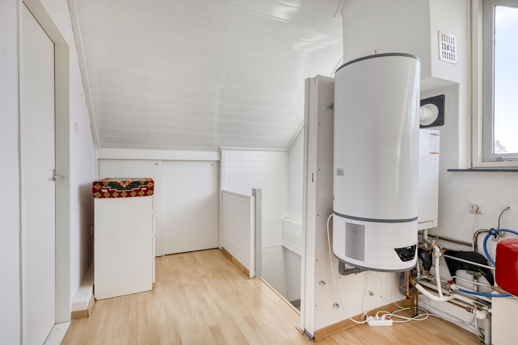 Via een vaste trap is de tweede verdieping bereikbaar. Je komt op de overloop/voorzolder. Hier is ook de CV-combiketel (Atag 2022) met een warmtepomp boiler. In de knieschotten zijn schuifdeurtjes met extra bergruimte.