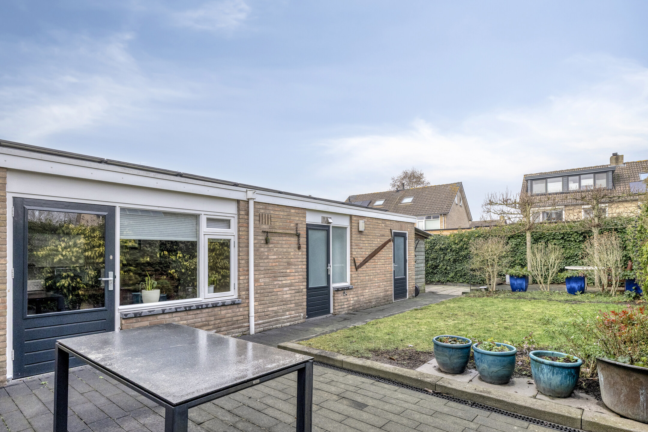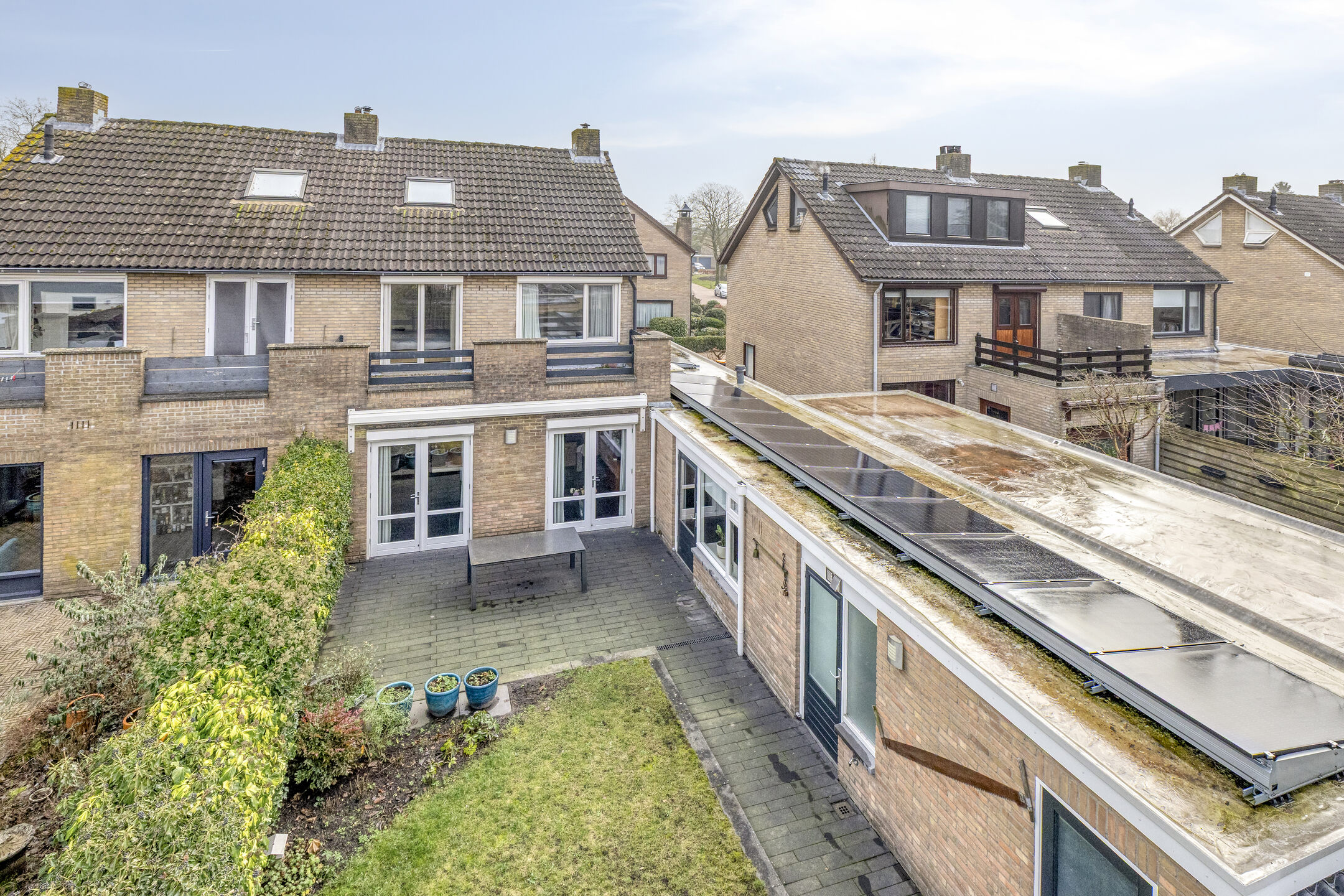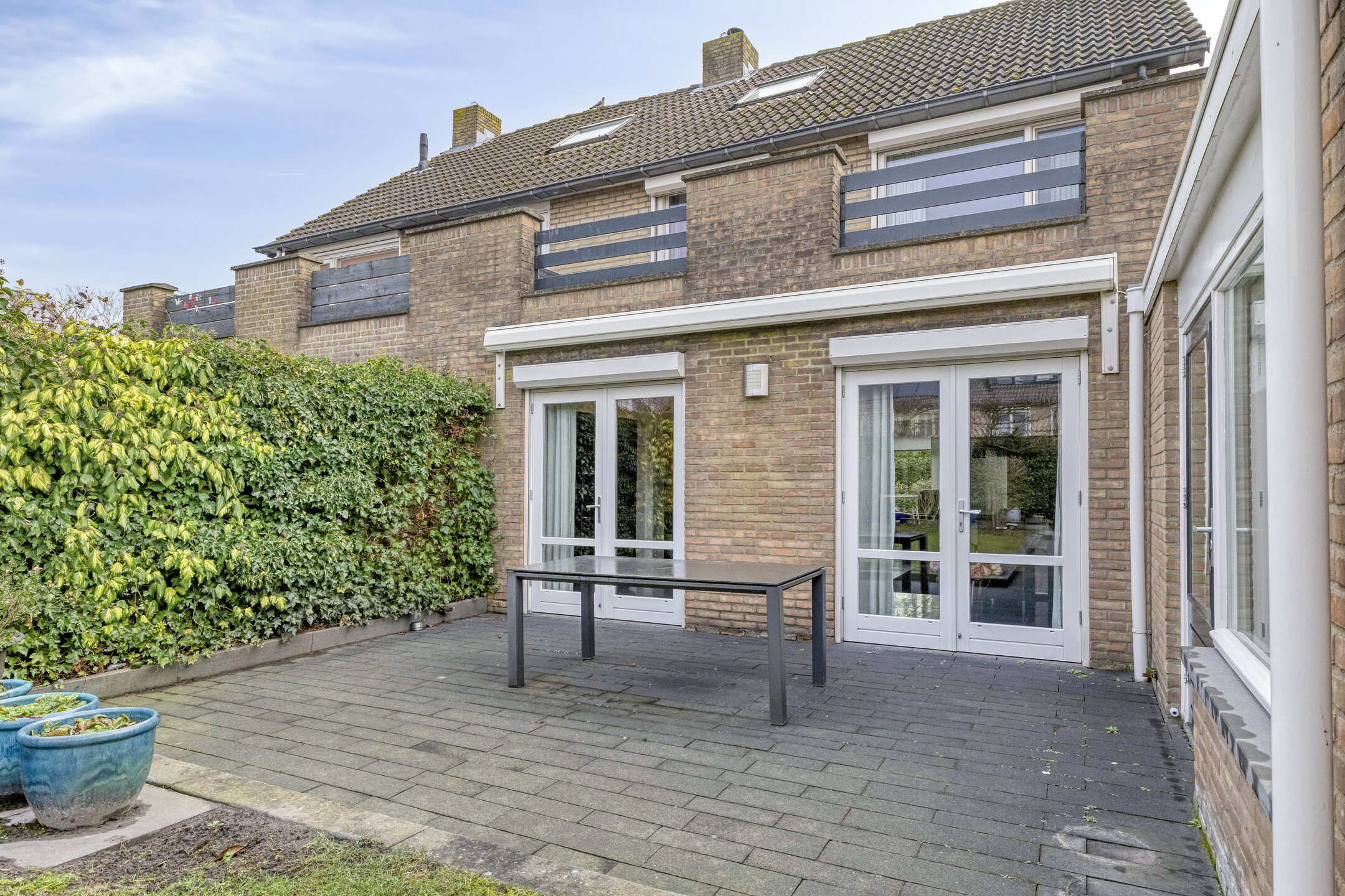 Aan de achterkant zijn twee dubbele tuindeuren welke toegang geven naar het terras.