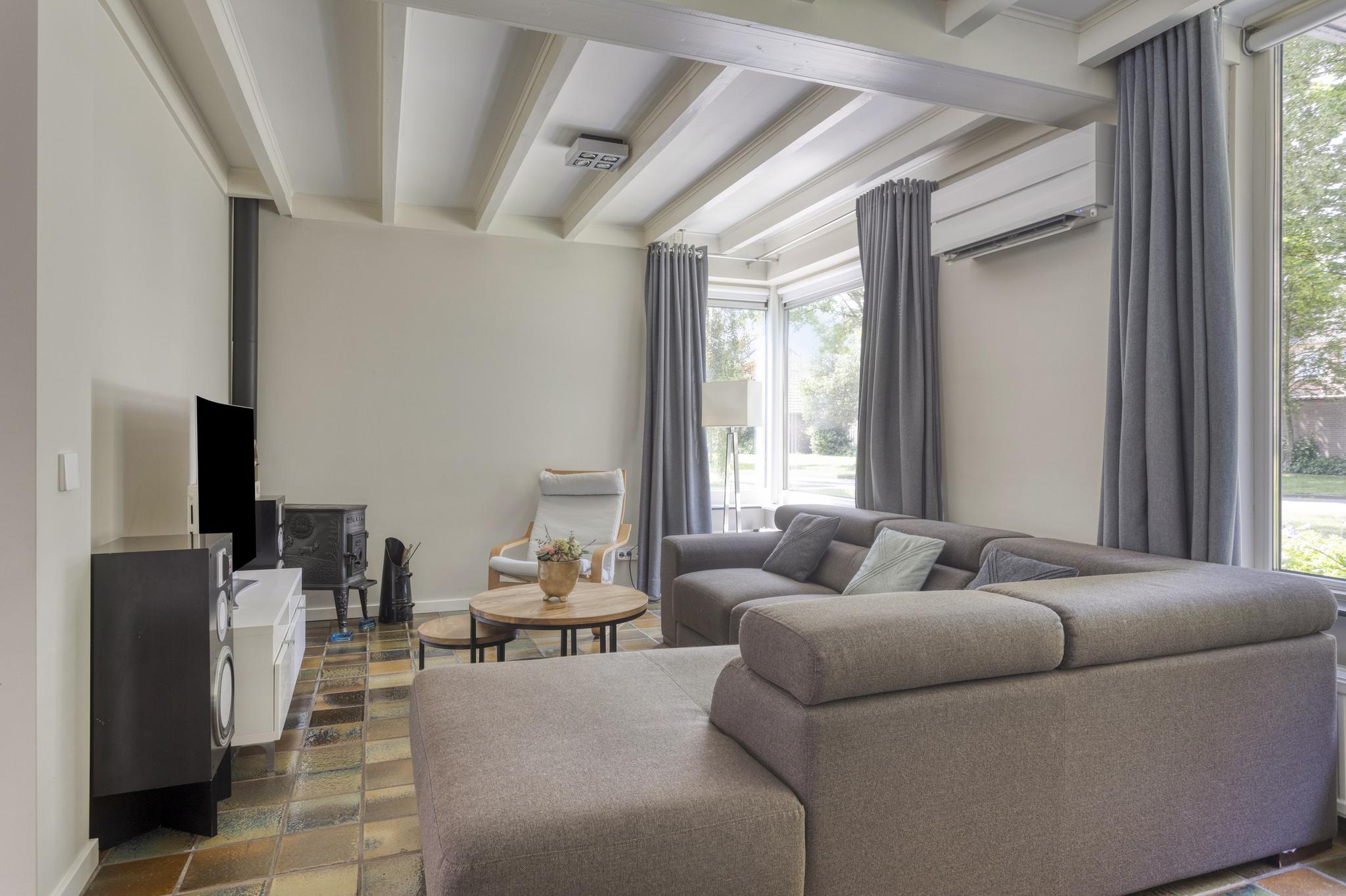 De sfeervolle, L-vormige woonkamer is maar liefst 36 m² groot en voorzien van een houtkachel die ervoor zorgt dat de woonkamer een heerlijke plek is om ’s avonds te zitten. De grote raampartijen en met name het hoekraam zorgt voor veel lichtinval. Aan de achterzijde van de woonkamer is de deur naar de keuken als ook de dubbele ensuite deuren naar de serre. Naast de houtkachel is er ook een airco aanwezig.