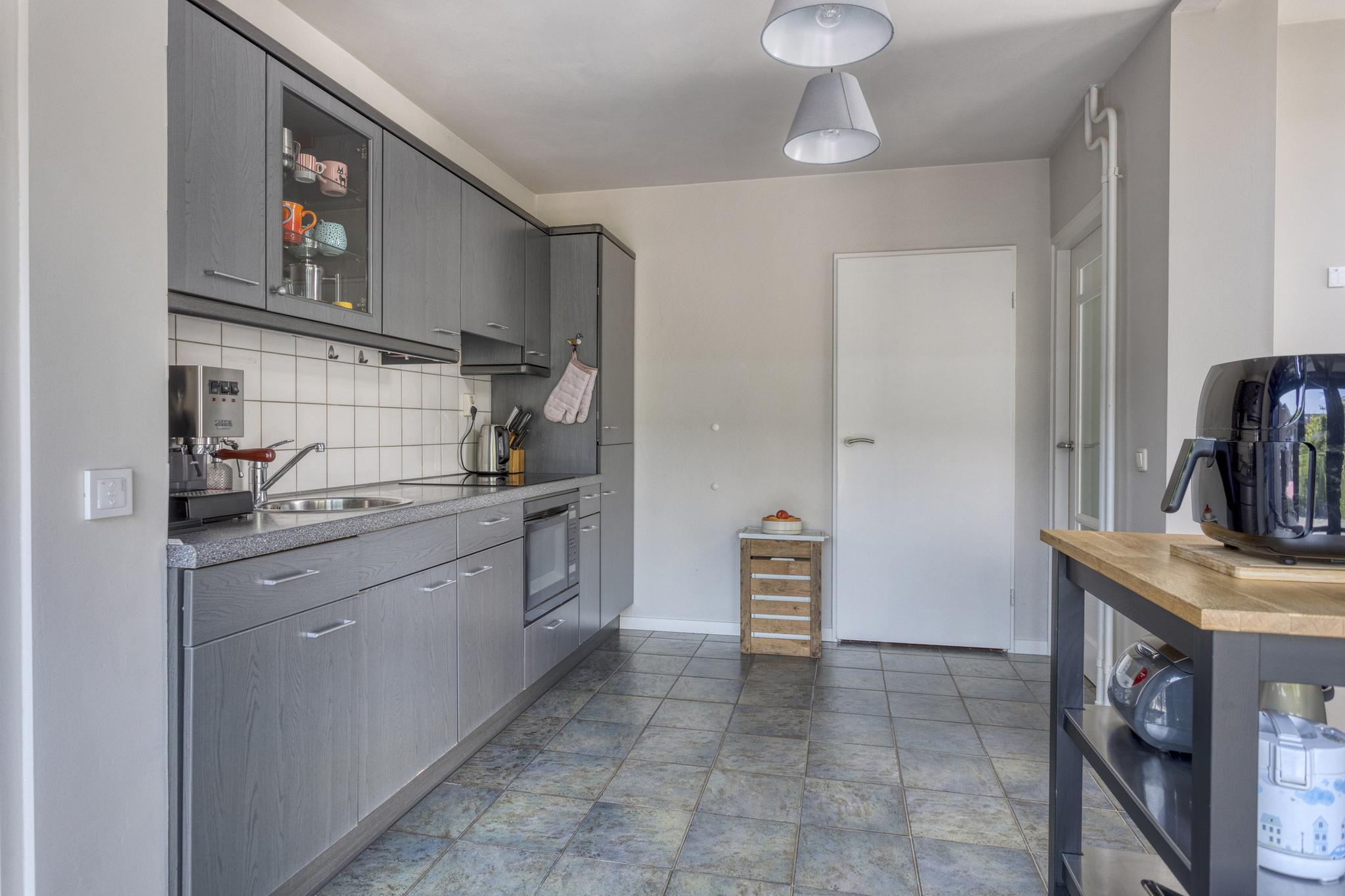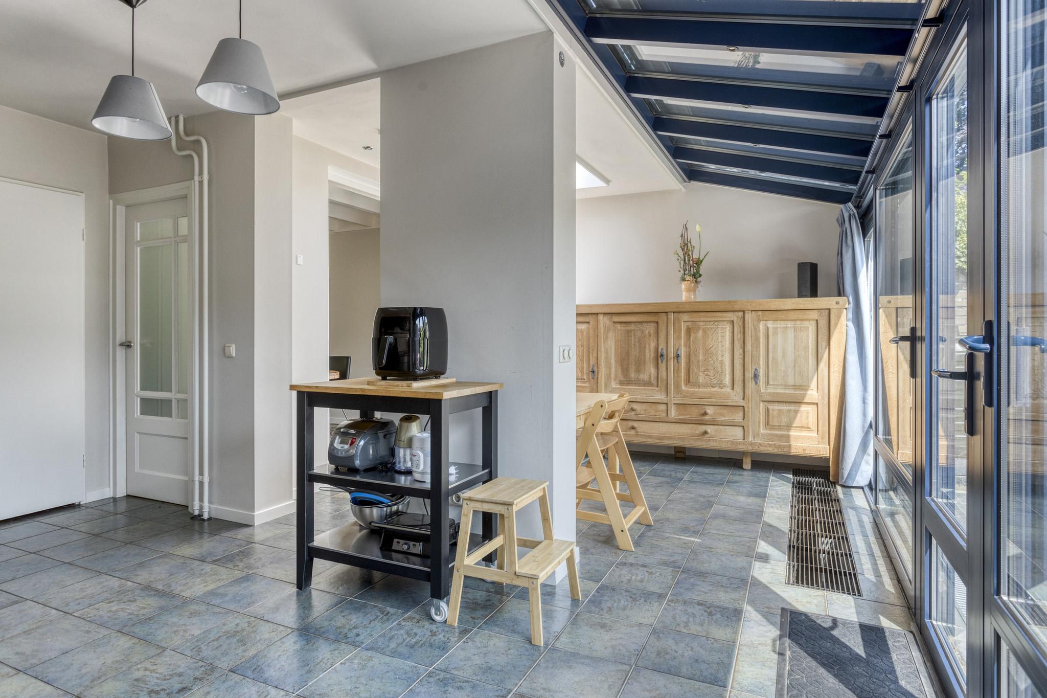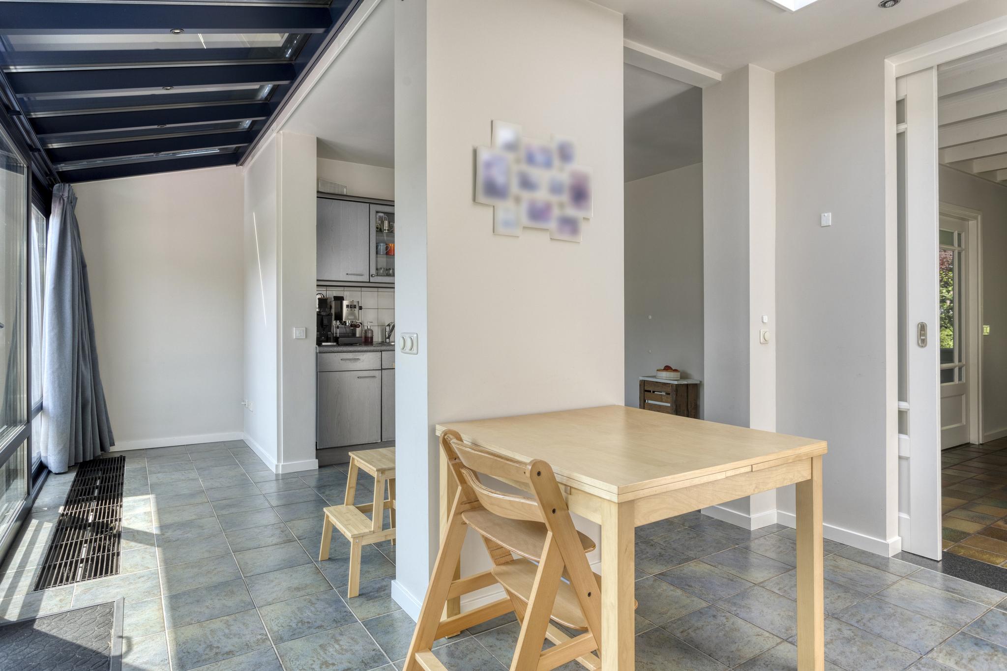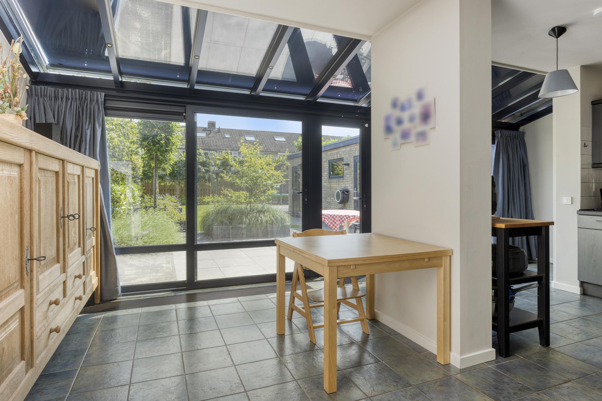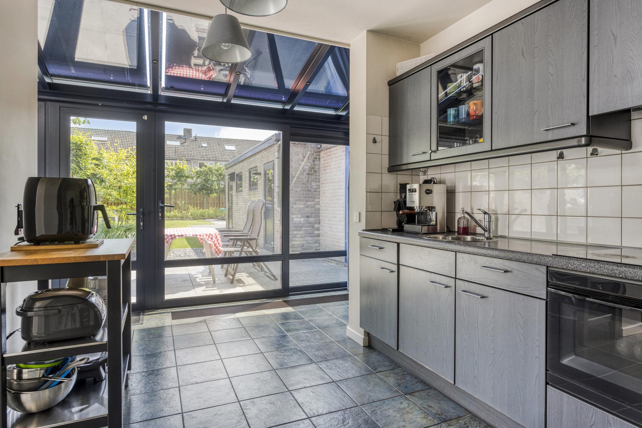 Achter de sfeervolle ensuite-deuren bevindt zich de tuinkamer met aangrenzende keuken – een lichte, gezellige ruimte waar binnen en buiten naadloos in elkaar overlopen. De lichtstraat zorgt ook hier voor veel lichtinval. De aluminium achterpui met een grote raampartij en loopdeur geeft een leuk tuincontact. De wandkeuken is uitgerust met een vaatwasser, een 4 pits inductiekookplaat, een combioven en een koelkast. Er zijn voldoende boven- en onderkasten. In het werkblad is een RVS spoelbak aanwezig. In de keuken is er een inbouwkast voor extra opslagruimte.