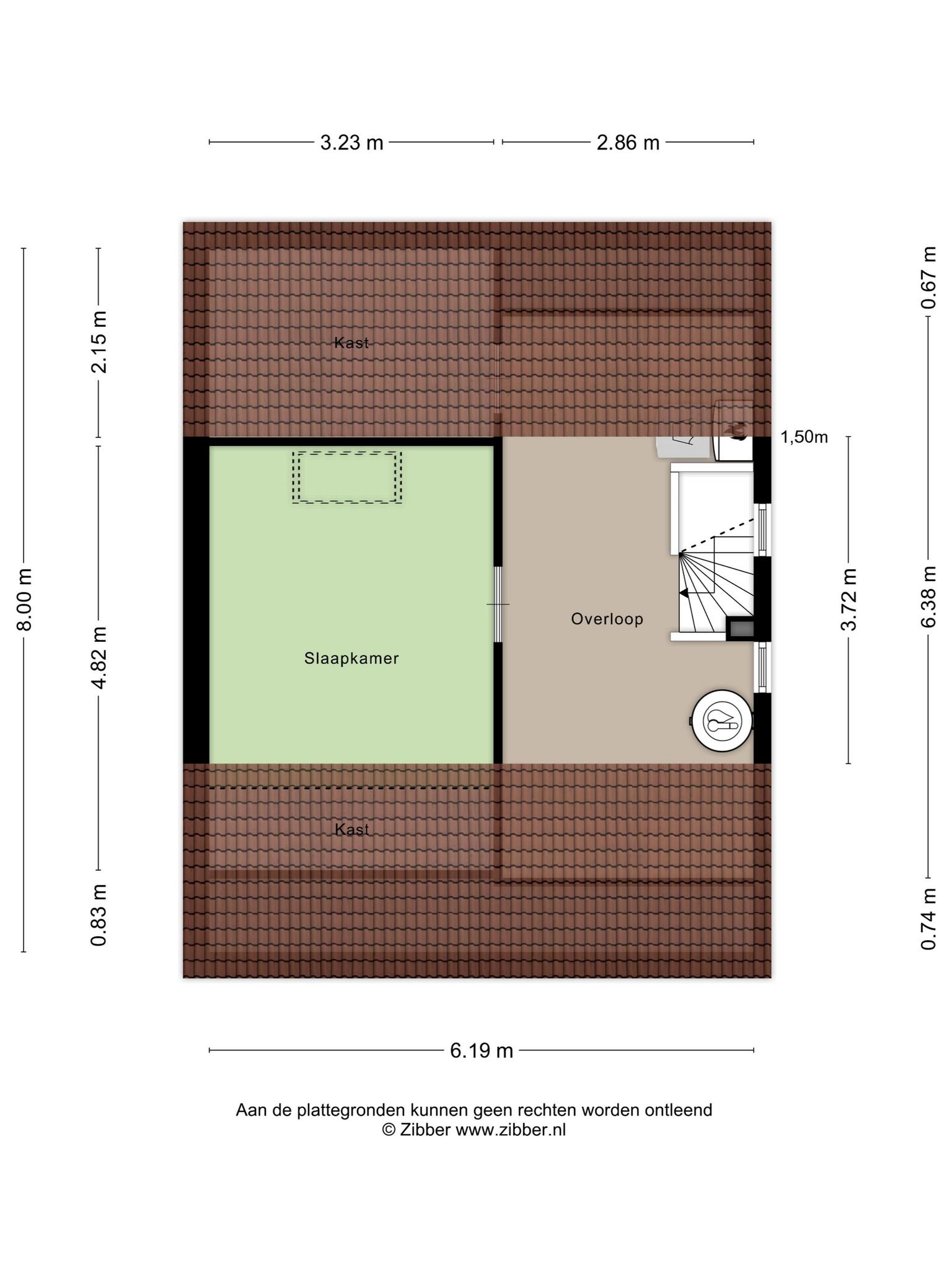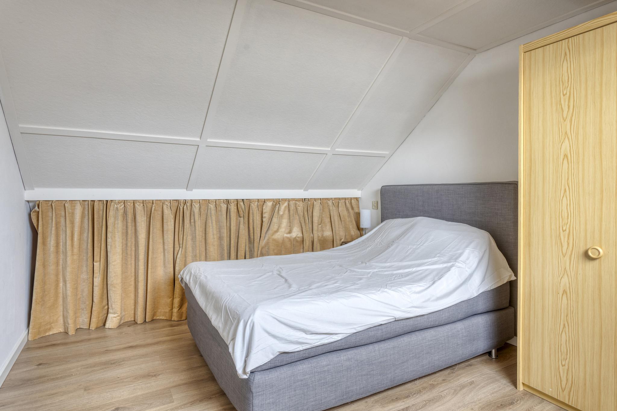De slaapkamer heeft een groot Velux dakraam en is ca. 3.23 x 4.82 m groot.