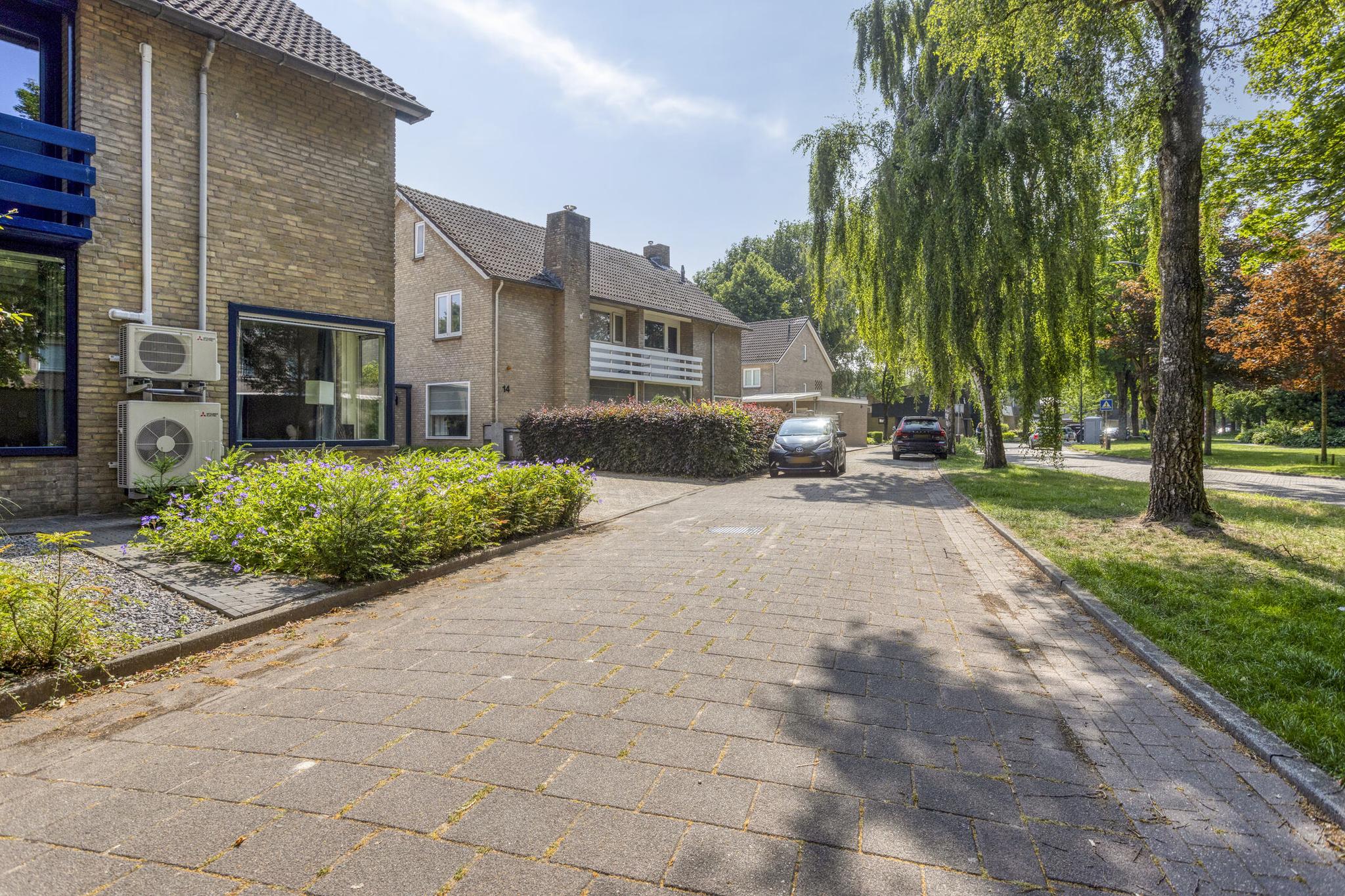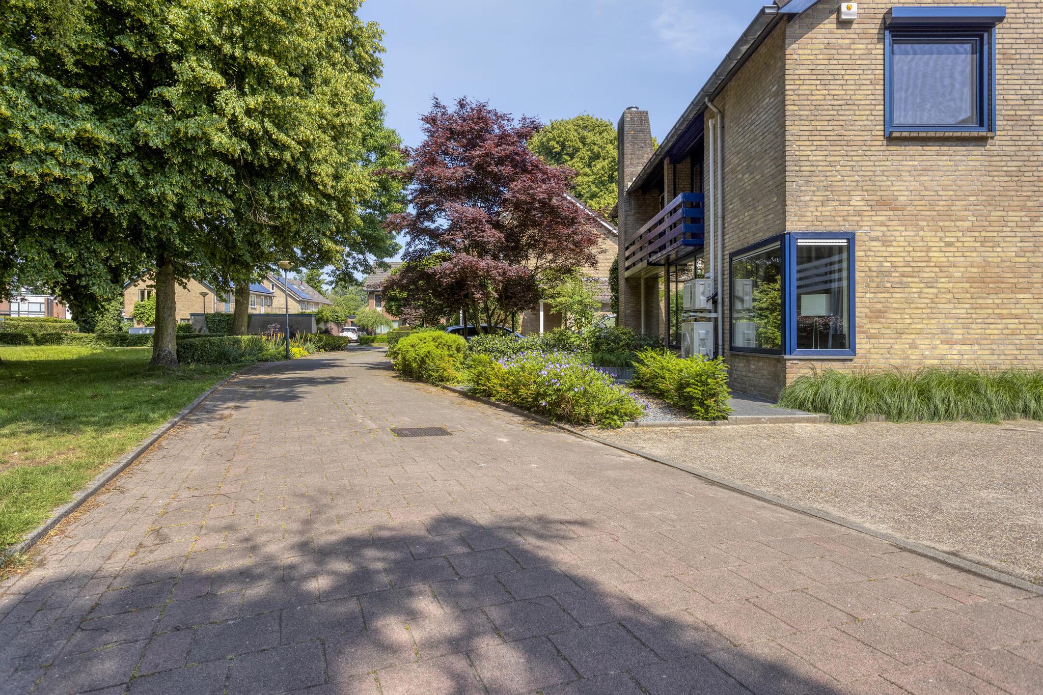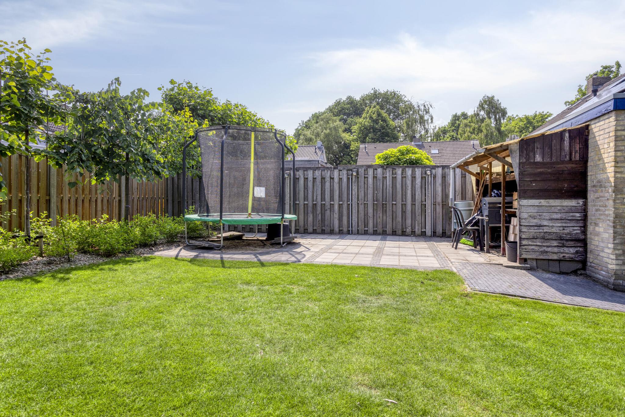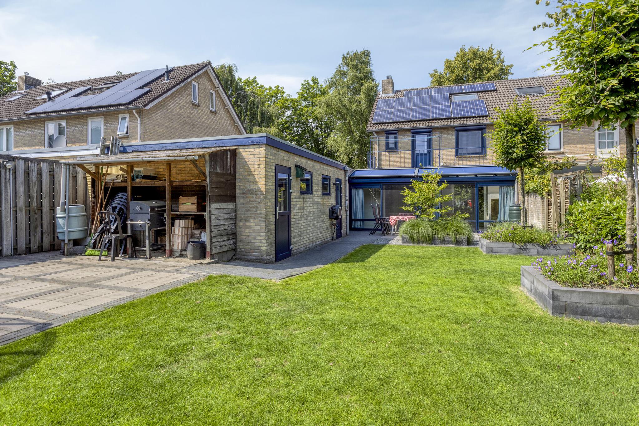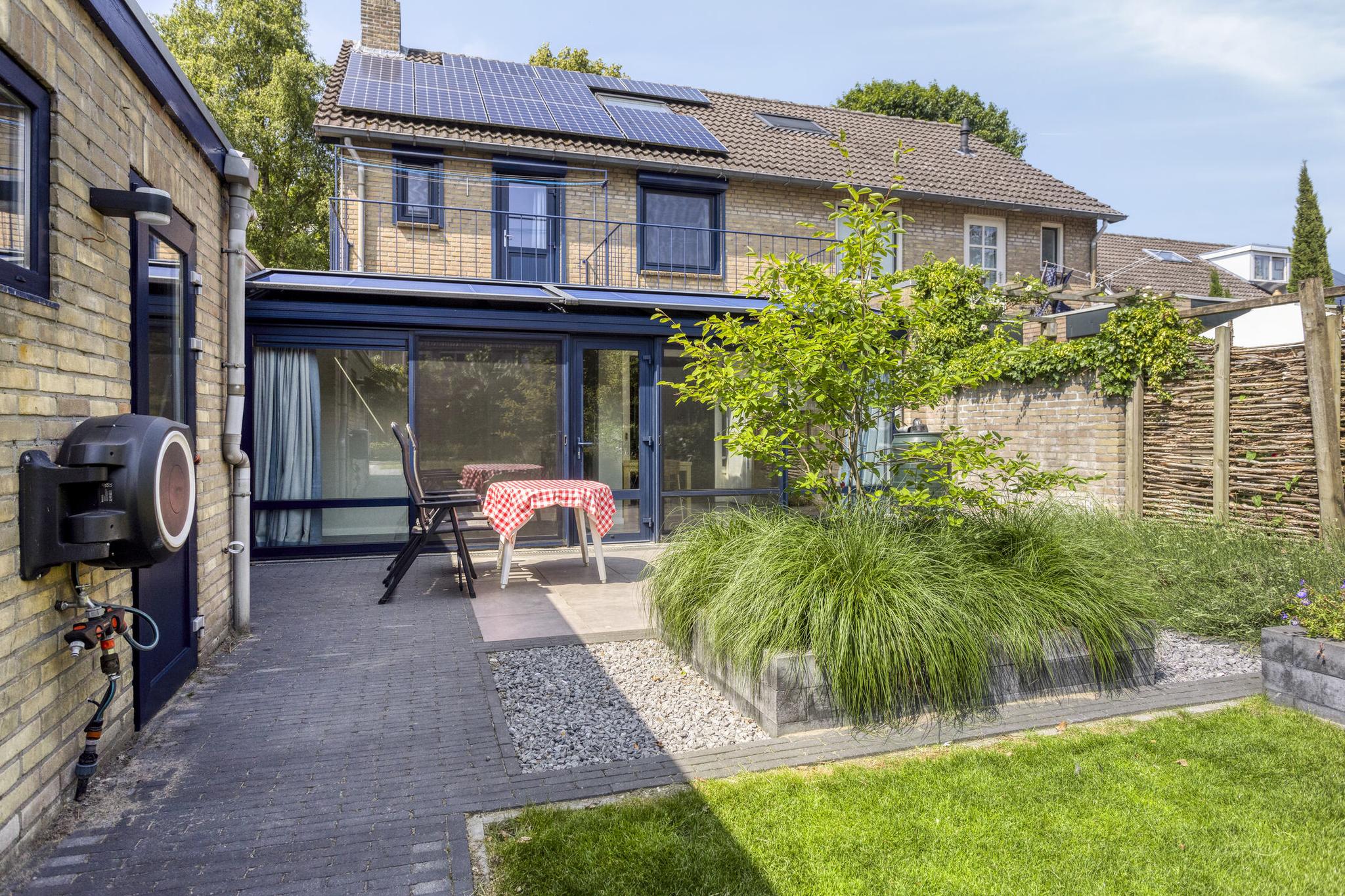 De ruime, zonnige achtertuin is gelegen op het zuiden en voorzien van sierbestrating, een terras, een gazon, borders en bomen. Je hebt geen directe inkijk van achterburen, dit zorgt voor extra privacy.