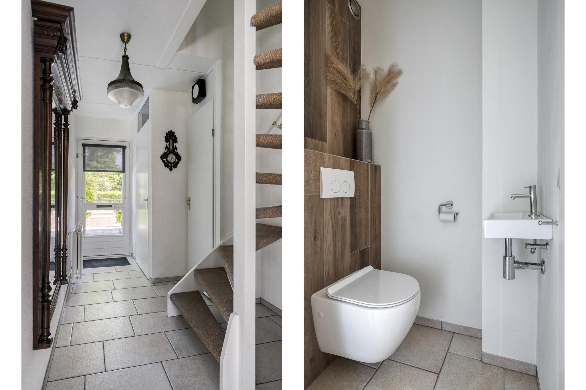 Je stapt de woning binnen via een verzorgde entree met hal, meterkast, een vaste trap naar de 1e verdieping en een modern toilet met wandcloset en fontein. De gehele begane grond is afgewerkt met een praktische plavuizen vloer.