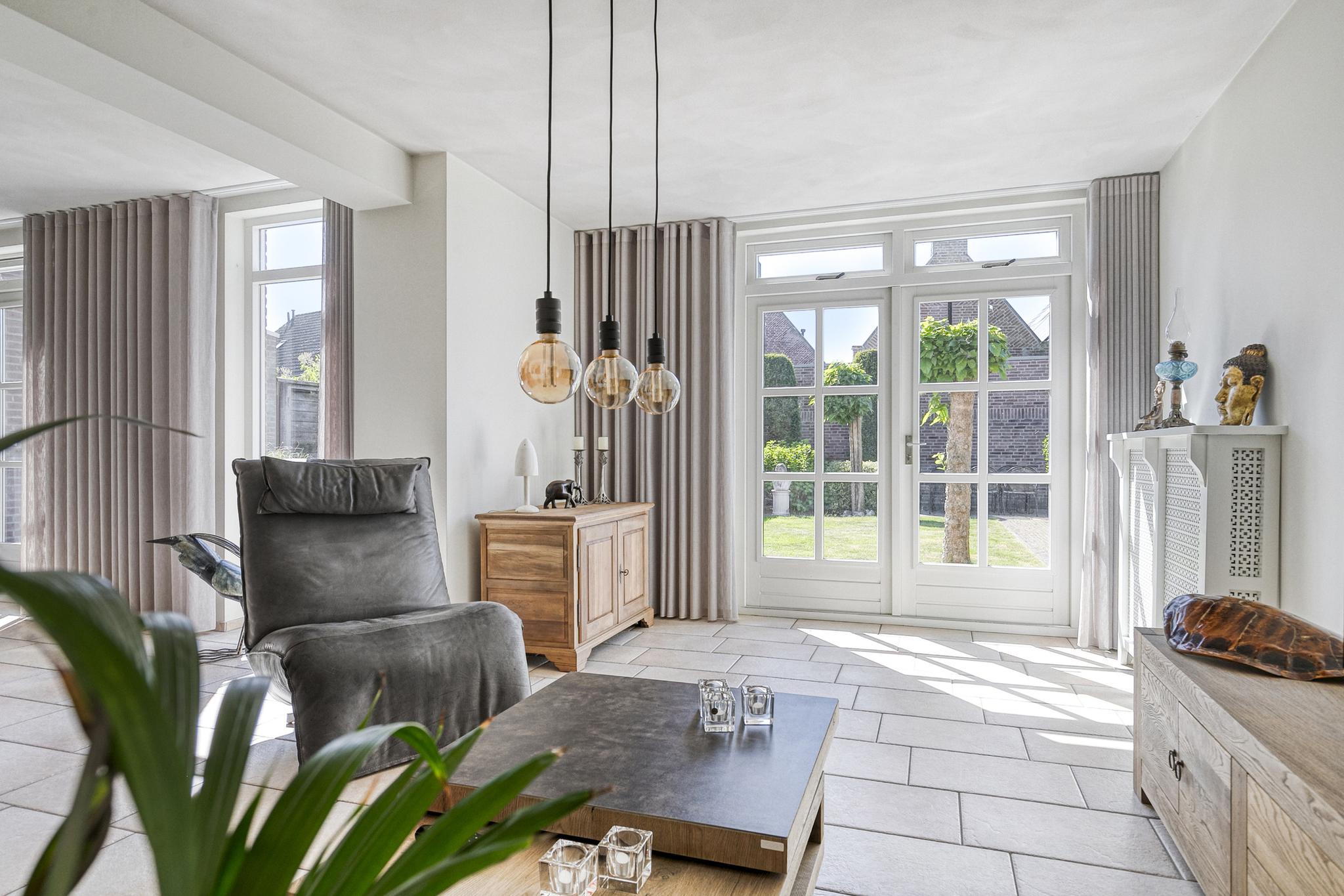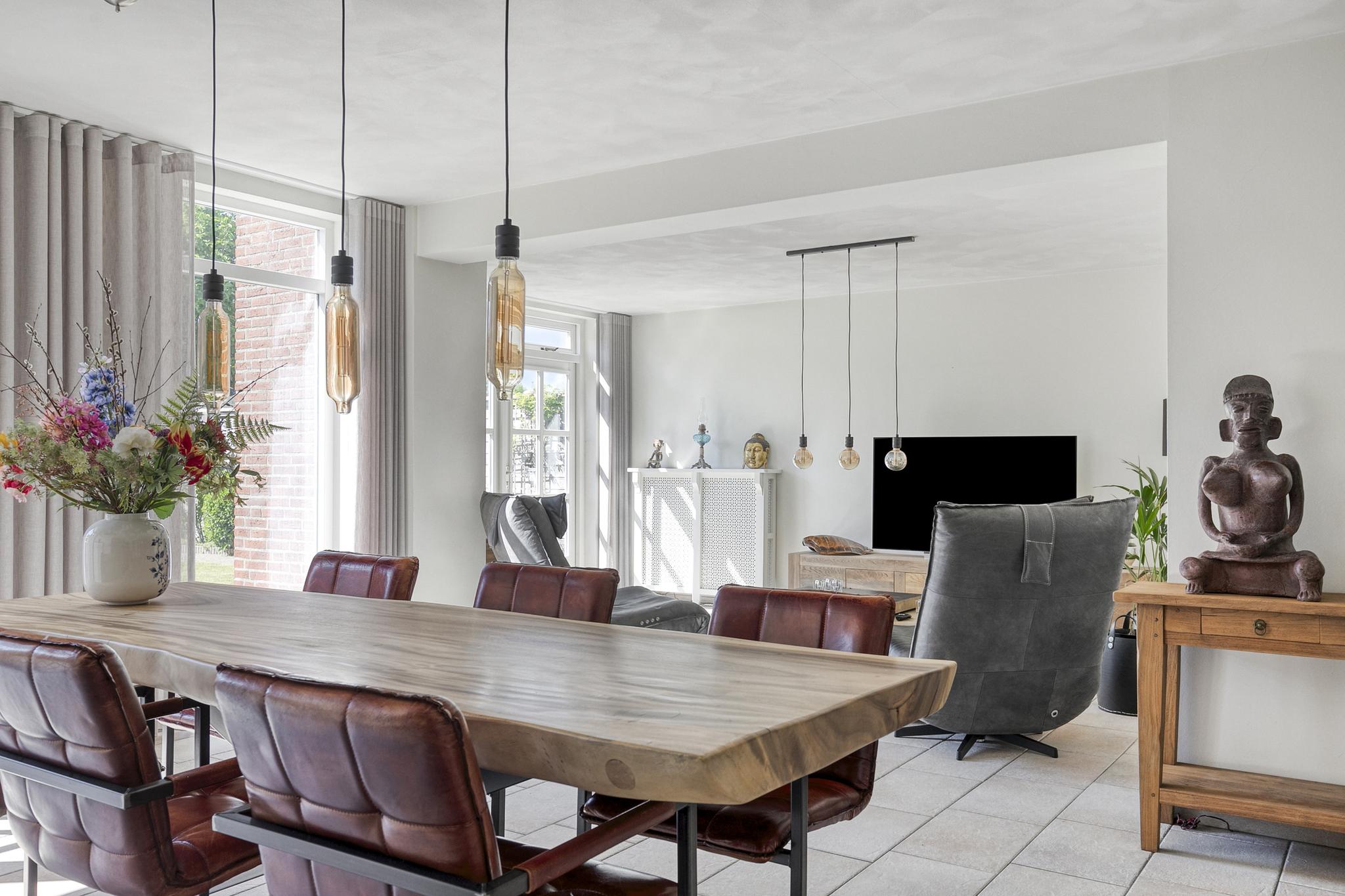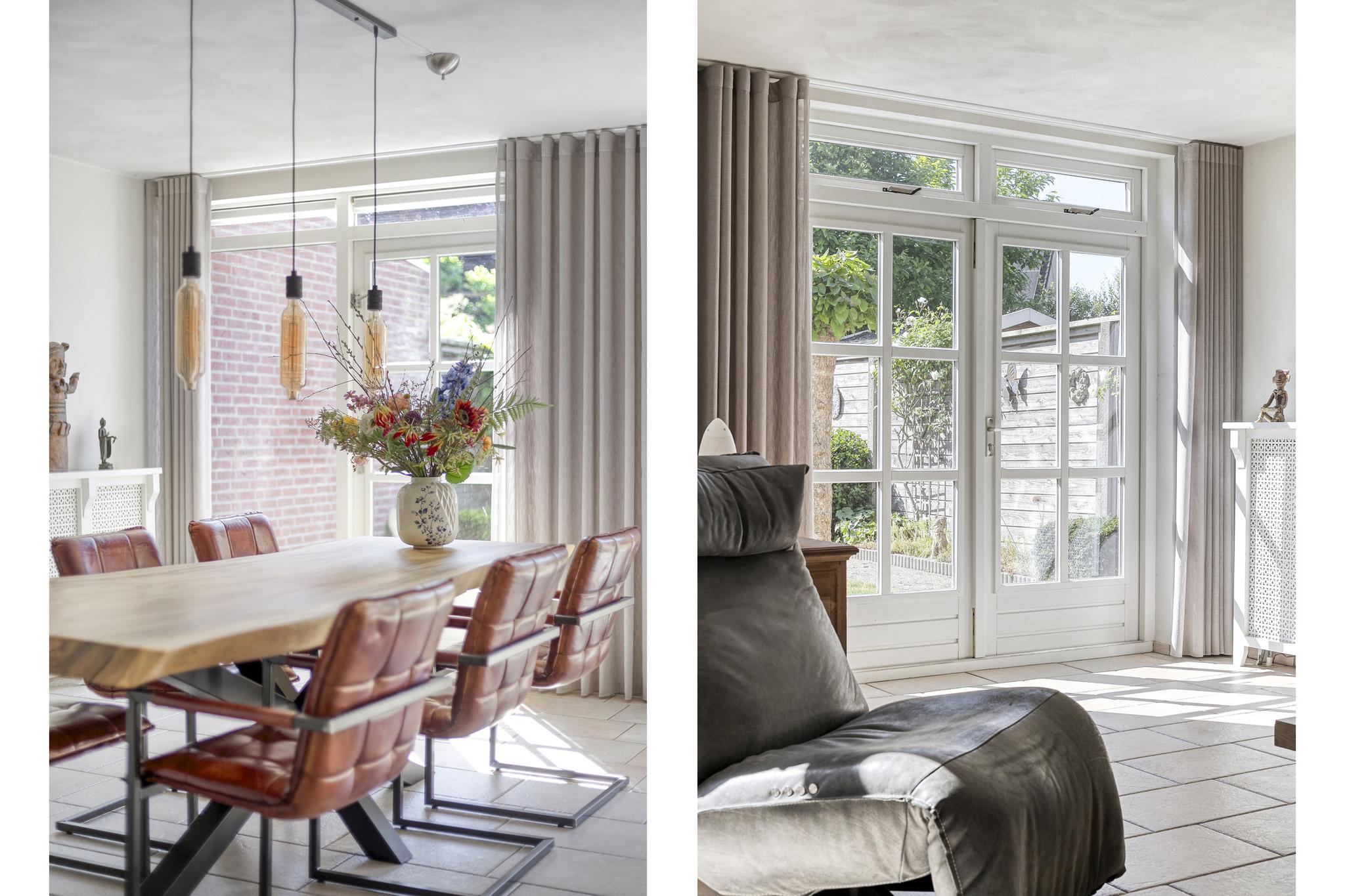 Dankzij de uitbouw aan de achterzijde is er een royale, lichte woonkamer ontstaan. De grote raampartijen, een loopdeur én openslaande deuren naar de tuin zorgen voor een fijne verbinding met buiten en volop daglicht.