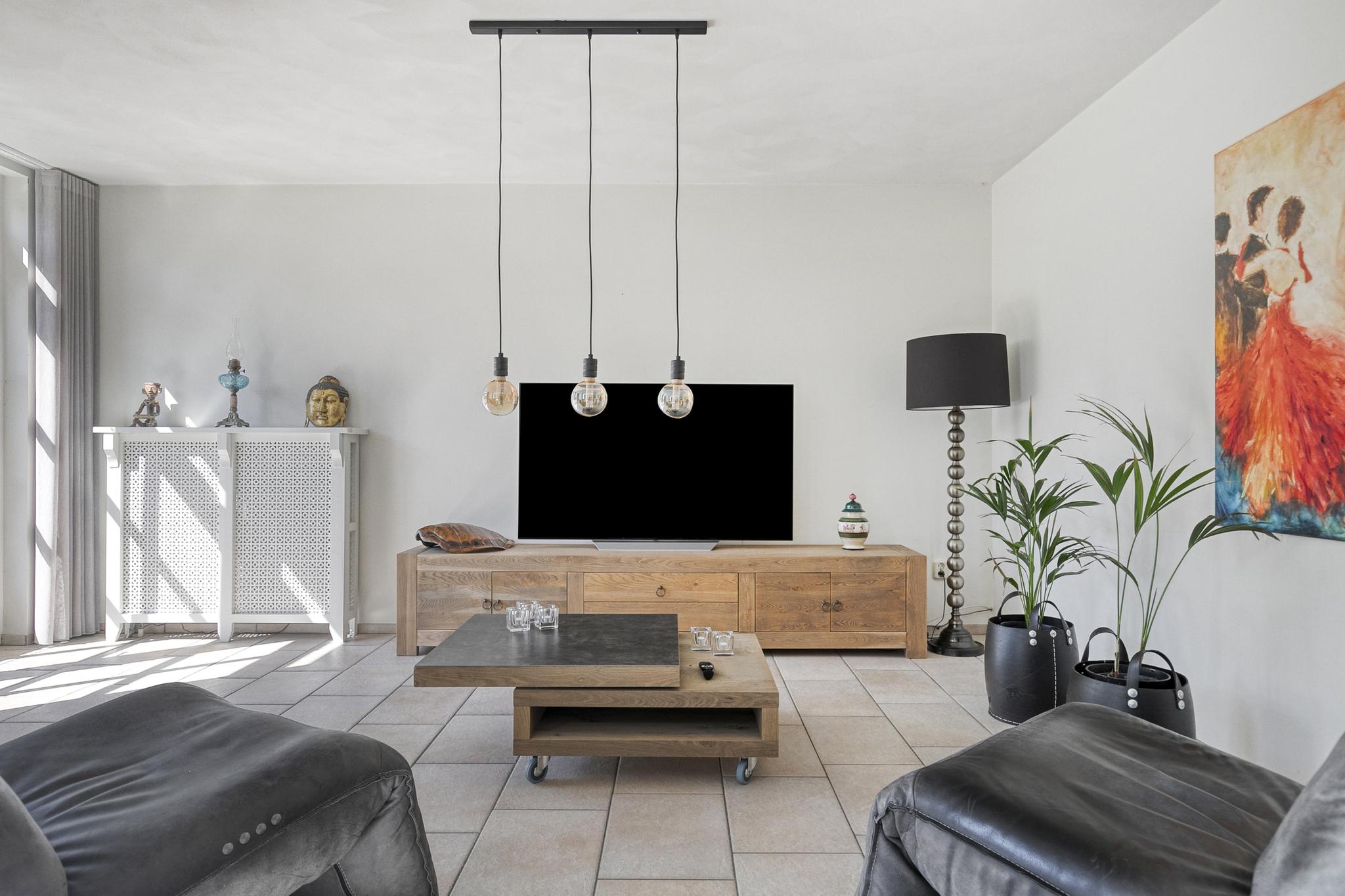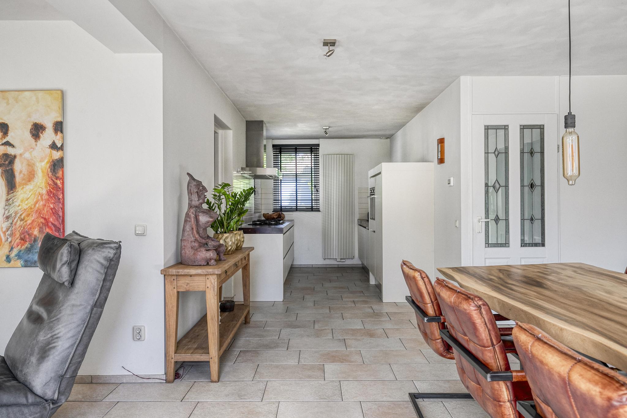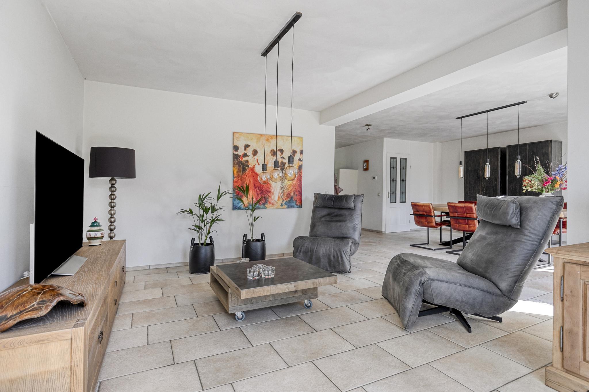 Dankzij de uitbouw aan de achterzijde is er een royale, lichte woonkamer ontstaan. De grote raampartijen, een loopdeur én openslaande deuren naar de tuin zorgen voor een fijne verbinding met buiten en volop daglicht.