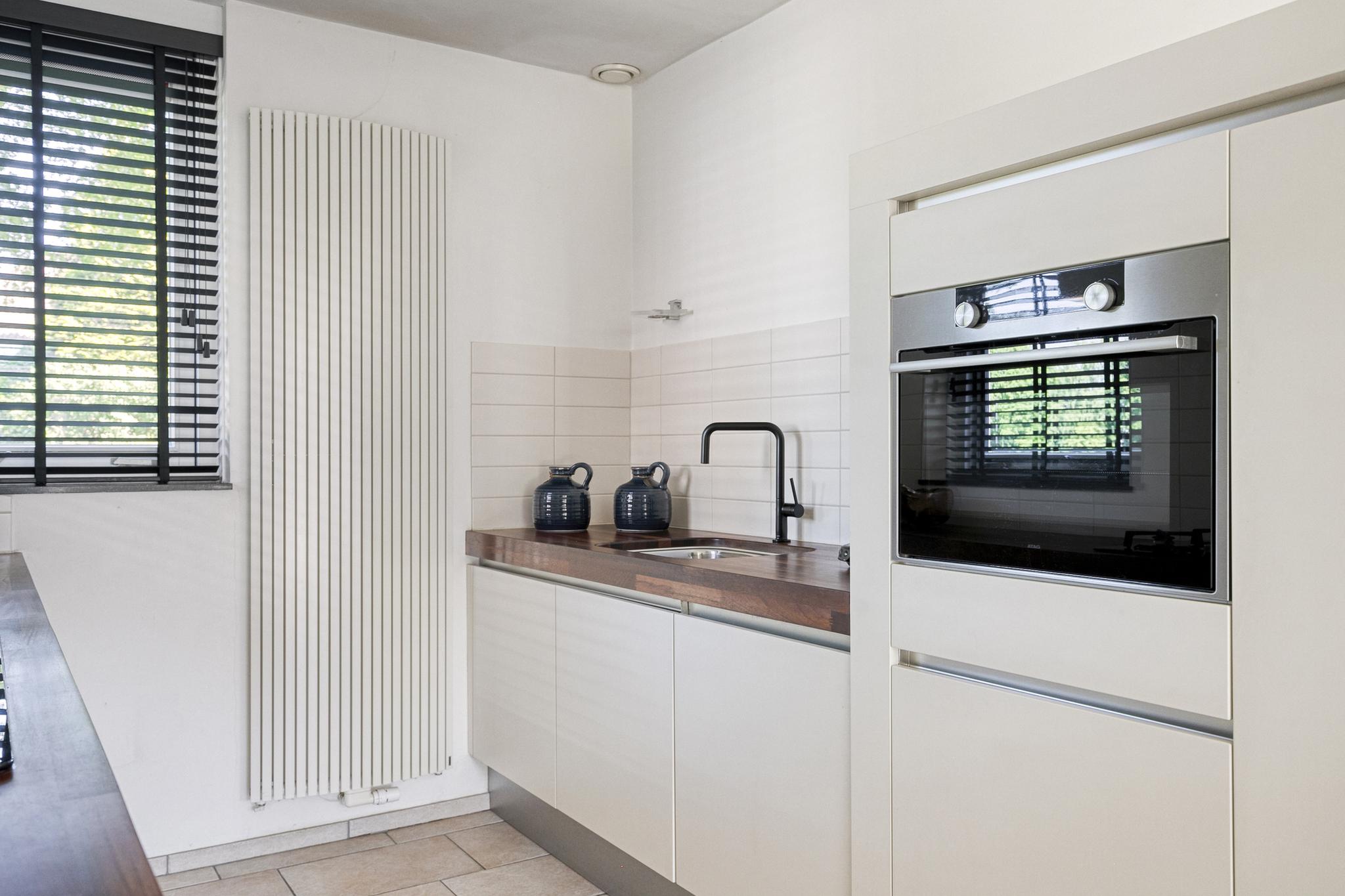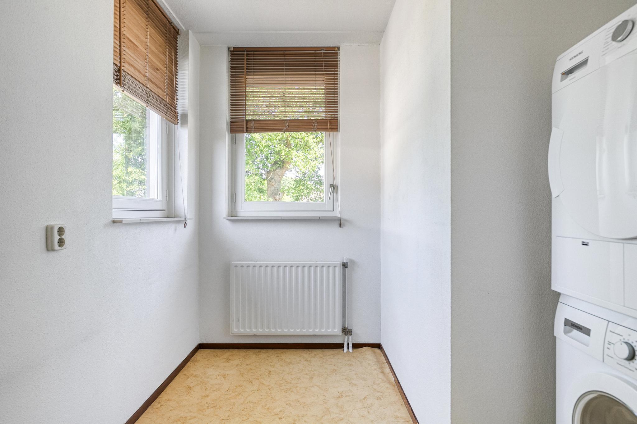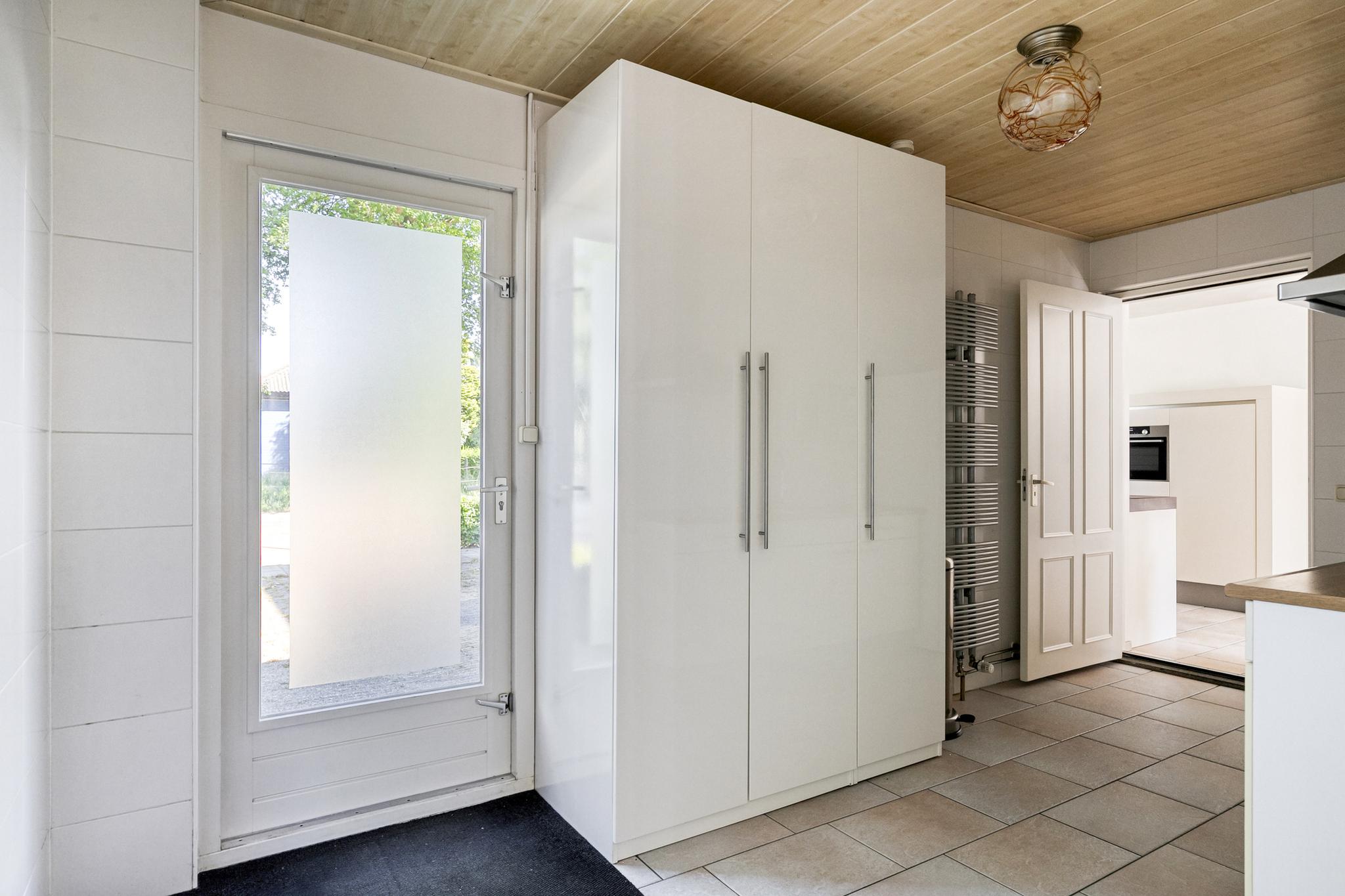 Aangrenzend aan de keuken ligt de bijkeuken, die tevens fungeert als achterom. Je hebt hier een extra keukenblok met diverse onderkasten, een spoelbak, een 10-liter close-in boiler en een afzuigkap. Vanuit deze ruimte heb je toegang tot zowel de oprit als de achtertuin.