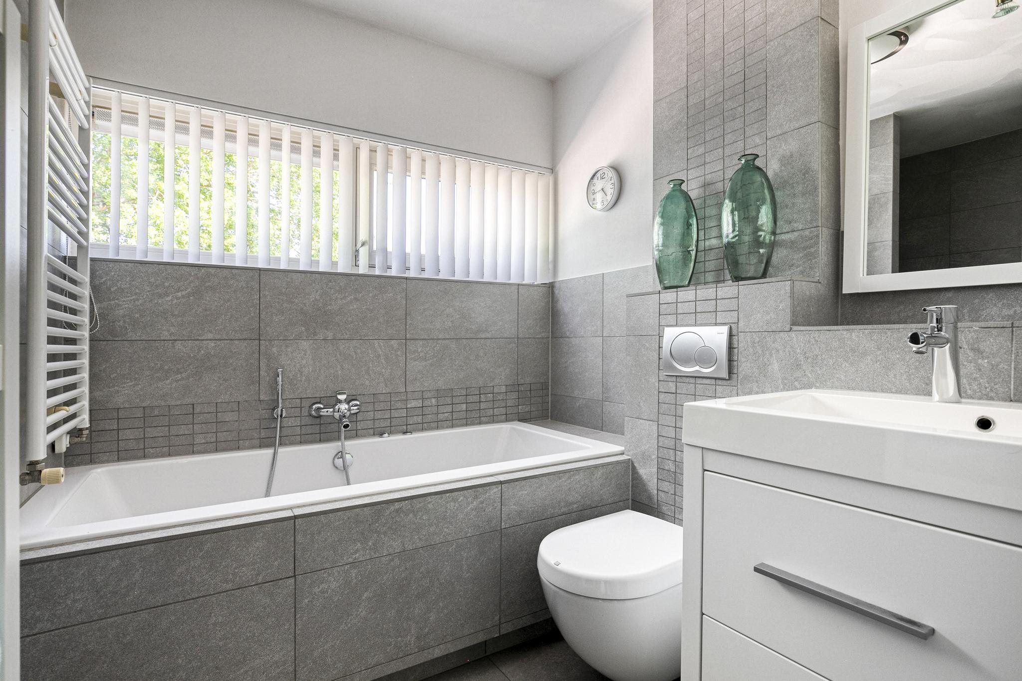 De badkamer is voorzien van een inloopdouche met hand- en regendouche, een ligbad met whirlpoolfunctie, een tweede wandcloset, een wastafelmeubel en een designradiator.