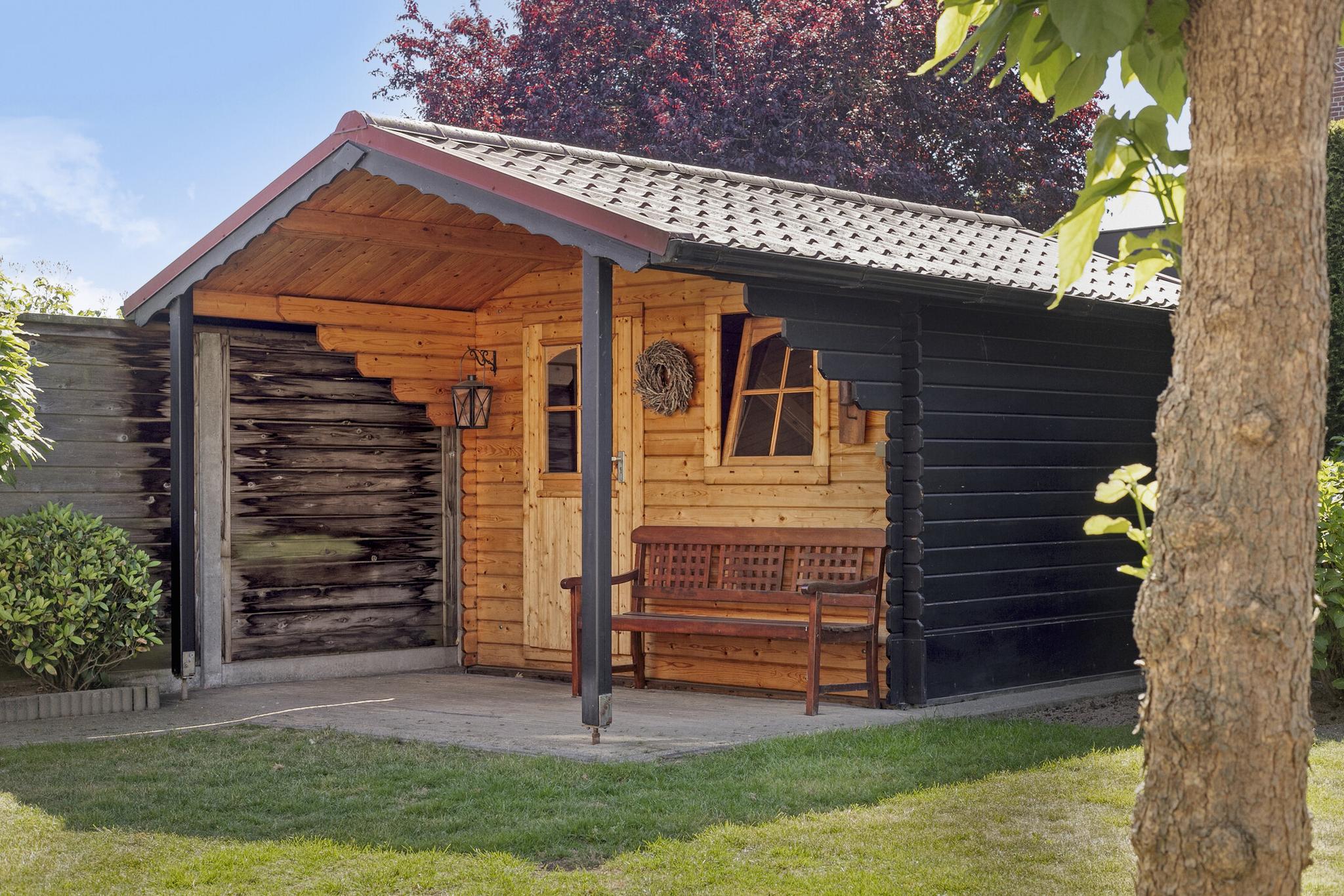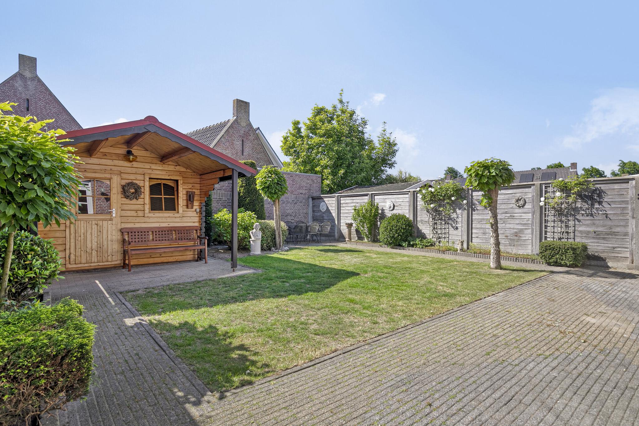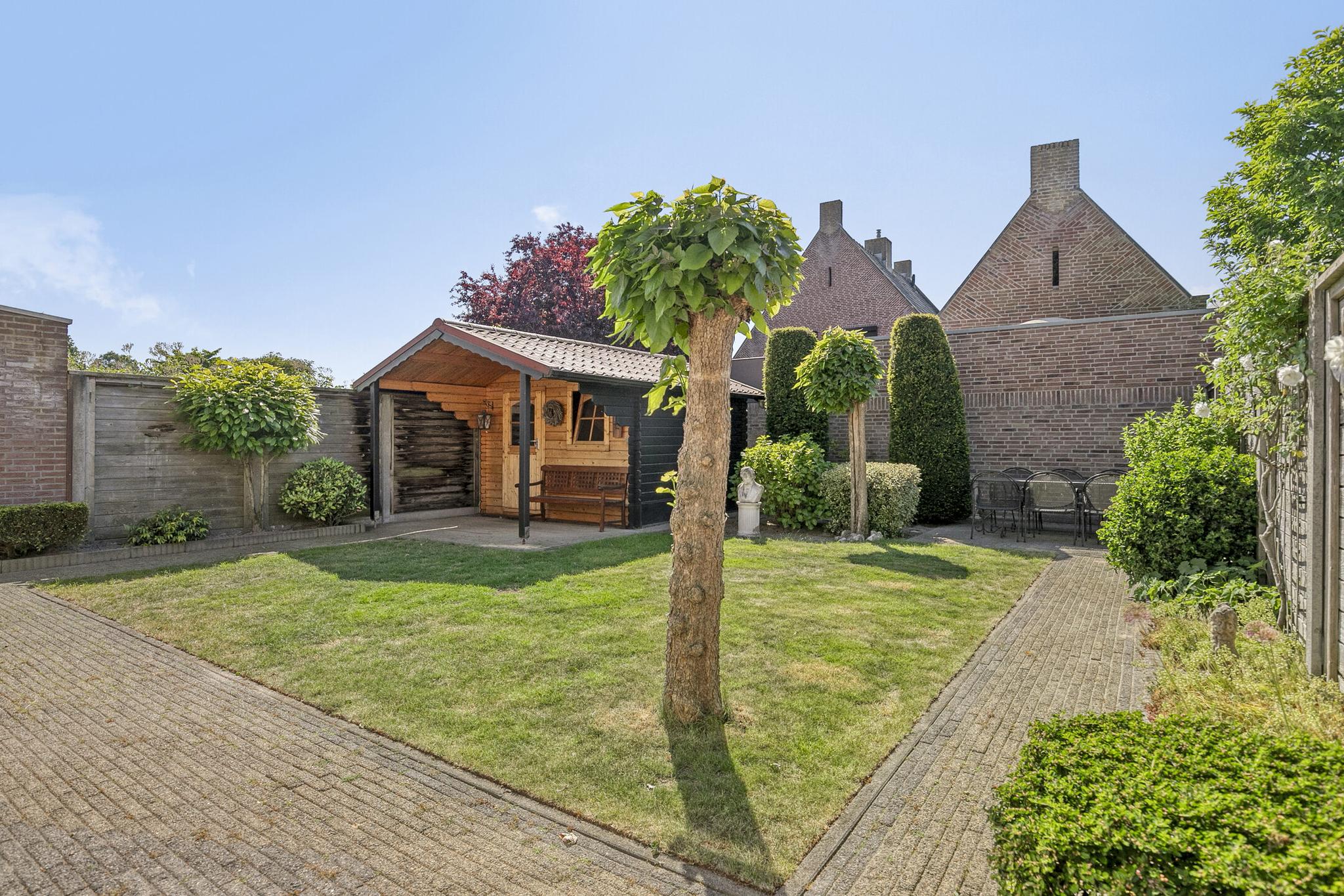 De zonnige, op het westen gesitueerde achtertuin is voorzien van sierbestrating, een gazon en groene borders. Een elektrisch zonnescherm zorgt op warme dagen voor de nodige schaduw. Achterin de tuin staat een houten berging met elektra.