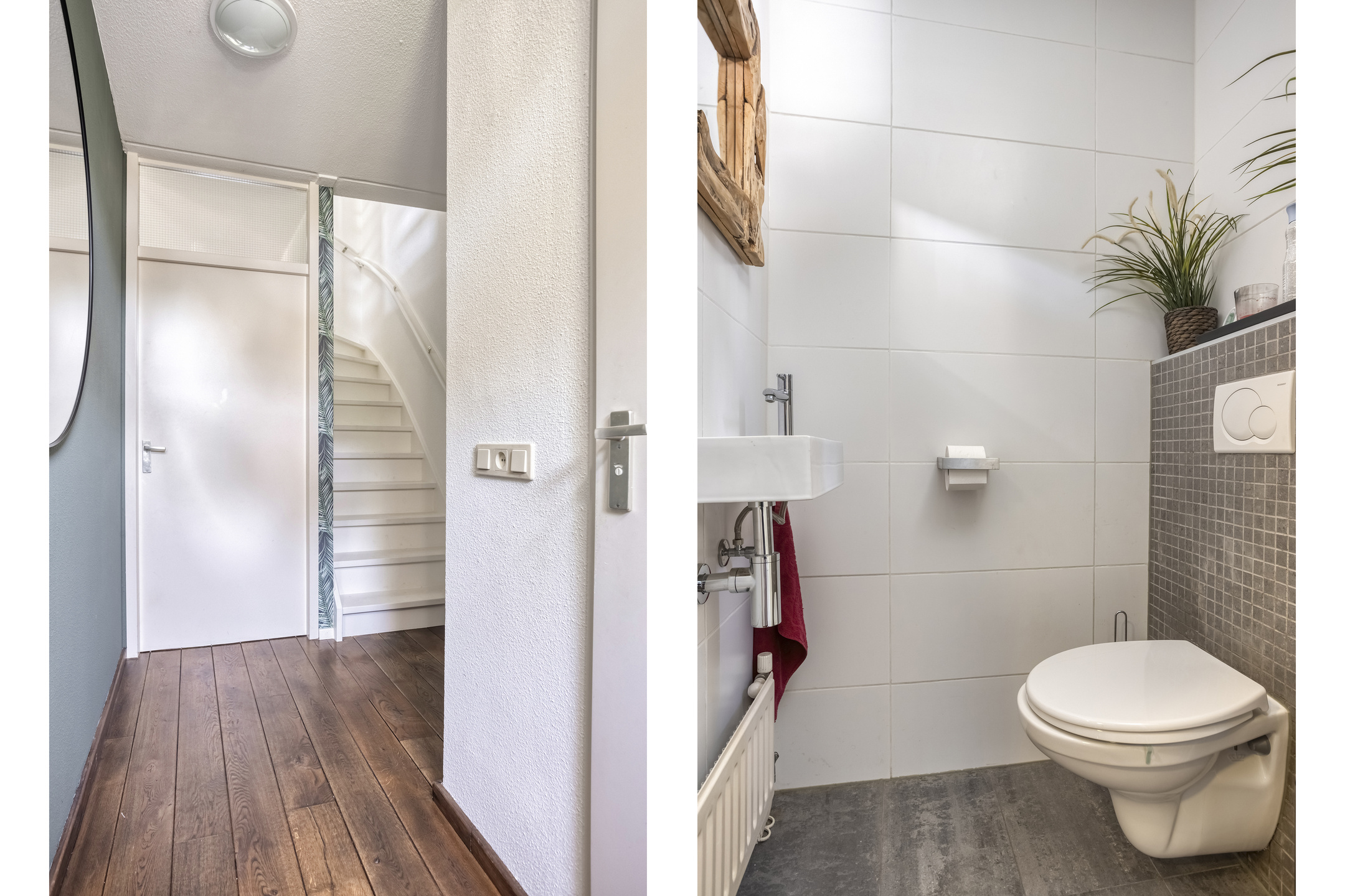 Als je de auto op de oprit hebt geparkeerd, dan loop je zo naar de entree van de woning. De hal geeft toegang tot de betegelde toiletruimte met wandcloset en fontein en de trapopgang naar de 1e verdieping. In de hal vind je tevens de meterkast. Vanuit de hal kom je in de gezellige woonkamer die is verdeeld in een eet- en zitgedeelte.