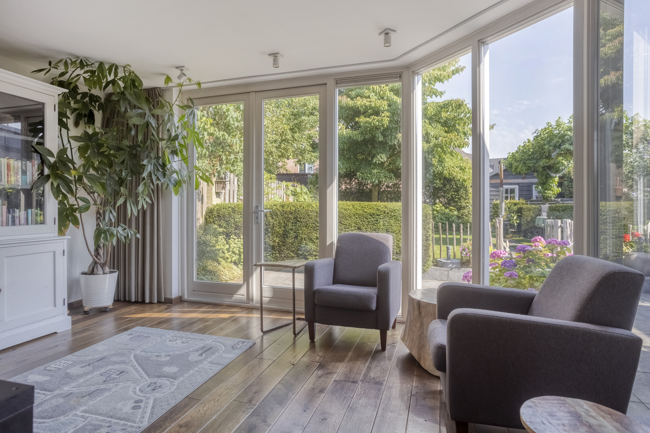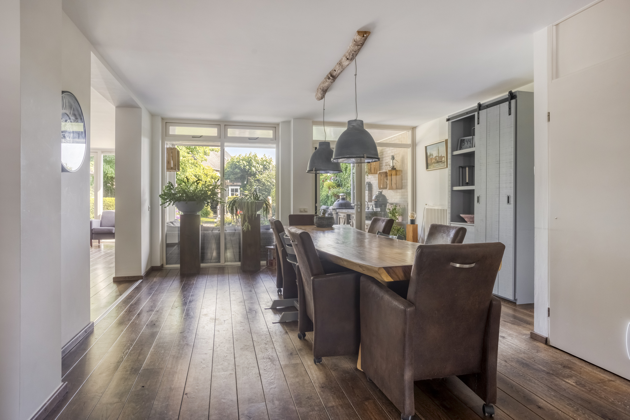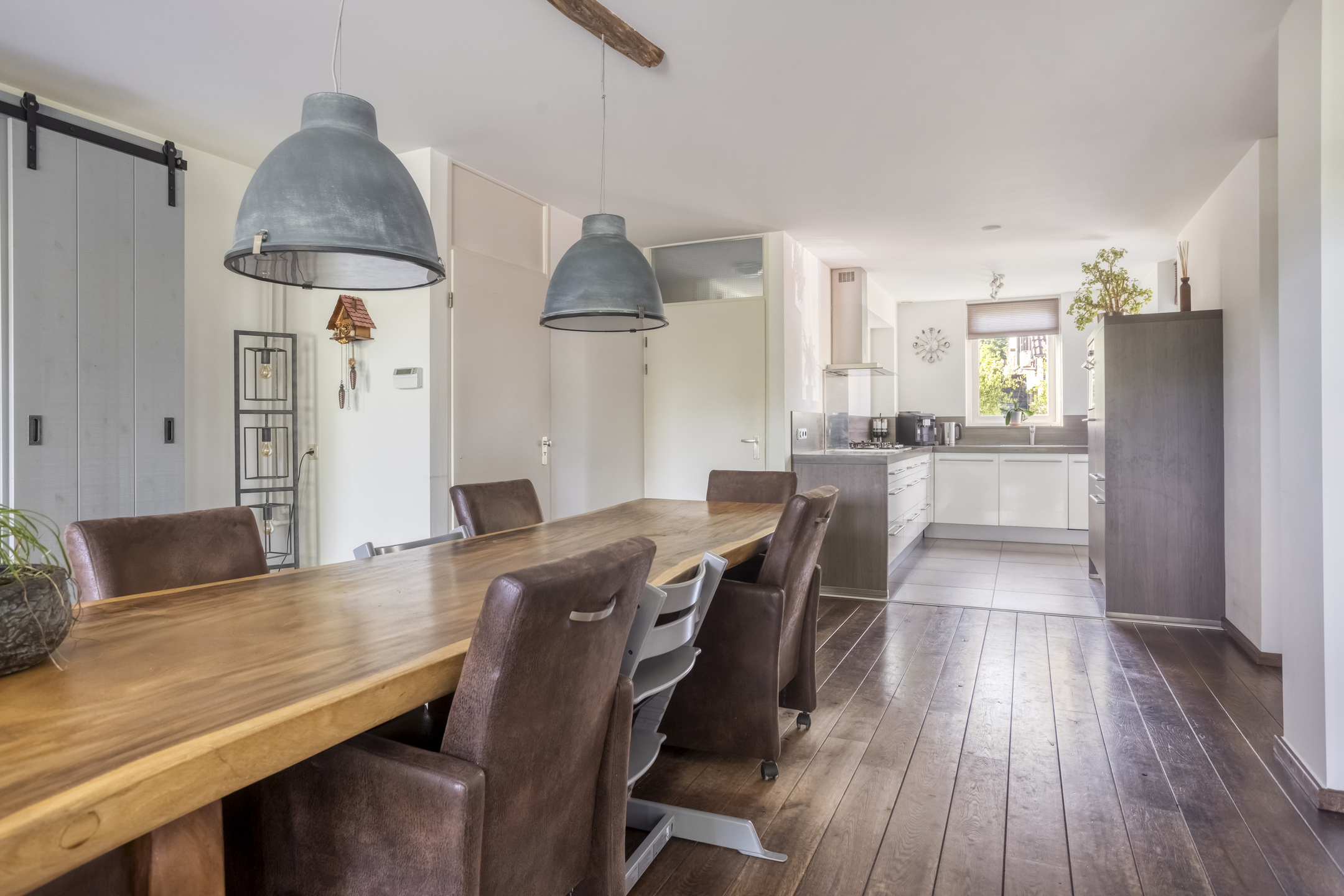 Het tuingerichte zitgedeelte bevindt zich in de aanbouw en is dankzij de grote raampartijen en openslaande deuren heerlijk licht. In het eetgedeelte vind je een praktische trapkast en via een loopdeur heb je direct toegang tot de overkapping in de achtertuin.