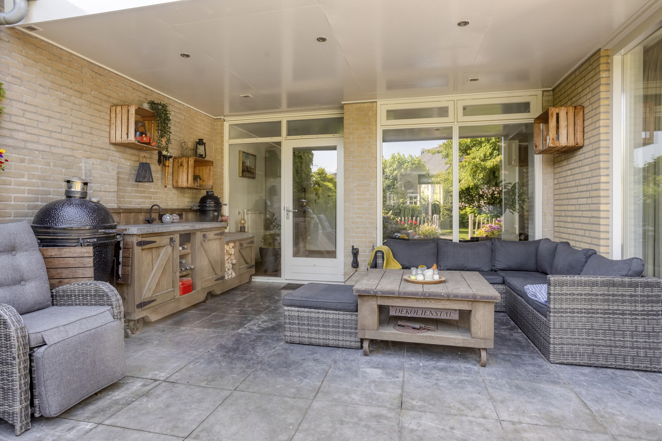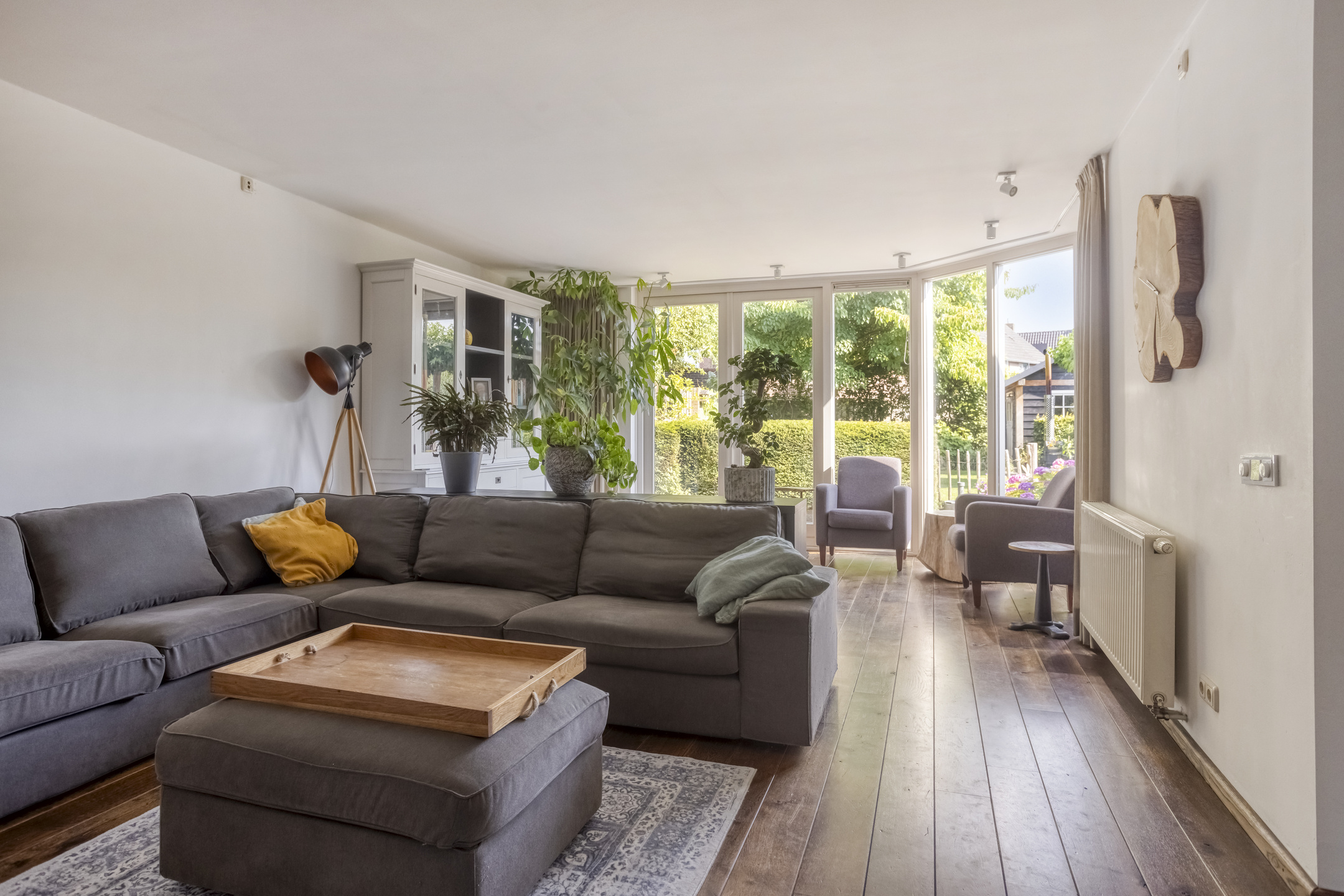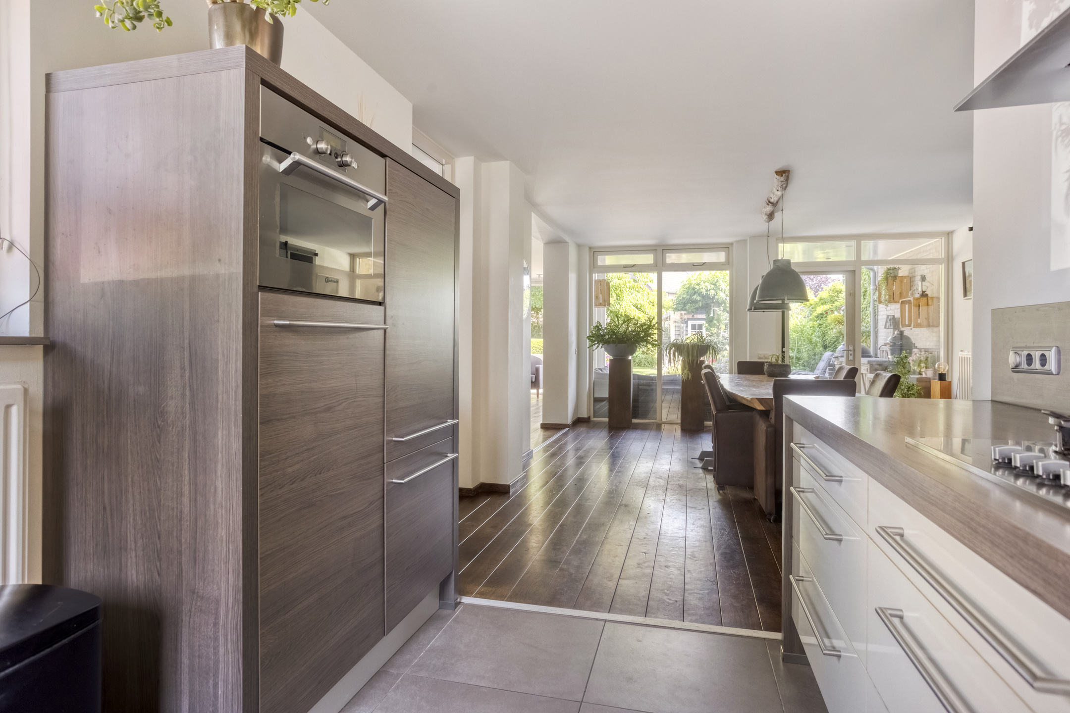 Het tuingerichte zitgedeelte bevindt zich in de aanbouw en is dankzij de grote raampartijen en openslaande deuren heerlijk licht. In het eetgedeelte vind je een praktische trapkast en via een loopdeur heb je direct toegang tot de overkapping in de achtertuin.