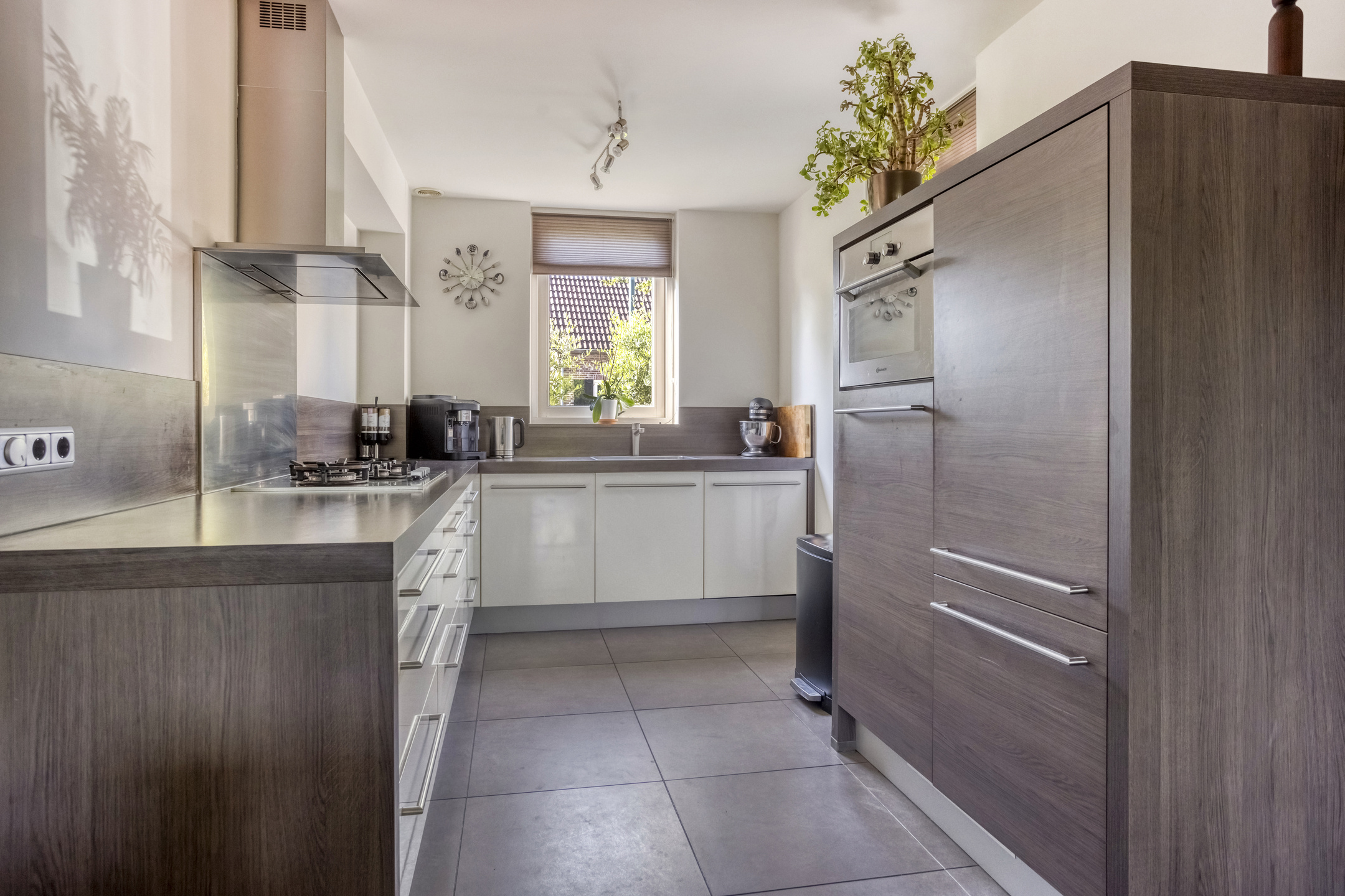 De open keuken aan de voorzijde van de woning heeft een hoekopstelling met diverse onderkasten en lades, een 5-pits gaskookplaat (incl. wokbrander), afzuigkap en vaatwasser. Een extra kast biedt naast opbergruimte ook plaats aan de koelkast en de combi oven/magnetron.