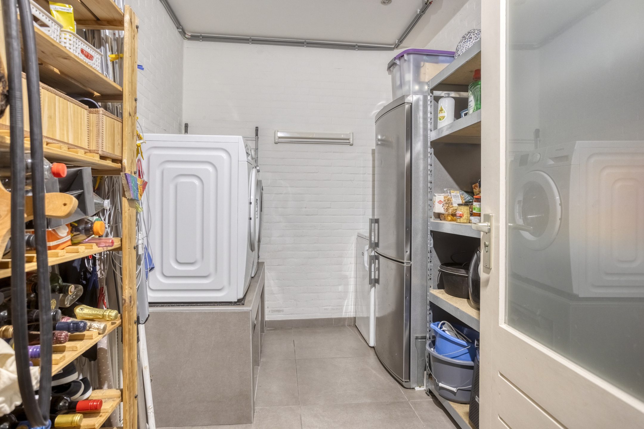 Vanuit het eetgedeelte in de woonkamer kom je in het portaal dat toegang geeft tot de bijkeuken en de oprit. In de bijkeuken bevinden zich de aansluitingen voor de was- en droogapparatuur, geplaatst op een handige verhoging.
