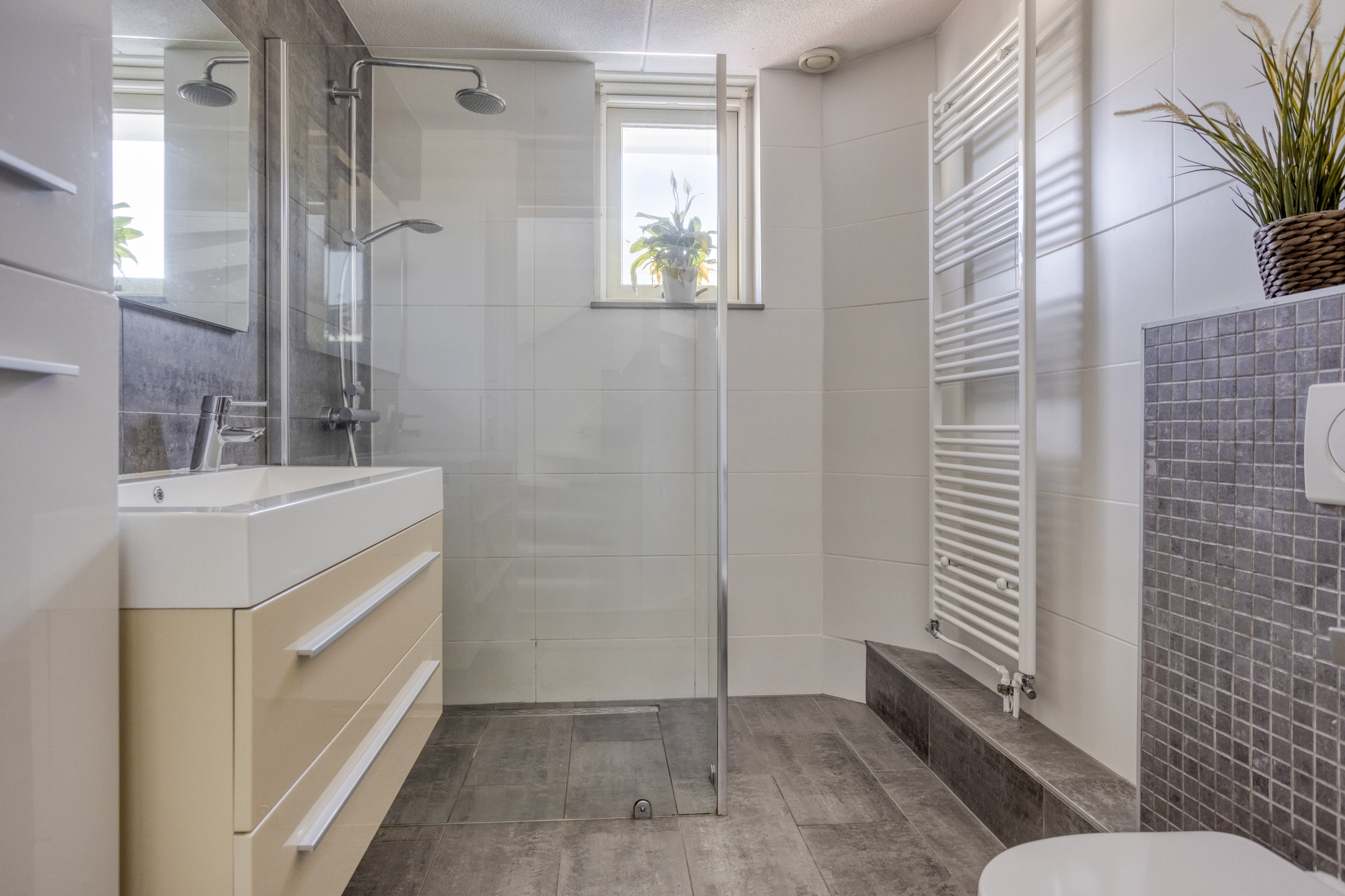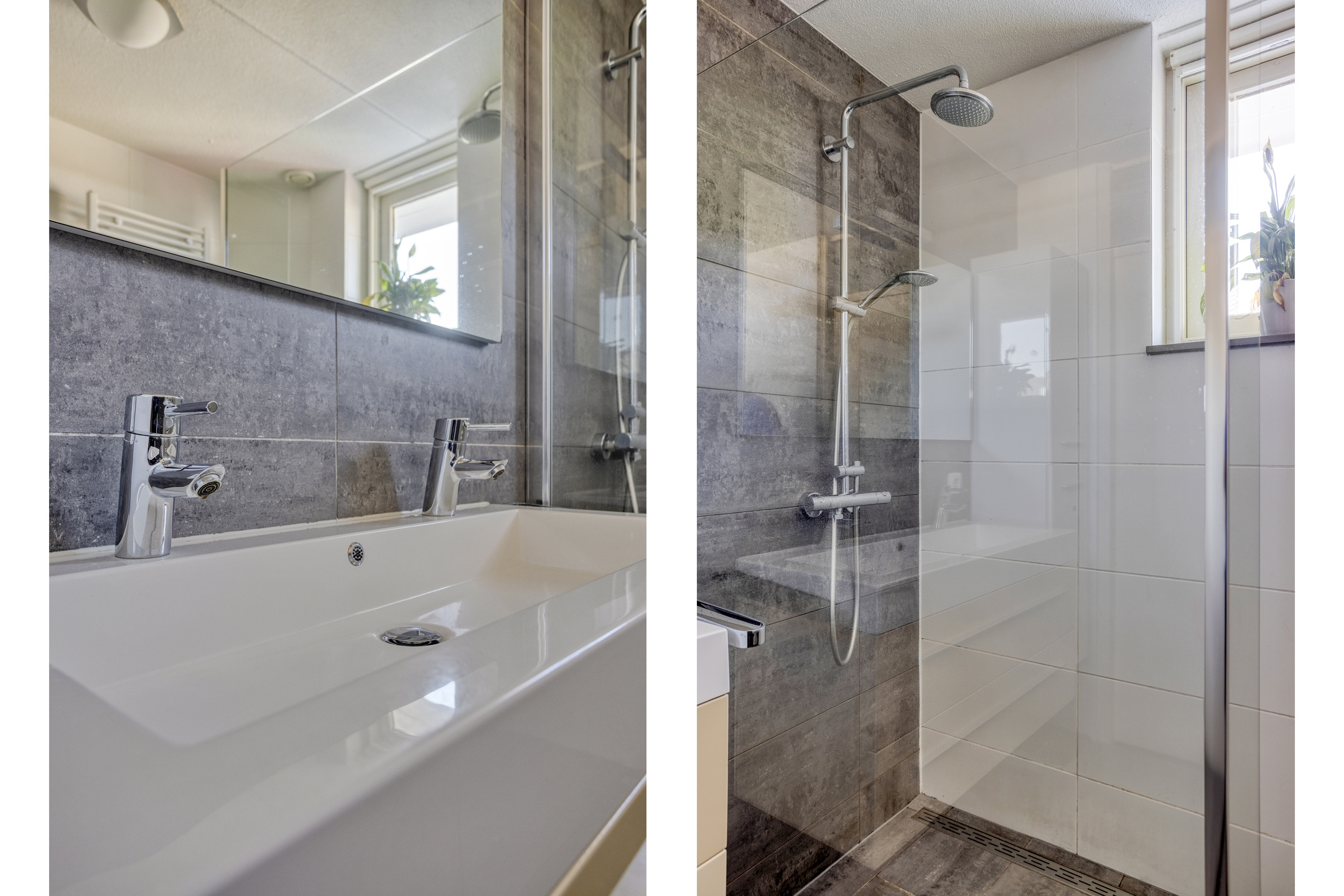 De geheel betegelde badkamer is voorzien van een inloopdouche met hand- en regendouche, een wandcloset, een badmeubel met dubbele kraan en een designradiator.