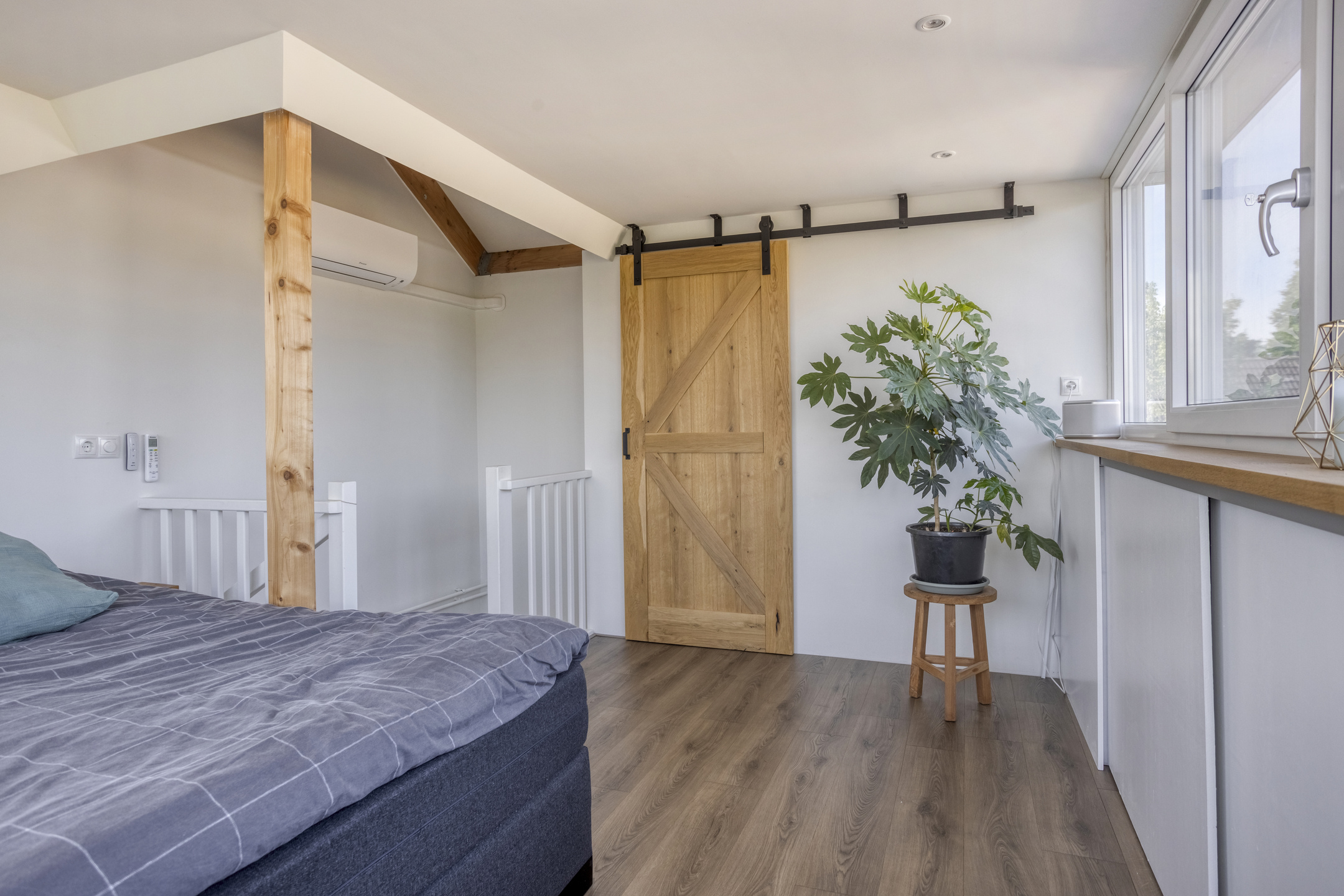 is hier een volwaardige slaapkamer gecreëerd. De dakkapel is uitgevoerd in kunststof, heeft HR++ beglazing, horren en elektrisch bedienbare rolluiken. De ruimte beschikt over een airco die zowel kan koelen als verwarmen — ideaal in elk seizoen. Via een schuifdeur is de walk-in closet bereikbaar, waar zich ook de opstelplaats van de Nefit cv-ketel bevindt.