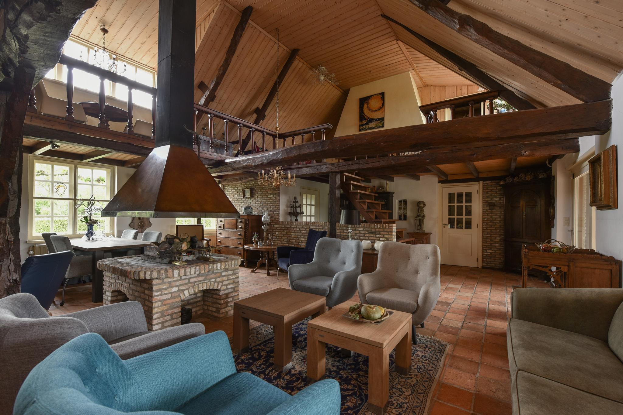 De sfeervolle woonkamer is een indrukwekkende ruimte met een vide en opvallende open haard. Vanuit de woonkamer loop je zo het terras achter de woning op, waardoor binnen en buiten naadloos in elkaar overgaan.