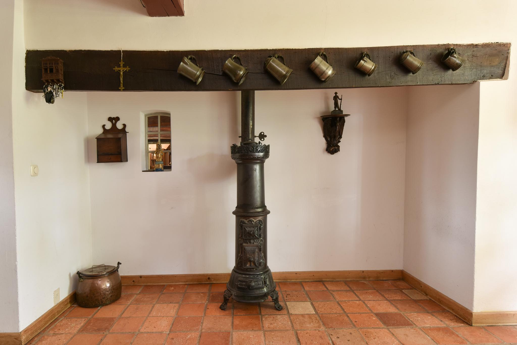 De woonkeuken is uitgerust met een hoekopstelling met diverse onder- en bovenkasten, een natuurstenen werkblad, een natuursteen spoelbak, een vaatwasmachine, een koelkast, een stijlvol La Cornue gasfornuis en een afzuigkap. De originele schouw voegt extra karakter toe aan deze ruimte. Vanuit de keuken is de kelder bereikbaar, die extra bergruimte biedt voor proviand.