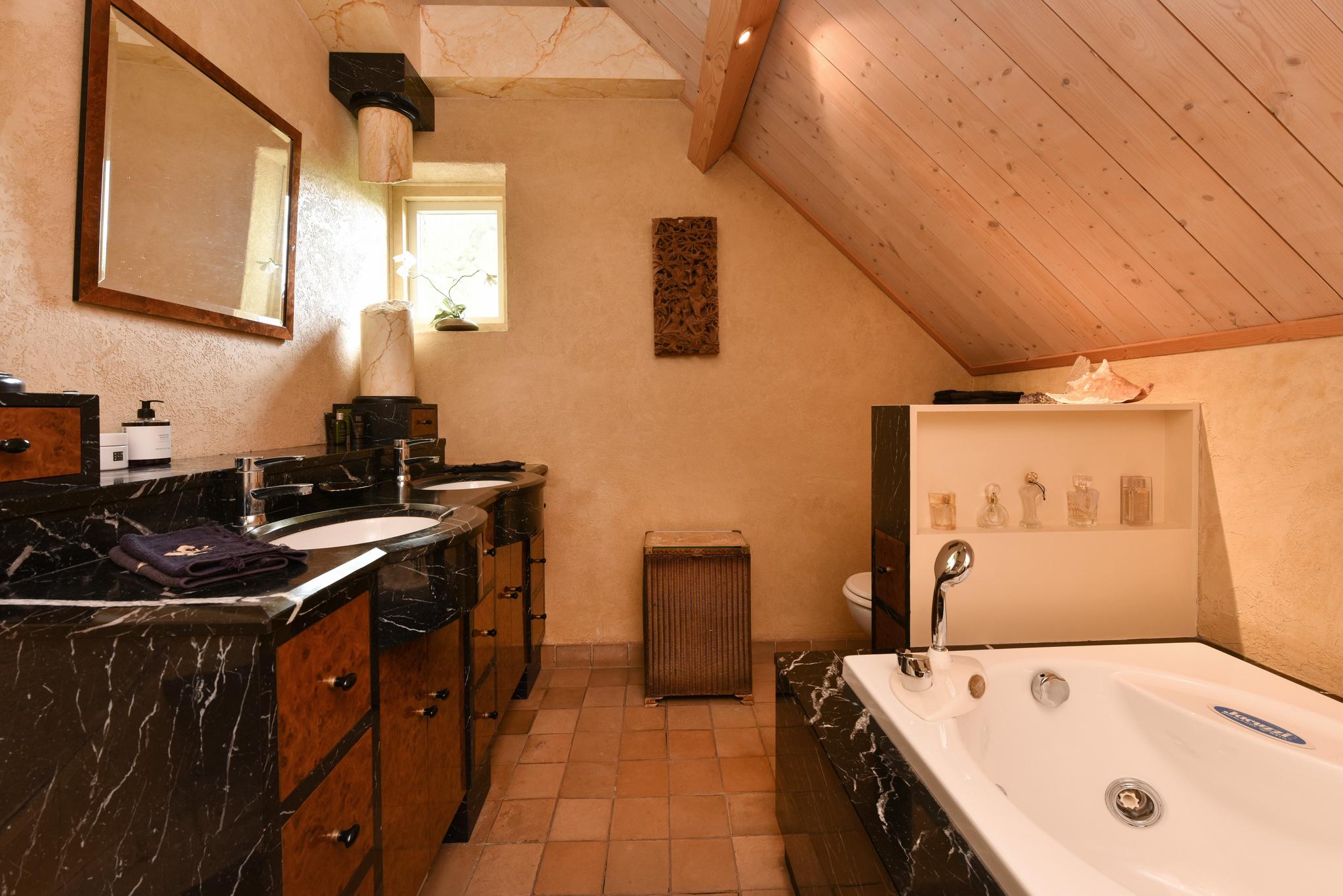 De badkamer, gelegen op een splitlevel verdieping, is voorzien van een ligbad met whirlpoolfunctie, een dubbel wastafelmeubel en een toilet. Tevens is hier elektrische vloerverwarming aanwezig. De indeling zorgt voor zowel privacy als gemak, en biedt een stijlvolle en functionele ruimte voor je dagelijkse routine.