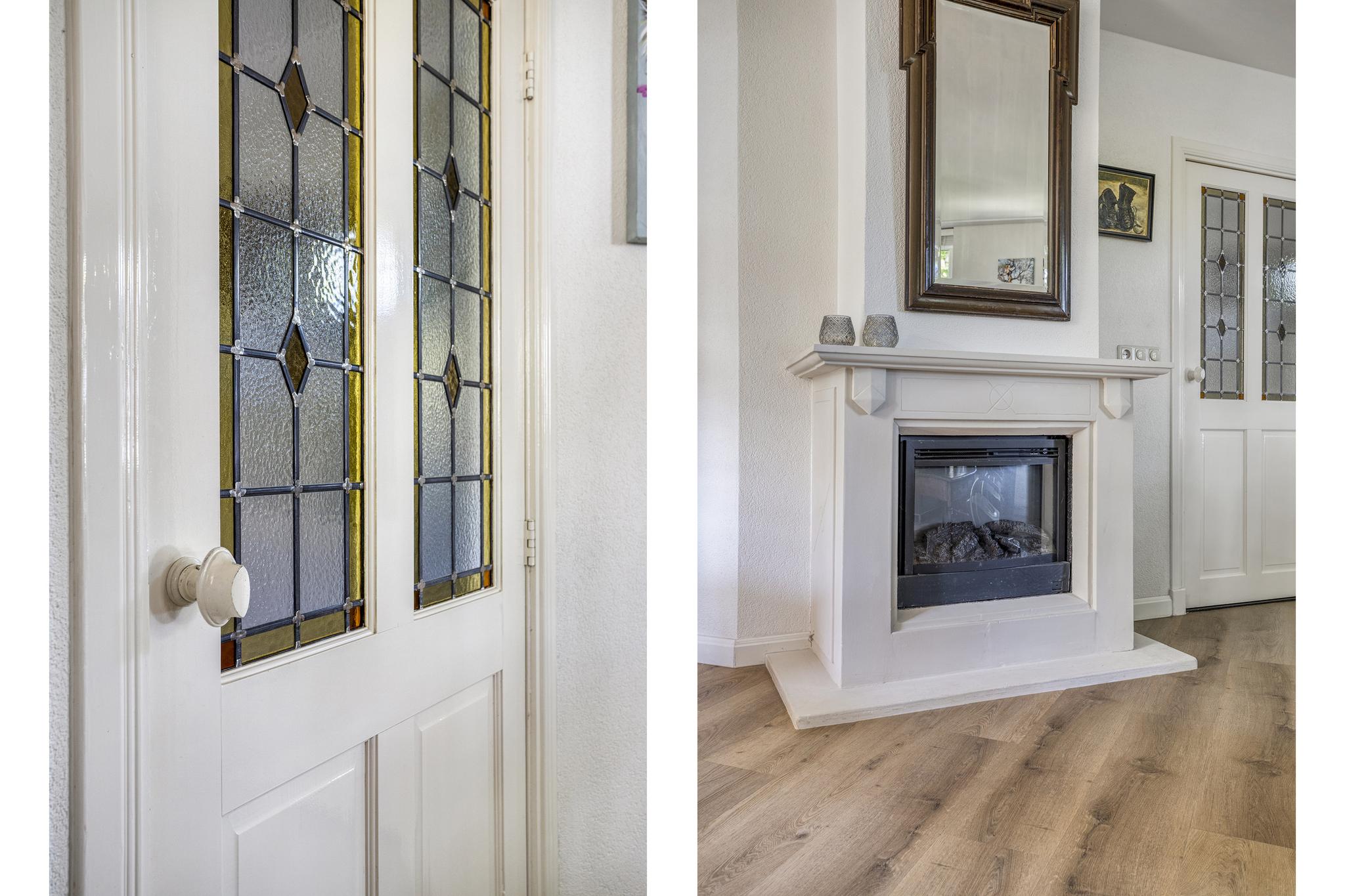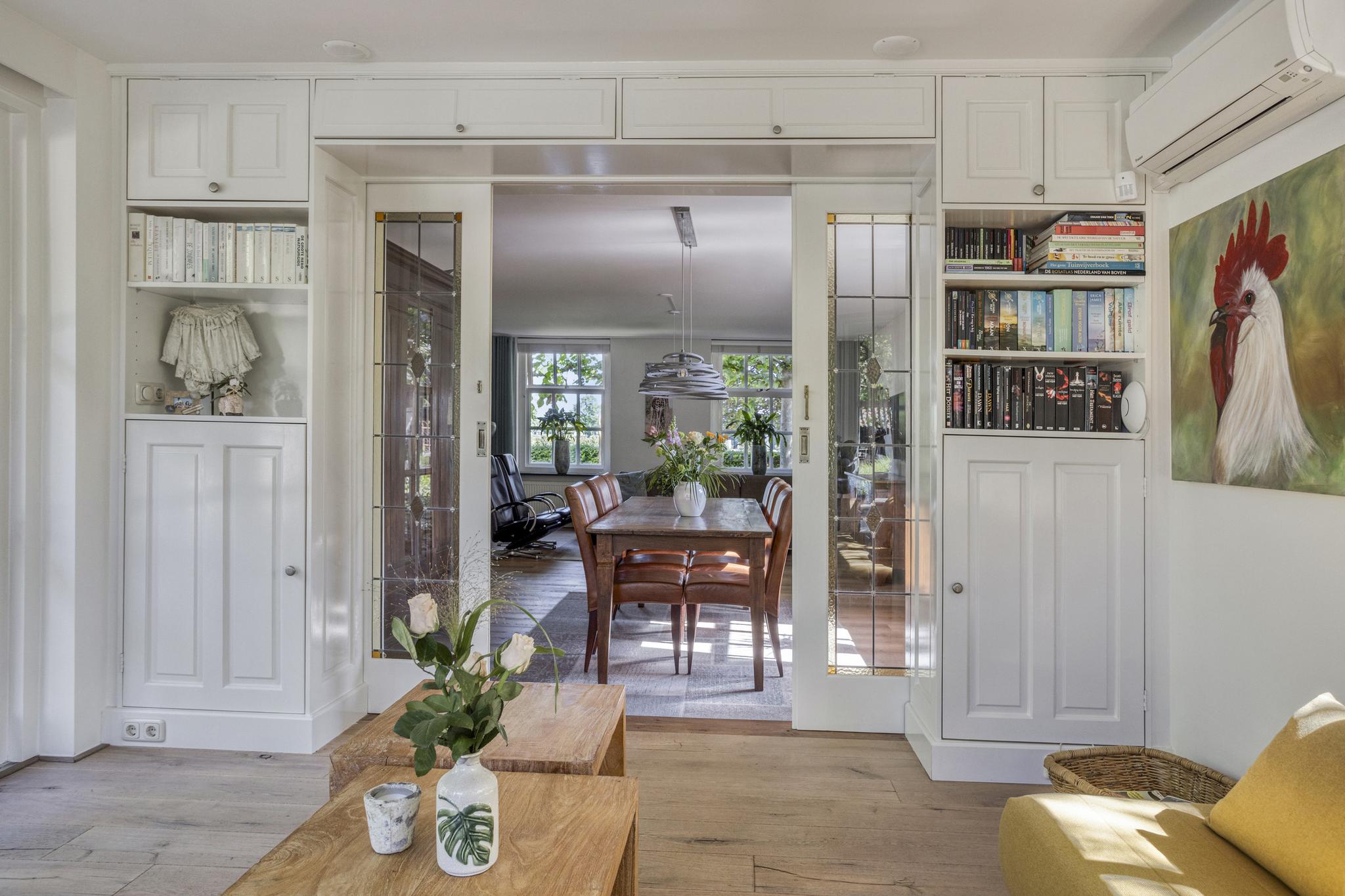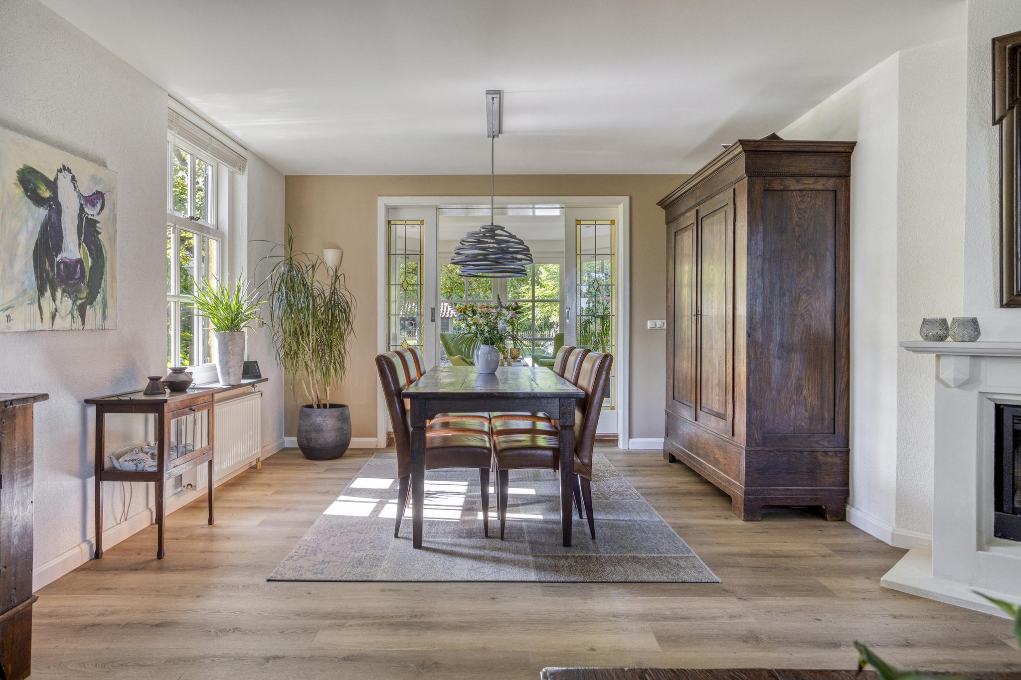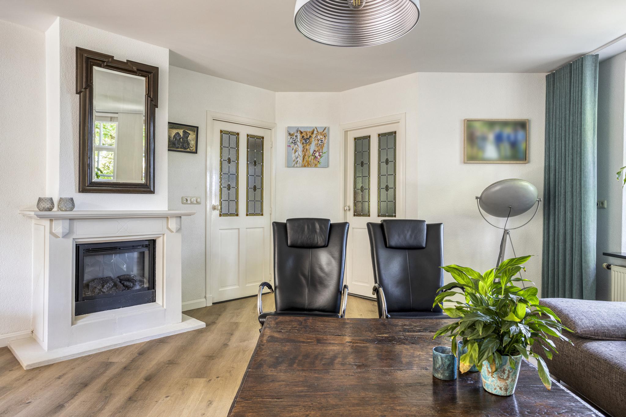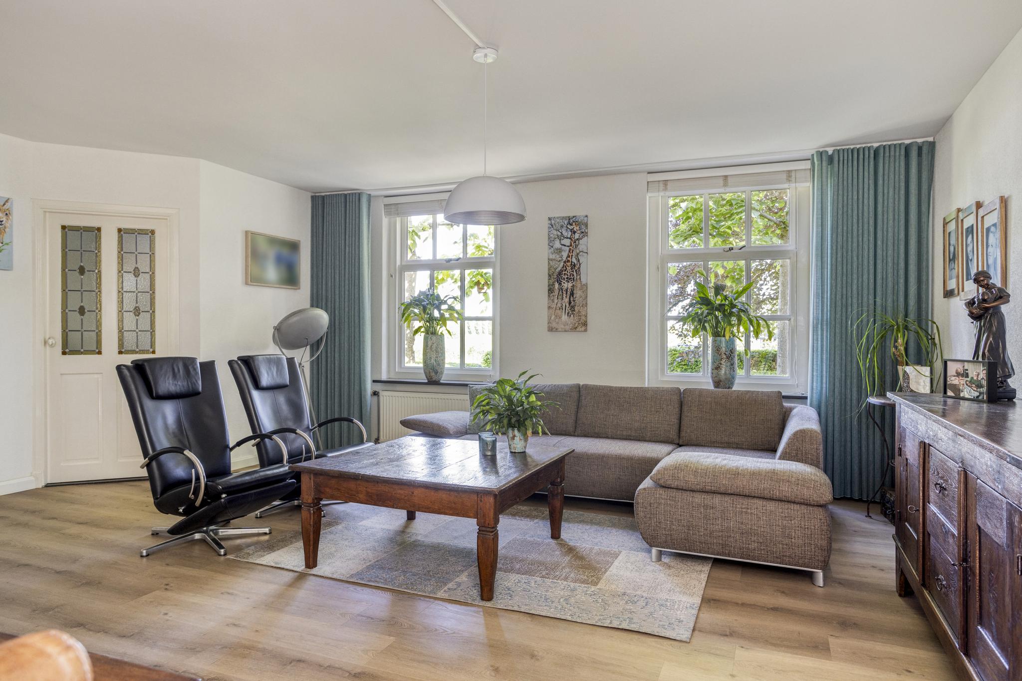De ruime woonkamer is ca. 40 m² groot. Achter de woonkamer is er een tuinkamer van ca. 15 m² gelegen met veel ramen en twee dubbele tuindeuren voor een optimaal tuincontact. De ramen en paneeldeuren passen bij de stijl van de woning. Centraal in de woonkamer staat er een elektrische haard welke ook nog als traditionele openhaard gebruikt kan worden. De tuinkamer is middels ensuite deuren af te sluiten van de woonkamer. De vloer in de woonkamer is voorzien van een PVC-vloer en de vloer in de tuinkamer is massief eiken. De gehele benedenverdieping, met uitzondering van de hal, is voorzien van vloerverwarming. De tuinkamer is voorzien van geïntegreerde zonnescreens en er is een airco aanwezig.
