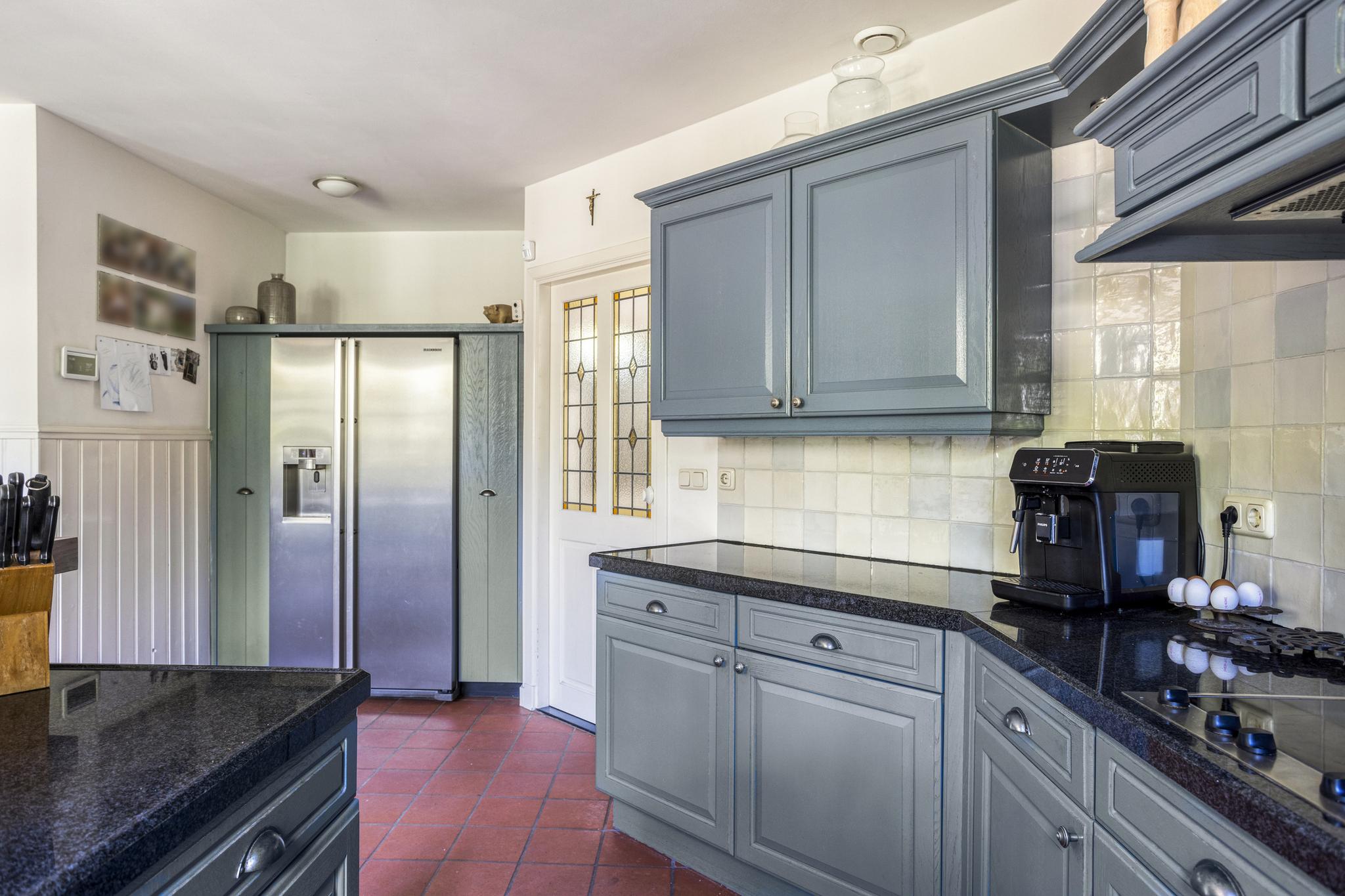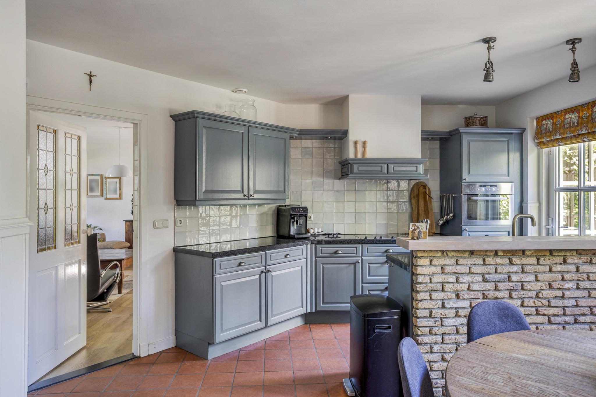 Aan de achterzijde van de woning is de woonkeuken gelegen. Deze is bereikbaar vanuit de woonkamer. De keuken is voorzien van diverse boven- en onderkasten en heeft een hardstenen werkblad met een ingebouwde RVS-spoelbak. Er is een Howat kokend waterkraan aanwezig, zodat u op ieder moment naast koud- en warmwater ook over kokend water beschikt. Verder is de keuken uitgerust met een keramische kookplaat met afzuigkap, een ingebouwde vaatwasser en een combi oven/magnetron. Er is een zogenaamde Amerikaanse koelkast met vriesgedeelte en ijsmachine aanwezig. In de keuken is ook de toegang tot de kelder (2.38 x 3.38 m). Deze ook voorzien van een wandcontactdoos. Vanuit de keuken ga je naar de achtertuin. Ook zijn vanuit hier het kantoor aan de voorzijde van de woning bereikbaar als ook de bijkeuken.